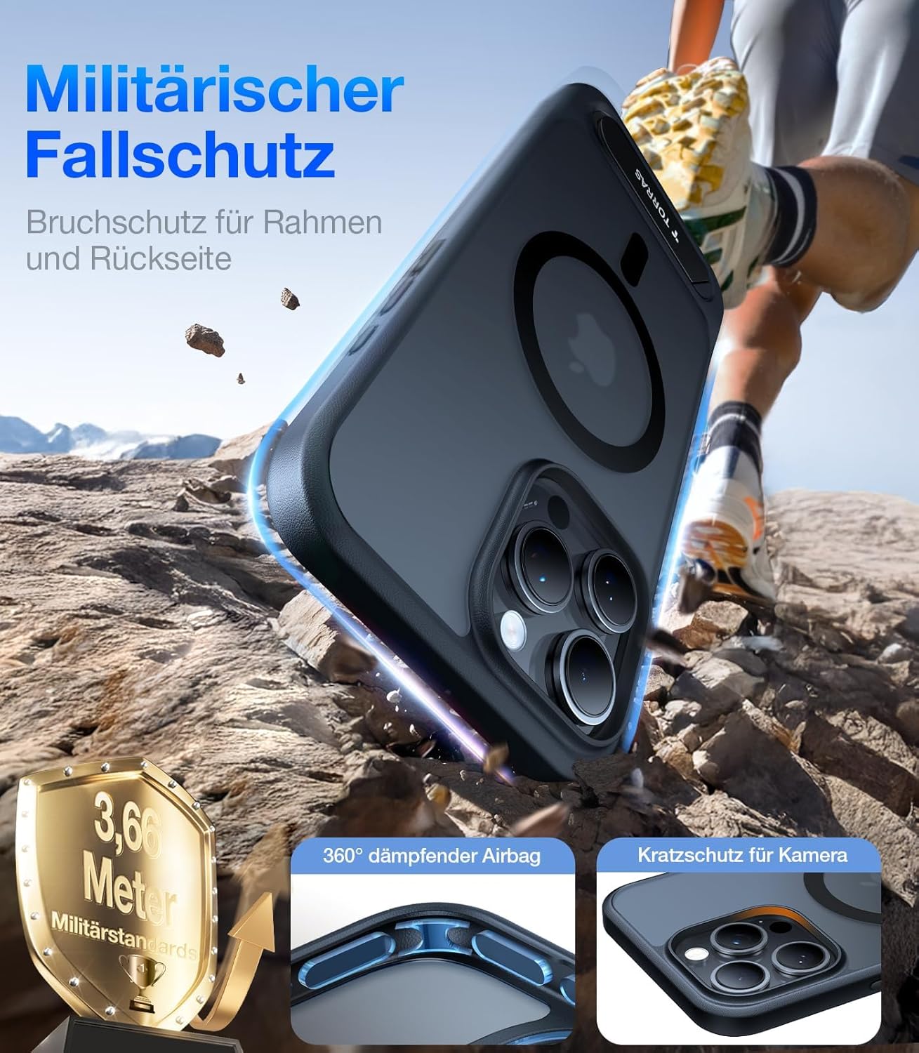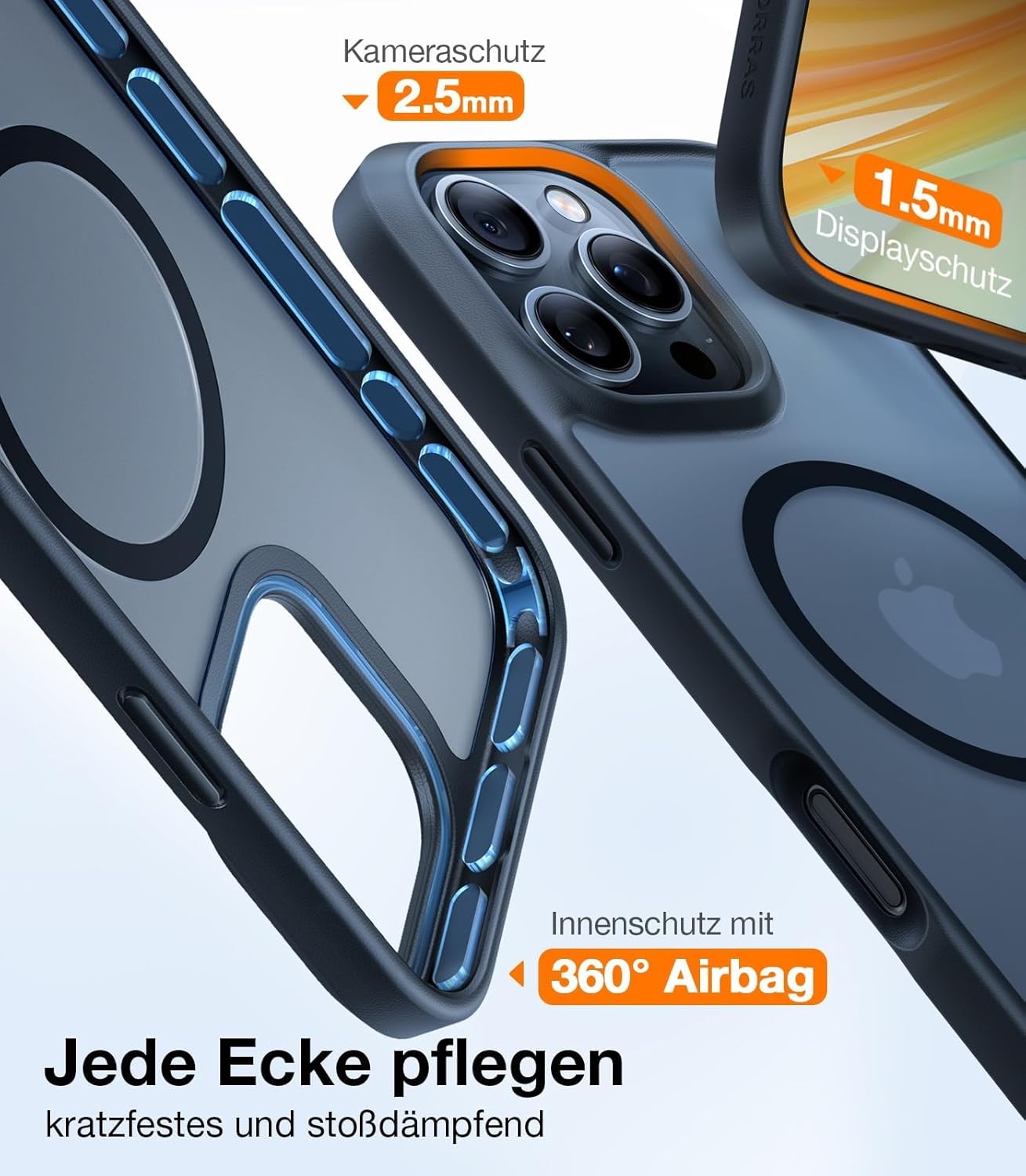 • Само магнити? Не - Магнитен с пълна функционалност. Дизайнът на магнитния пръстен пасва 1:1 на оригиналния магнитен пръстен на iPhone и е оборудван с патентованата система от магнити TORRAS Halbach, както и със силни магнити N52. Така че калъфът за мобилен телефон за iPhone 17 Pro се залепва здраво към оригинални магнитни аксесоари като държачи за кола, външни батерии или зарядни устройства, здраво задържащ, щадящ батерията. Бързо зареждане: Няма проблем - стабилно прилягане, без забавяне.