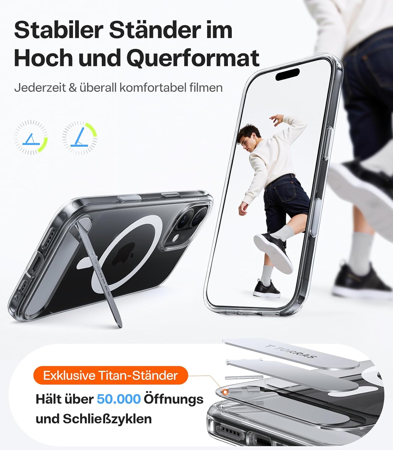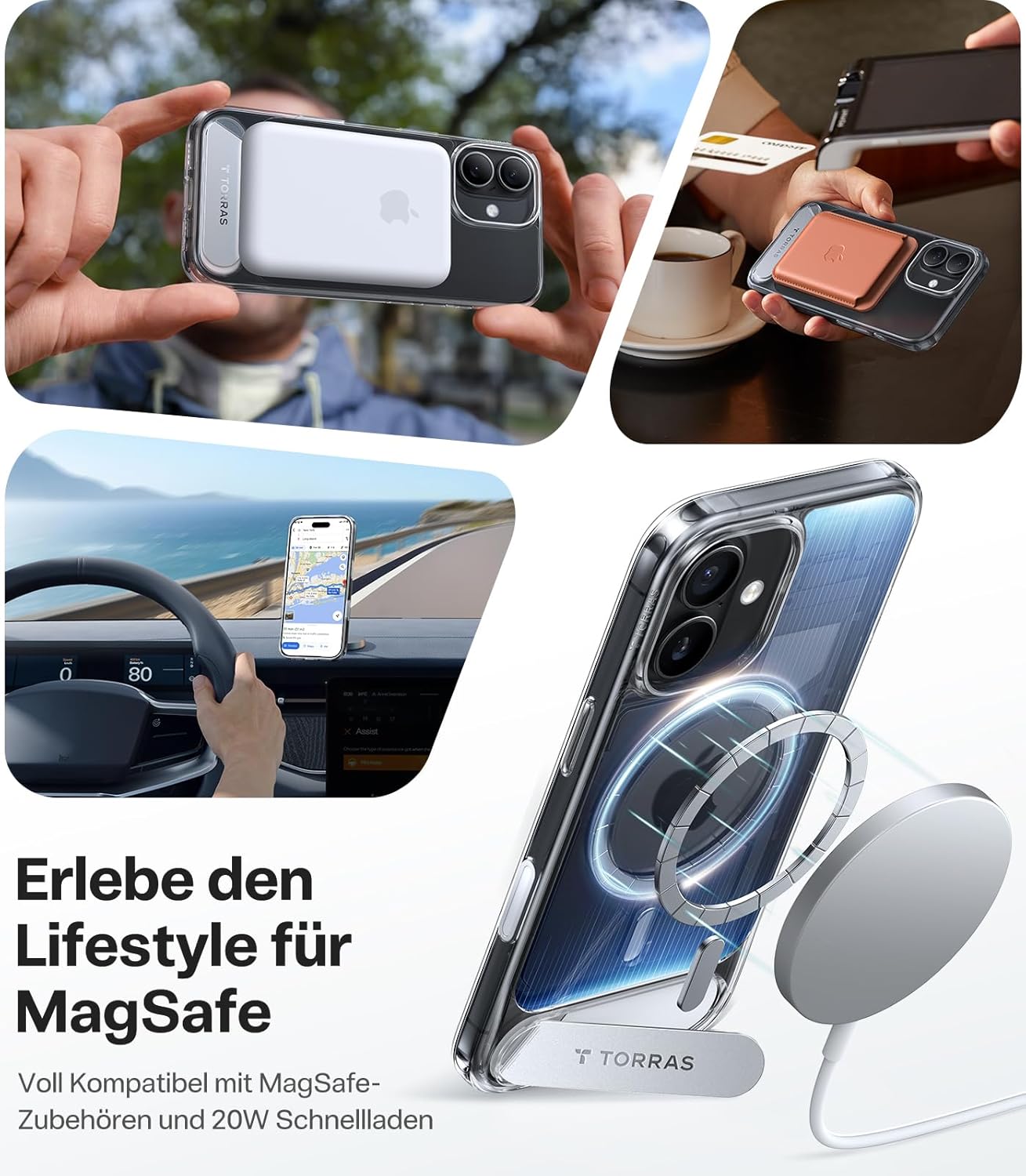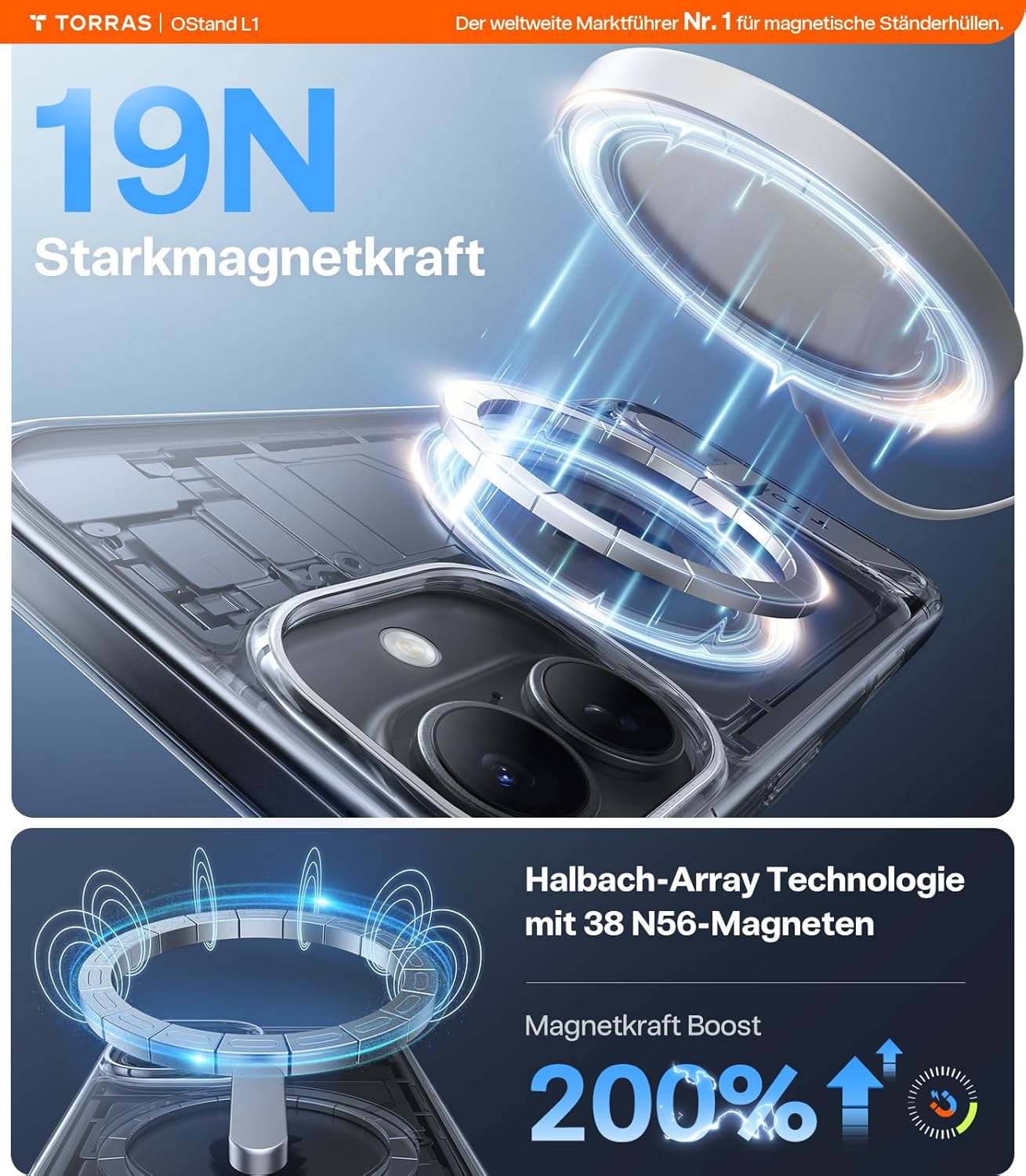 • Само магнити? Не - Магнитен с пълна функционалност. Дизайнът на магнитния пръстен пасва 1:1 на оригиналния магнитен пръстен на iPhone и е оборудван с патентованата система от магнити TORRAS Halbach, както и със силни магнити N52. Така че калъфът за мобилен телефон за iPhone 17 Pro се залепва здраво към оригинални магнитни аксесоари като държачи за кола, външни батерии или зарядни устройства, здраво задържащ, щадящ батерията. Бързо зареждане: Няма проблем - стабилно прилягане, без забавяне.