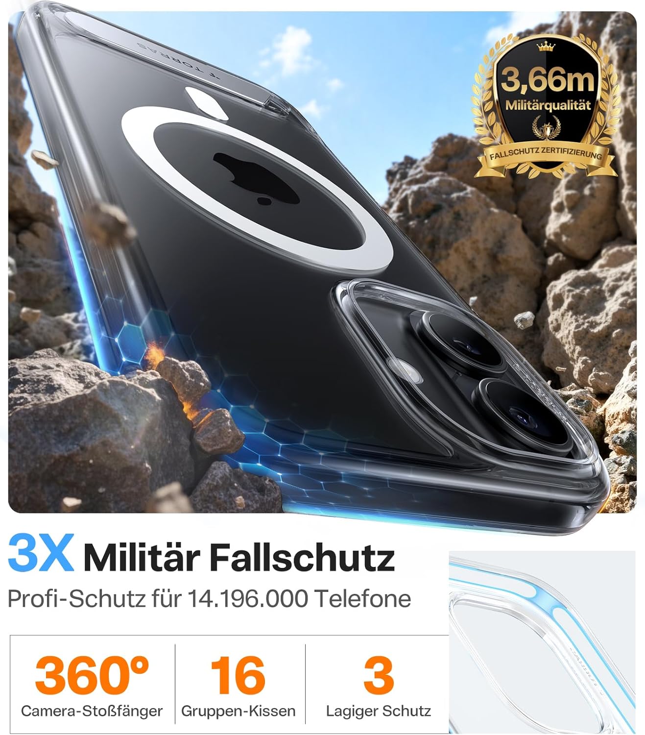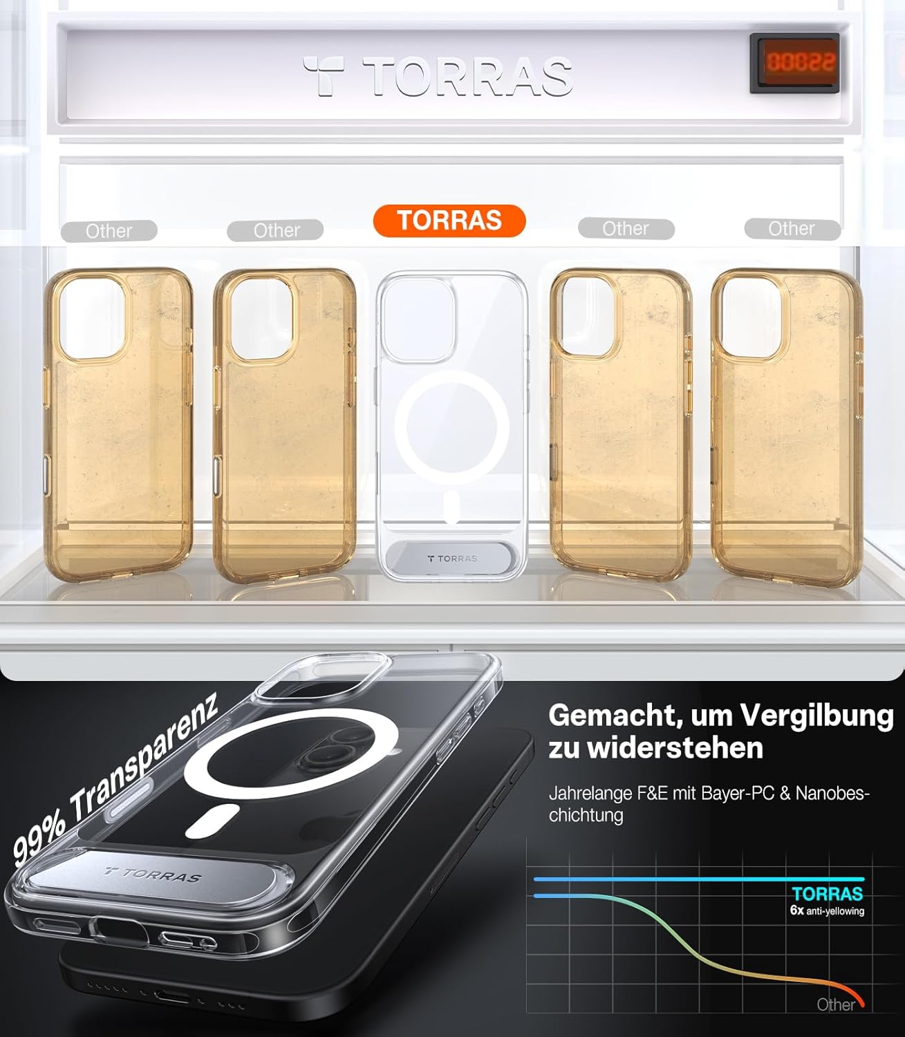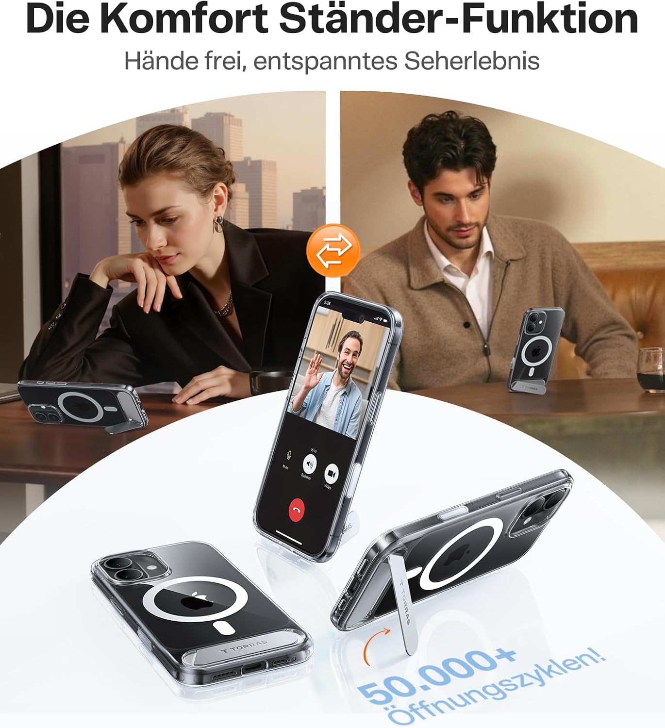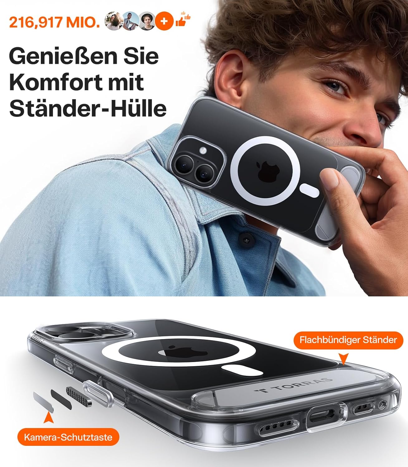 • Само магнити? Не - Магнитен с пълна функционалност. Дизайнът на магнитния пръстен пасва 1:1 на оригиналния магнитен пръстен на iPhone и е оборудван с патентованата система от магнити TORRAS Halbach, както и със силни магнити N52. Така че калъфът за мобилен телефон за iPhone 17 Pro се залепва здраво към оригинални магнитни аксесоари като държачи за кола, външни батерии или зарядни устройства, здраво задържащ, щадящ батерията. Бързо зареждане: Няма проблем - стабилно прилягане, без забавяне.