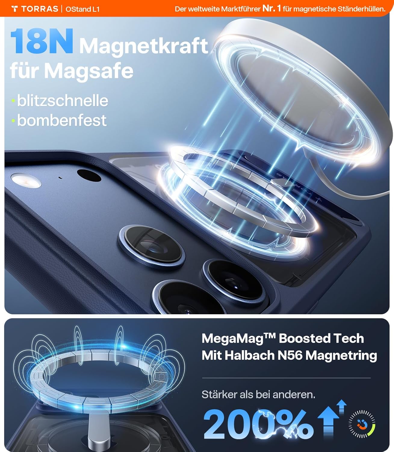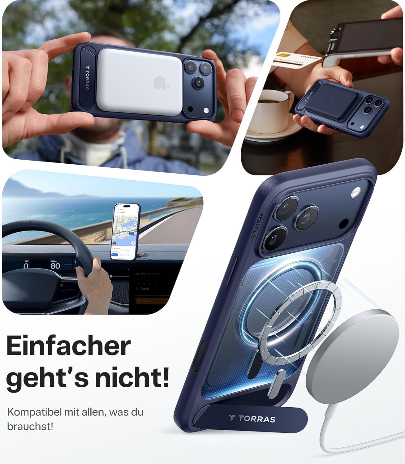 • Само магнити? Не - Магнитен с пълна функционалност. Дизайнът на магнитния пръстен пасва 1:1 на оригиналния магнитен пръстен на iPhone и е оборудван с патентованата система от магнити TORRAS Halbach, както и със силни магнити N52. Така че калъфът за мобилен телефон за iPhone 17 Pro се залепва здраво към оригинални магнитни аксесоари като държачи за кола, външни батерии или зарядни устройства, здраво задържащ, щадящ батерията. Бързо зареждане: Няма проблем - стабилно прилягане, без забавяне.