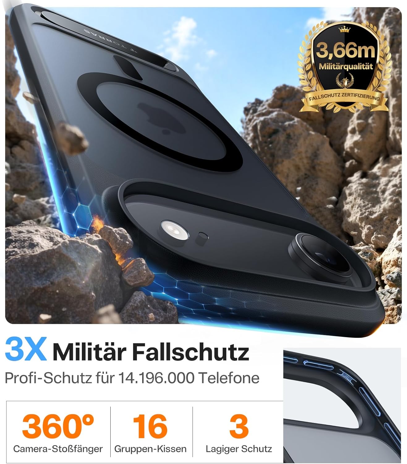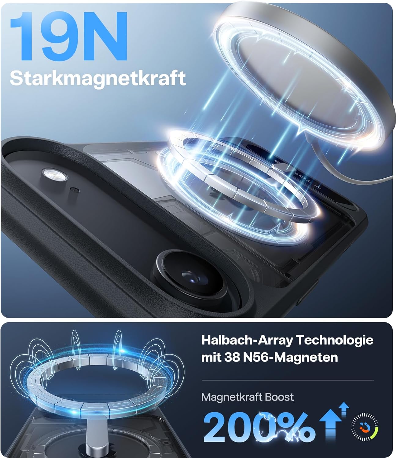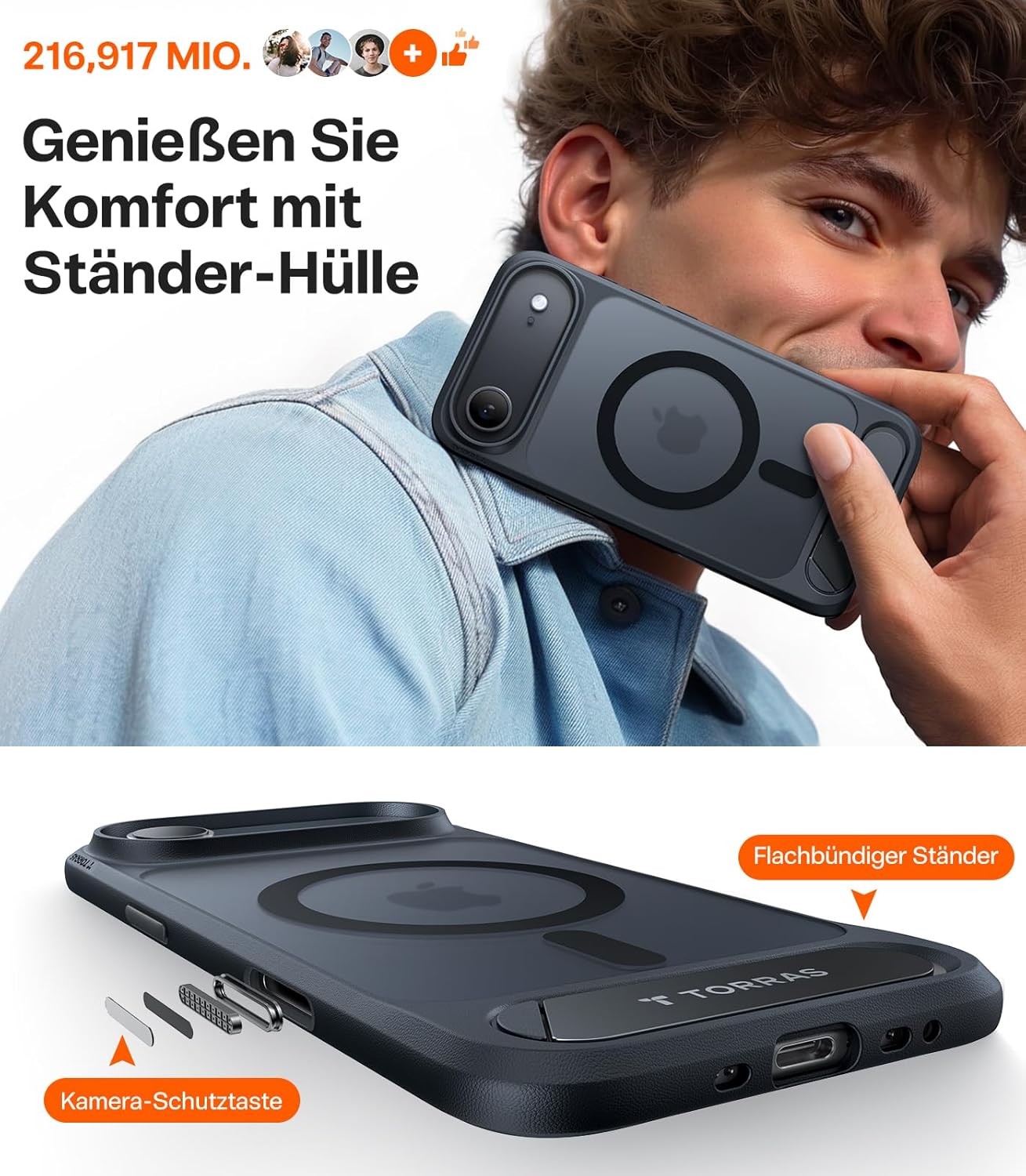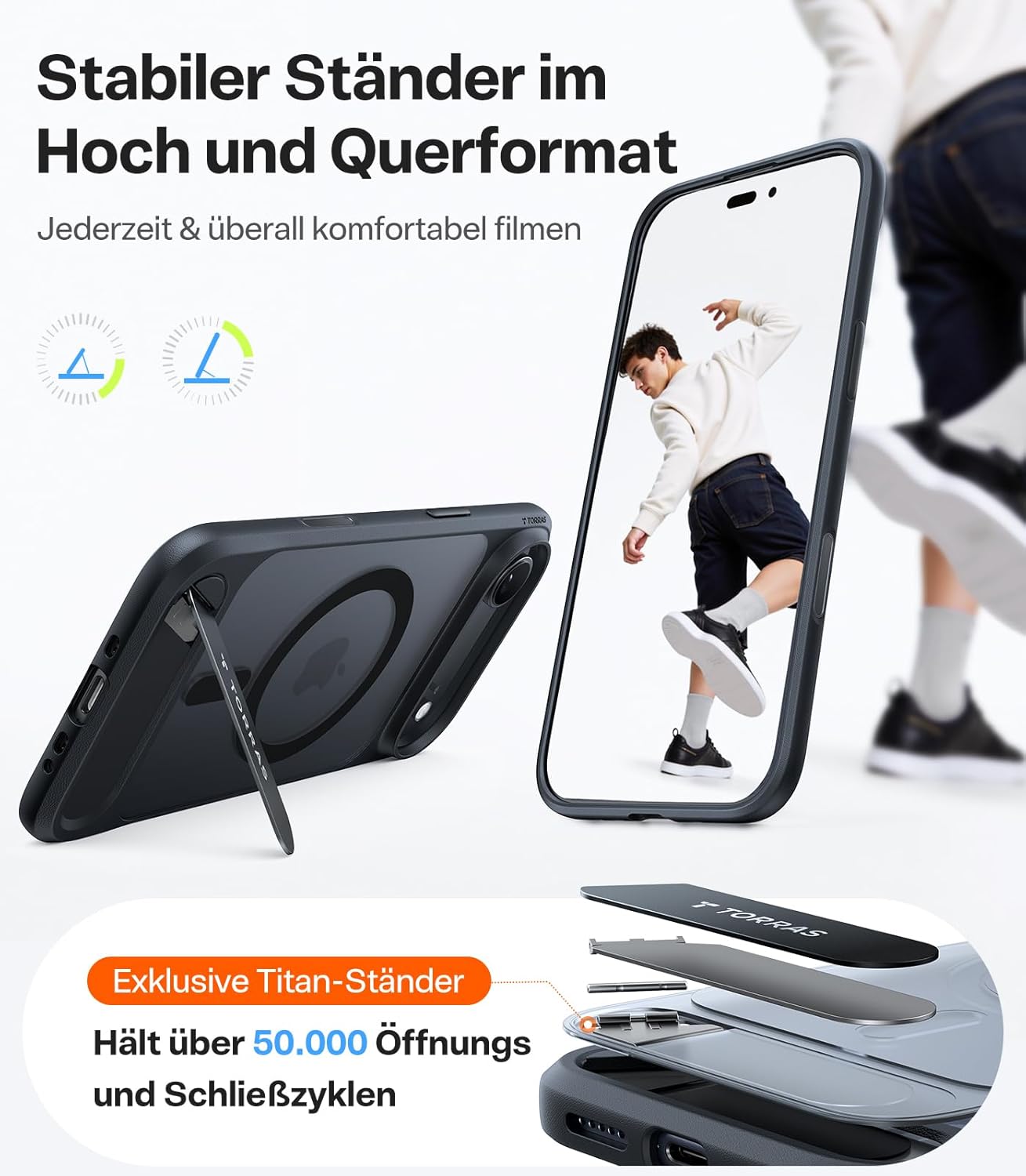• Само магнити? Не - Магнитен с пълна функционалност. Дизайнът на магнитния пръстен пасва 1:1 на оригиналния магнитен пръстен на iPhone и е оборудван с патентованата система от магнити TORRAS Halbach, както и със силни магнити N52. Така че калъфът за мобилен телефон за iPhone 17 Pro се залепва здраво към оригинални магнитни аксесоари като държачи за кола, външни батерии или зарядни устройства, здраво задържащ, щадящ батерията. Бързо зареждане: Няма проблем - стабилно прилягане, без забавяне.