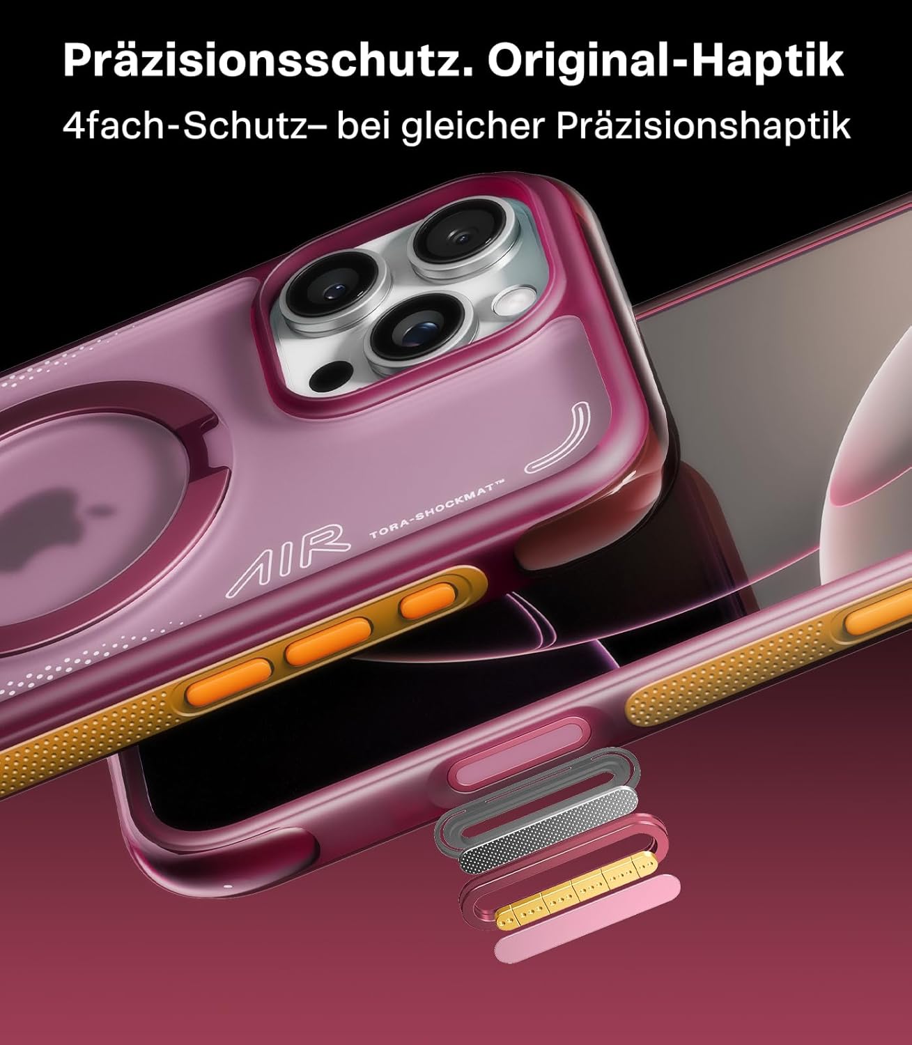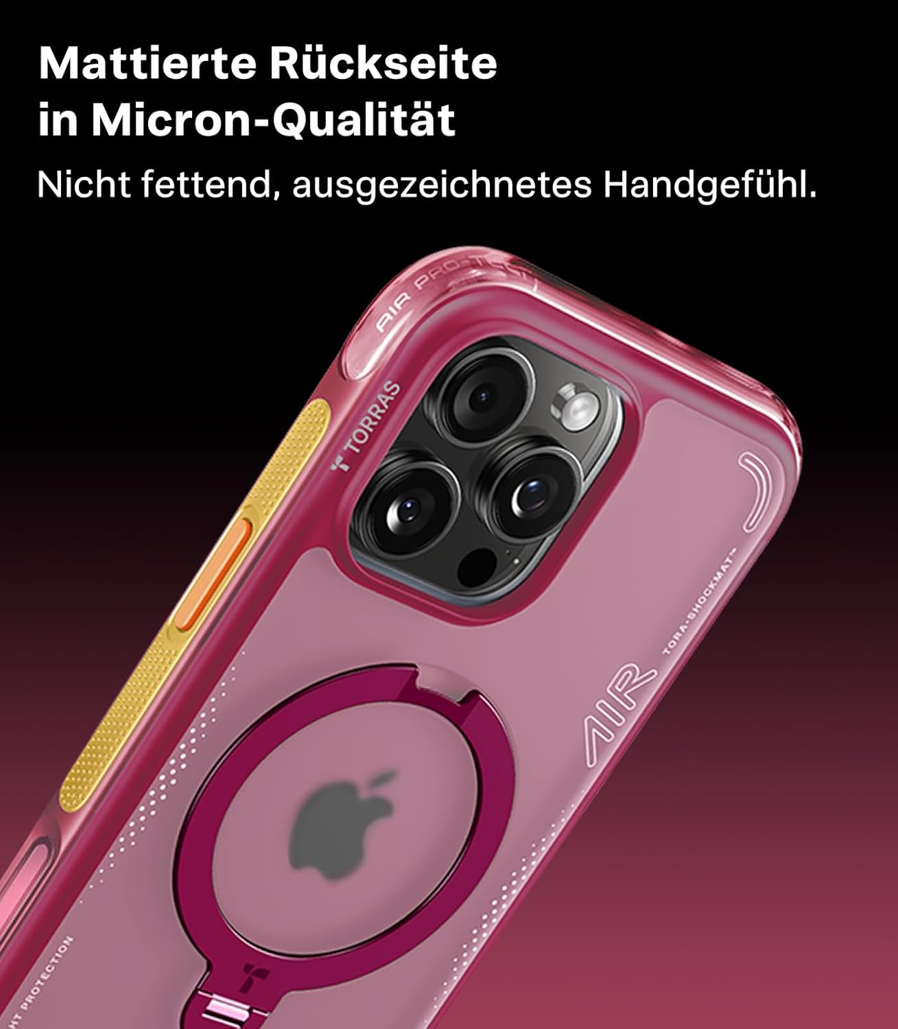 TORRAS Ostand Q3 Air калъф за iPhone 16 Pro, с истински въздушни възглавници, най-висока военна защита, 360° магнитна здрава стойка, матов, с управление на камерата, бутон, червен