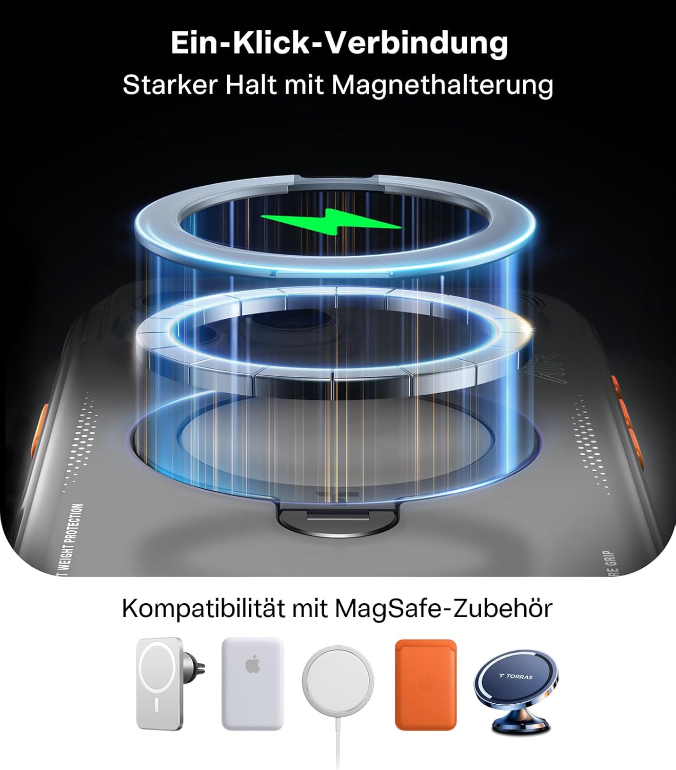 • Затворено: Силен магнитен пръстен, бързо зареждане: Невидим О-пръстен с вграден магнит, изработен от най-добрия материал N56 с технология Halbach, той осигурява силна магнитна сила от 18 N за превъзходна здравина и стабилност. Лесно свържете калъфа си към стойката за кола MagSafe за стабилна навигация. Насладете се на безпроблемна и сигурна връзка!