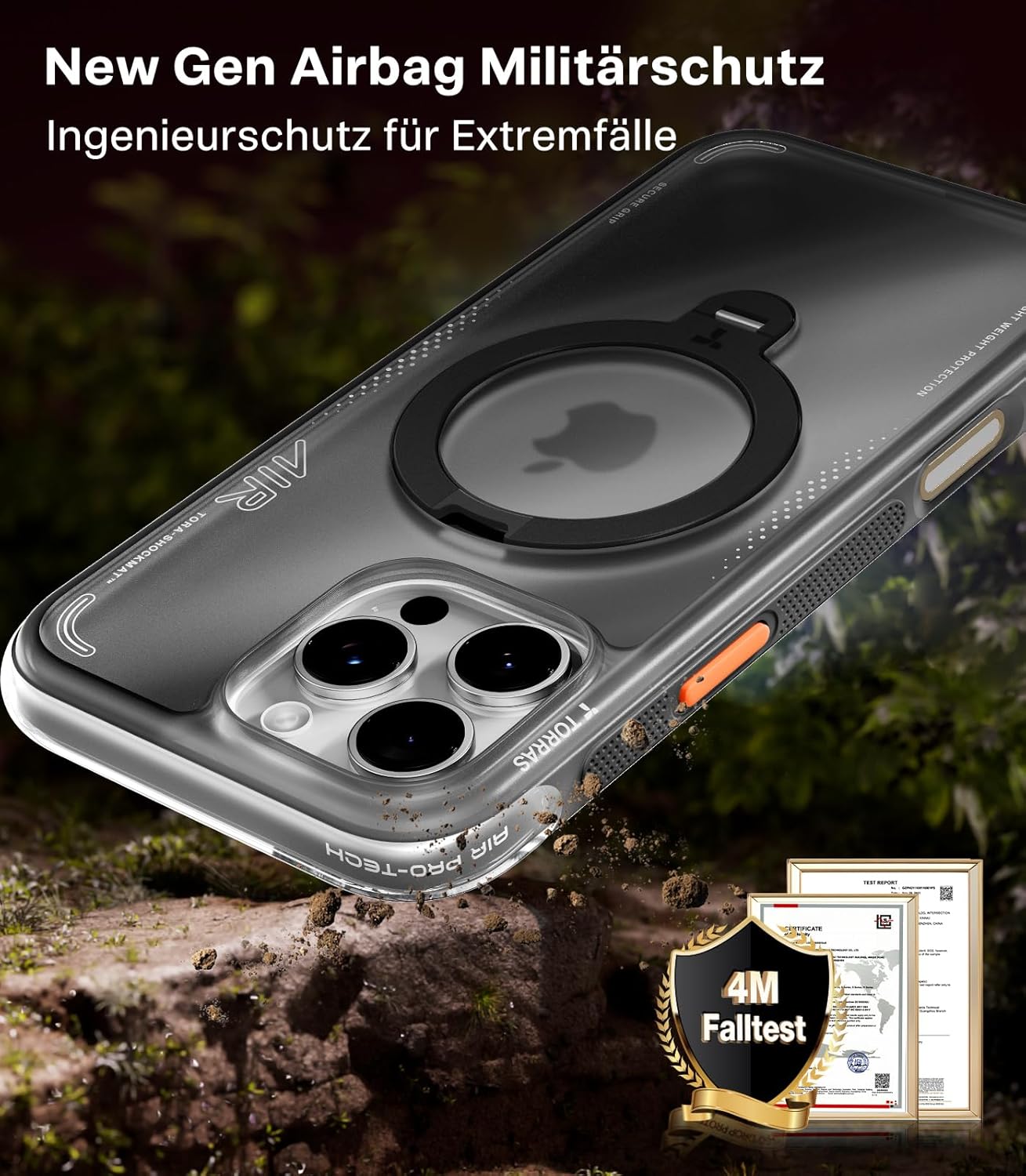 TORRAS Ostand Q3 Air калъф за телефон за iPhone 16 Pro Max, с истински въздушни възглавници, двойна защита, 360° магнитна здрава стойка, матов, с управление на камерата, бутон, черен