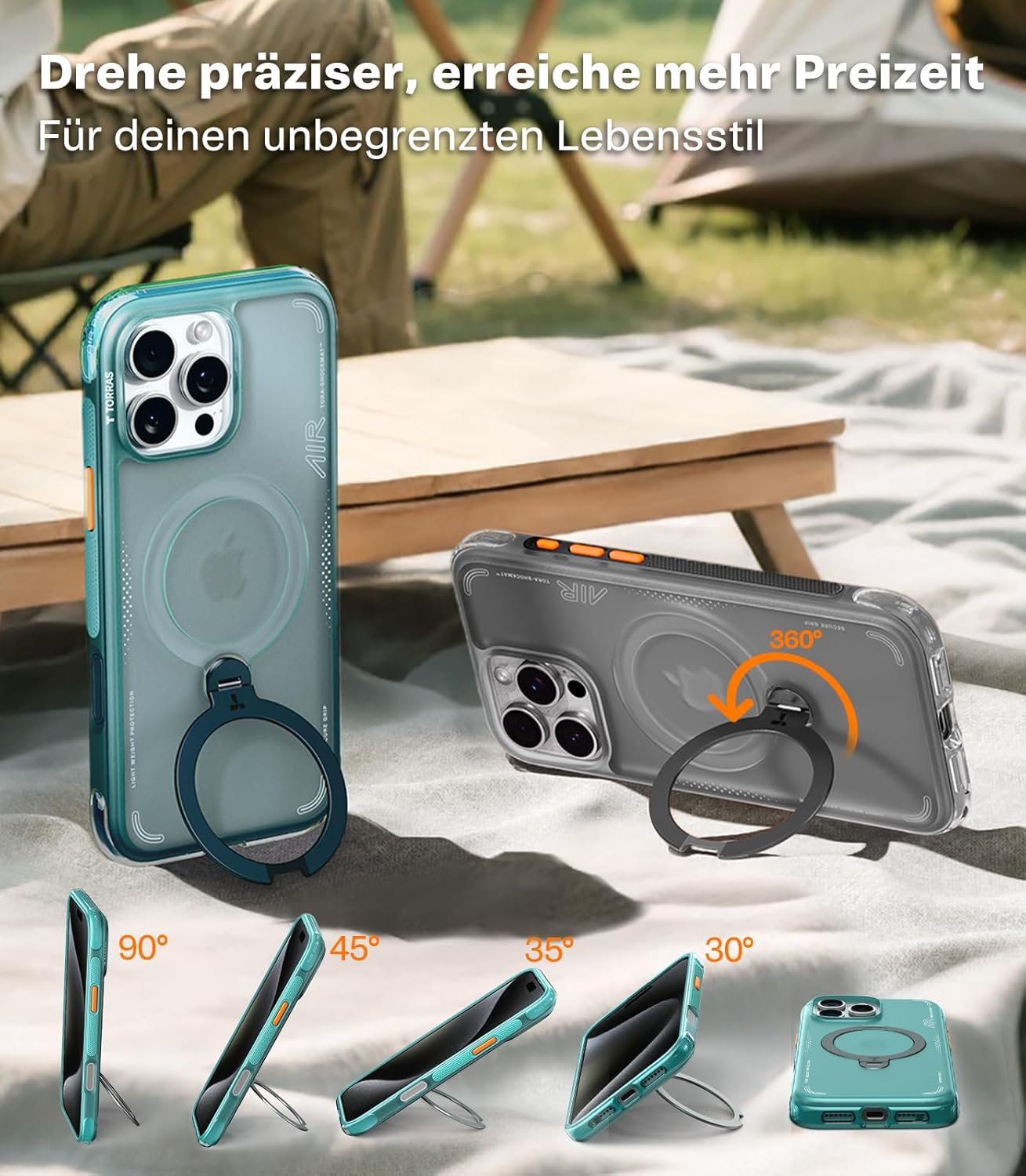 • [360-градусов пръстен за стойка: Стабилизиран за всеки желан ъгъл: Завъртането осигурява 360° завъртане и четириточково позициониране за най-стабилен ъгъл. С максимална гъвкавост можете да регулирате хоризонталния ъгъл от 15° до 160° и вертикалния от 30° до 92°. Независимо дали провеждате видеоконференции или дълги разговори, калъфът може лесно да се регулира до желания ъгъл за максимален комфорт в свободното време и по-голяма ефективност на работа.]