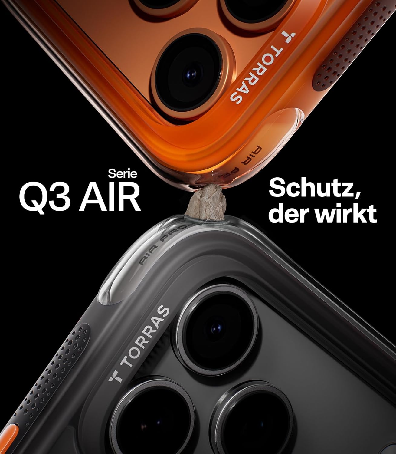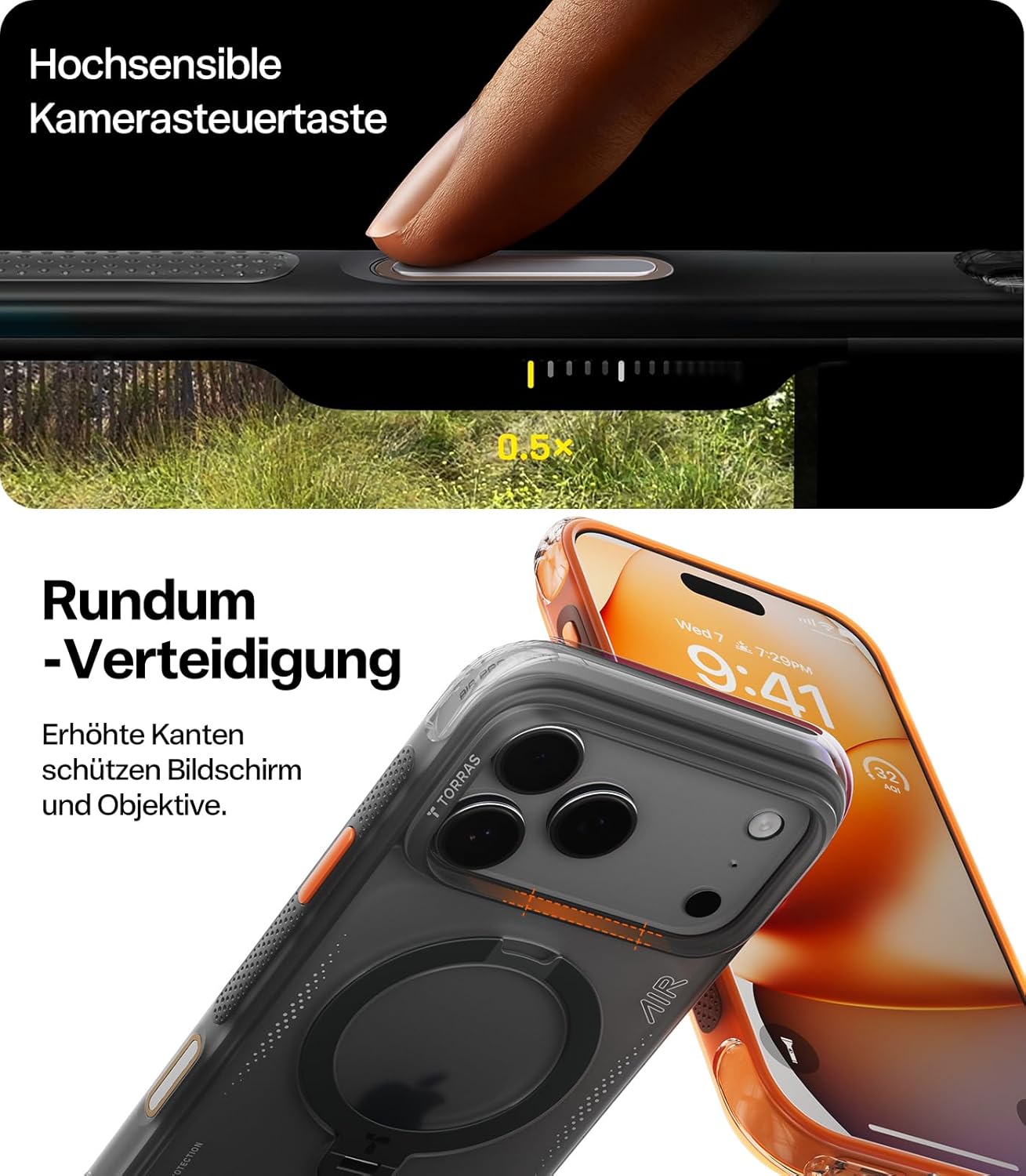 TORRAS Ostand Q3 Air калъф за телефон за iPhone 17 Pro Max, с истински въздушни възглавници, двойна защита, 360° магнитна здрава стойка, матов, с управление на камерата, бутон, черен