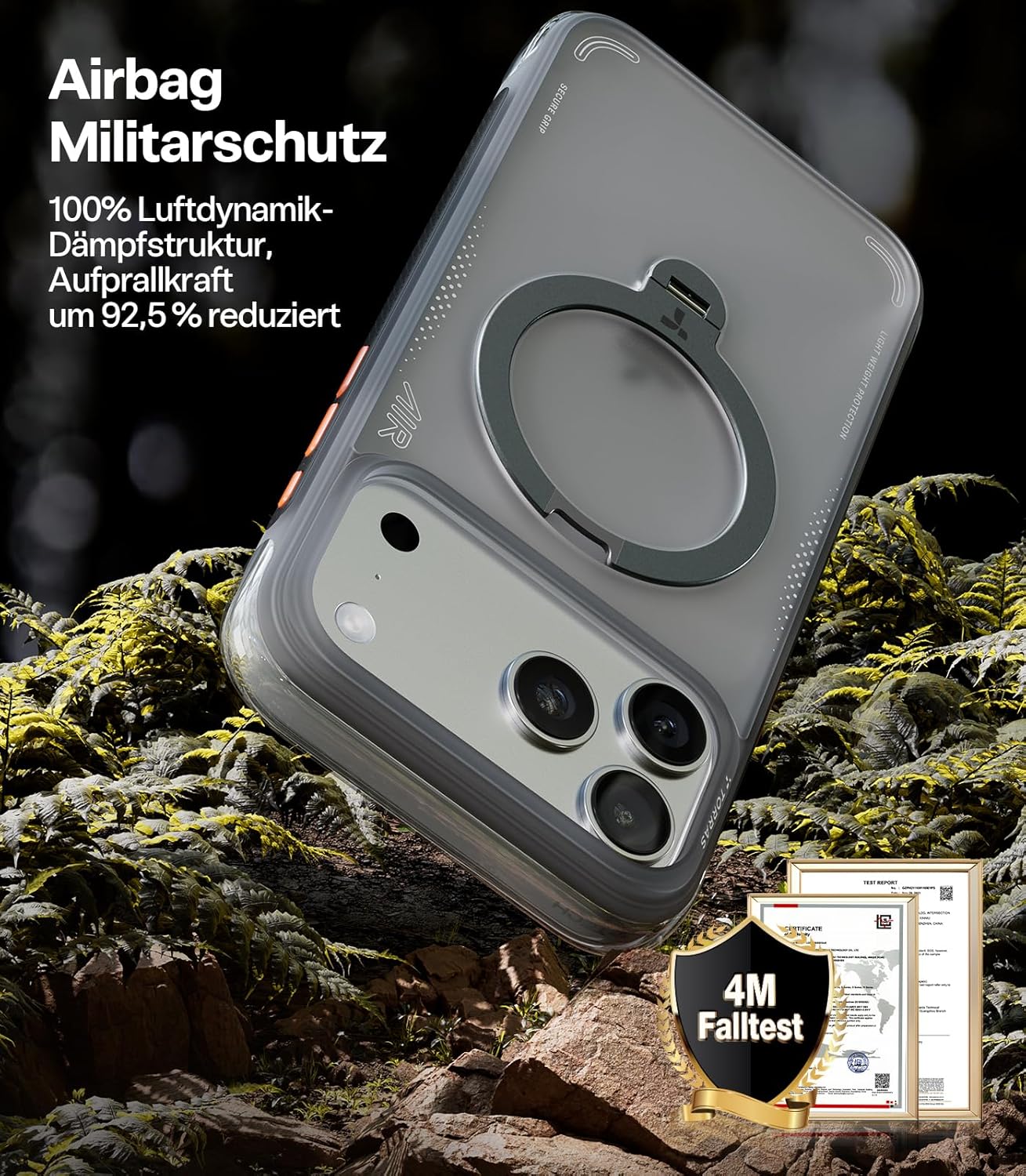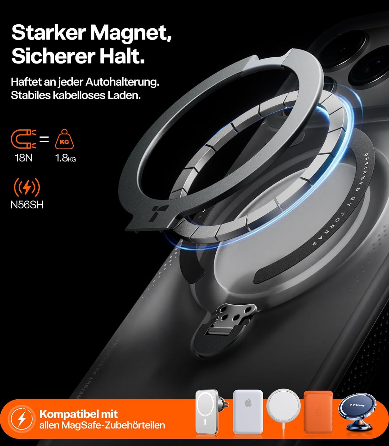 • Затворено: Силен магнитен пръстен, бързо зареждане: Невидим О-пръстен с вграден магнит, изработен от най-добрия материал N56 с технология Halbach, той осигурява силна магнитна сила от 18 N за превъзходна здравина и стабилност. Лесно свържете калъфа си към стойката за кола MagSafe за стабилна навигация. Насладете се на безпроблемна и сигурна връзка!