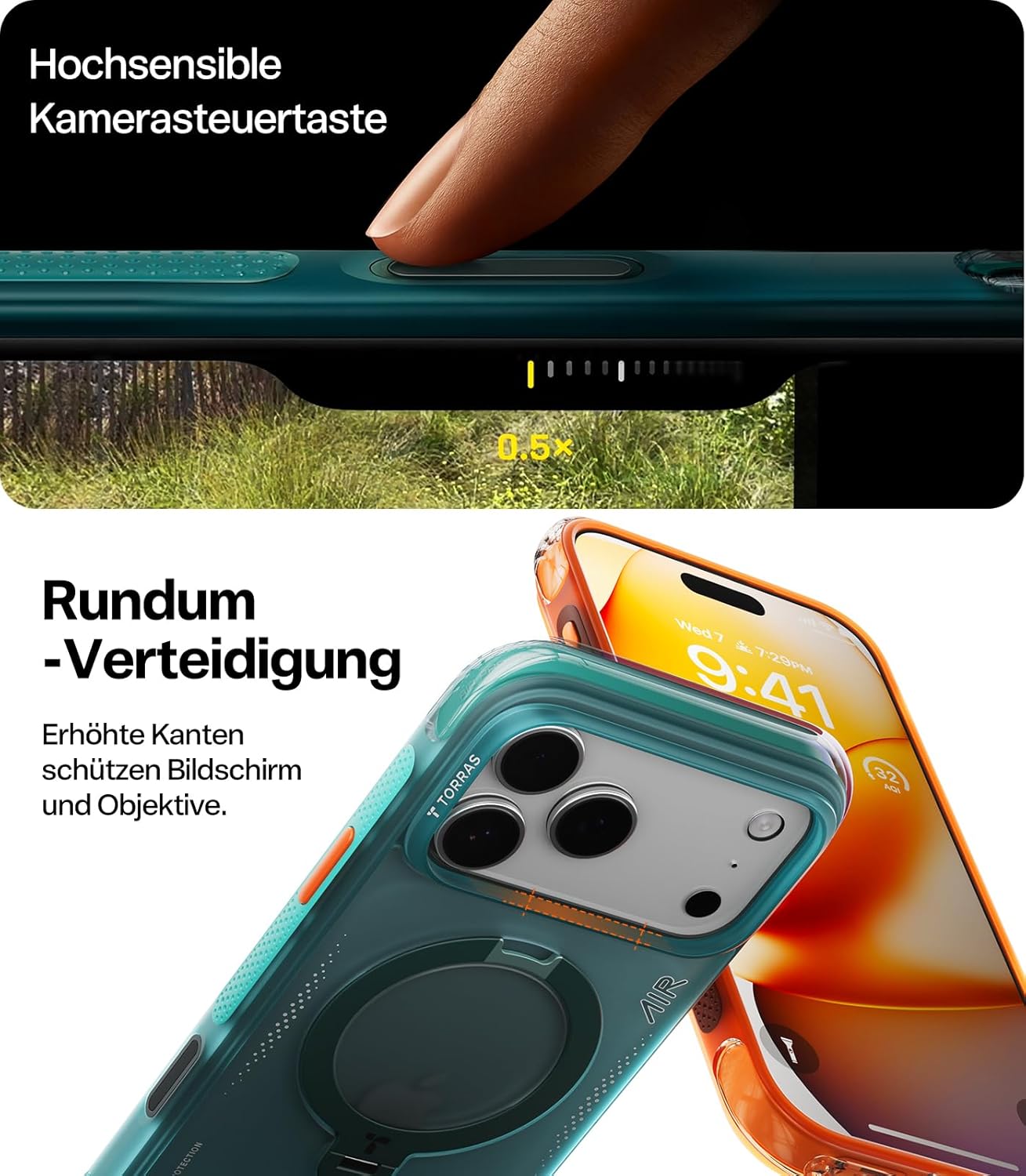 TORRAS Ostand Q3 Air калъф за телефон за iPhone 17 Pro Max, с истински въздушни възглавници, двойна защита, 360° магнитна здрава стойка, матов, с управление на камерата, бутон, ледников, син
