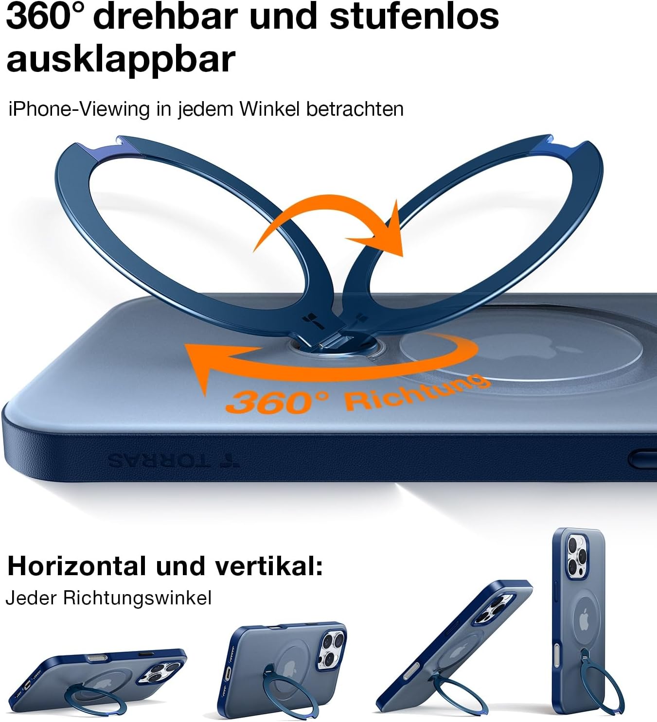 • [360-градусов пръстен за стойка: Стабилизиран за всеки желан ъгъл: Завъртането осигурява 360° завъртане и четириточково позициониране за най-стабилен ъгъл. С максимална гъвкавост можете да регулирате хоризонтално изгледа от 15° до 160° и вертикално от 30° до 90°. Независимо дали гледате видеоконференции или провеждате дълги телефонни разговори, калъфът за iPhone 17 Pro може лесно да се регулира до желания ъгъл и по този начин осигурява максимален комфорт в свободното време и по-голяма ефективност на работното място.]