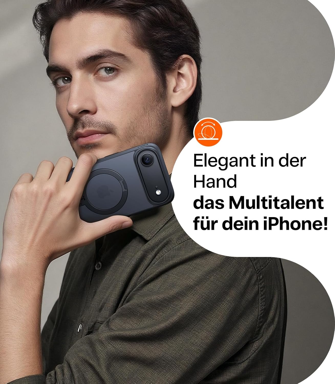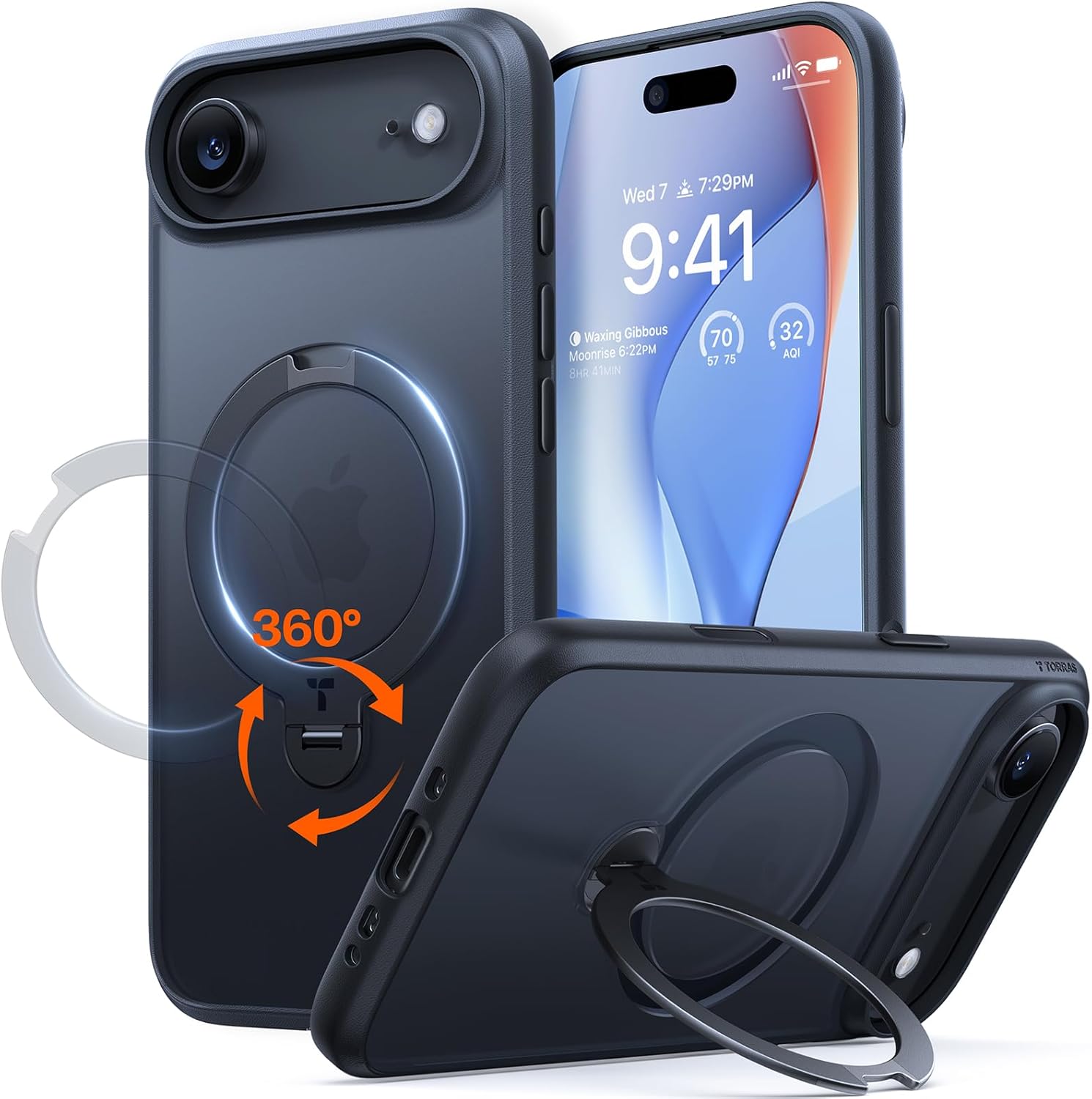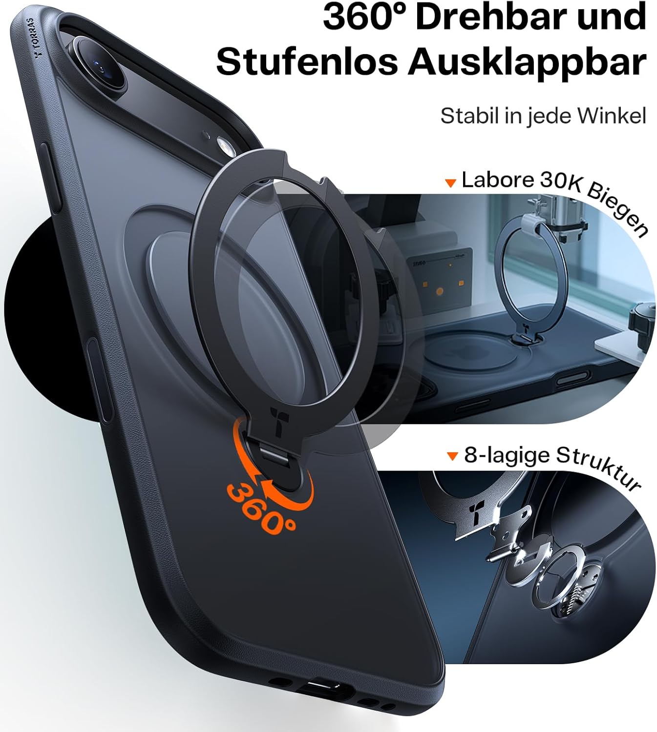 • [360-градусов пръстен за стойка: Стабилизиран за всеки желан ъгъл: Завъртането осигурява 360° завъртане и четириточково позициониране за най-стабилен ъгъл. С максимална гъвкавост можете да регулирате хоризонтално изгледа от 15° до 160° и вертикално от 30° до 90°. Независимо дали гледате видеоконференции или провеждате дълги телефонни разговори, калъфът за iPhone 17 Pro може лесно да се регулира до желания ъгъл и по този начин осигурява максимален комфорт в свободното време и по-голяма ефективност на работното място.]