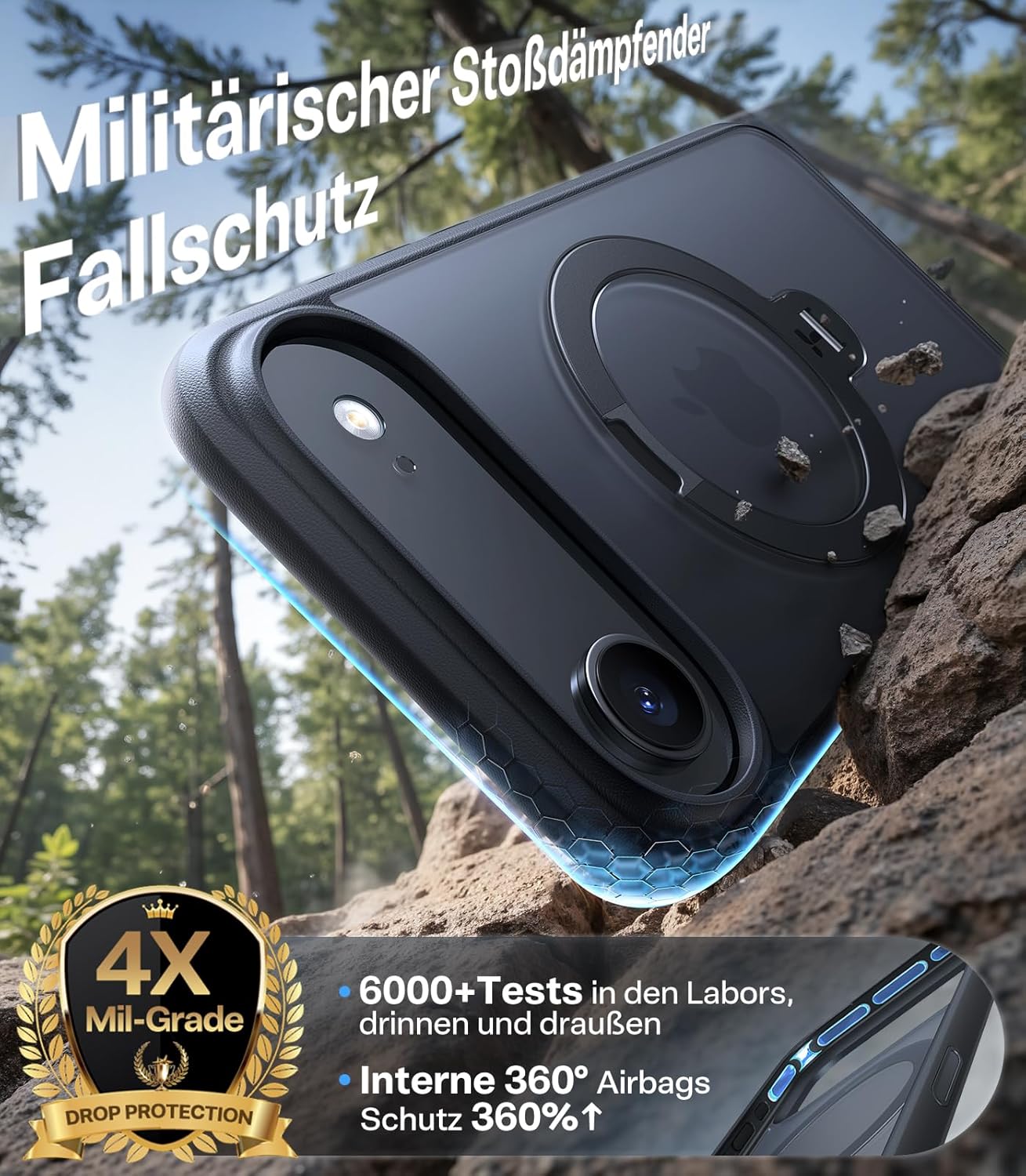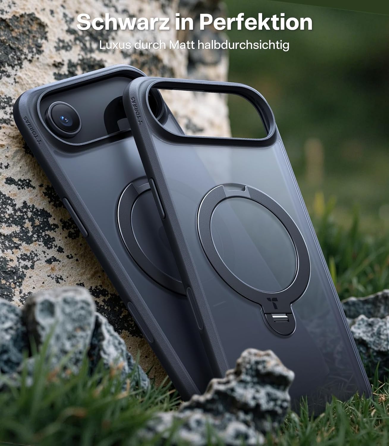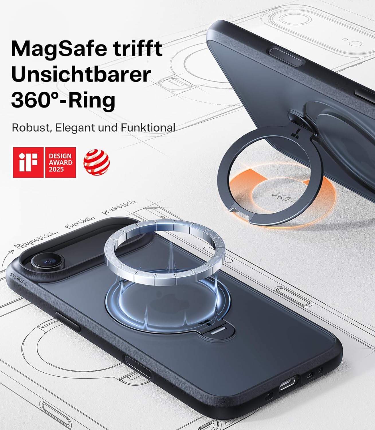 • [360-градусов пръстен за стойка: Стабилизиран за всеки желан ъгъл: Завъртането осигурява 360° завъртане и четириточково позициониране за най-стабилен ъгъл. С максимална гъвкавост можете да регулирате хоризонтално изгледа от 15° до 160° и вертикално от 30° до 90°. Независимо дали гледате видеоконференции или провеждате дълги телефонни разговори, калъфът за iPhone 17 Pro може лесно да се регулира до желания ъгъл и по този начин осигурява максимален комфорт в свободното време и по-голяма ефективност на работното място.]