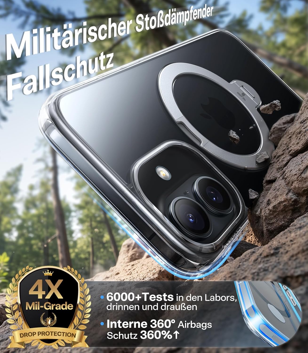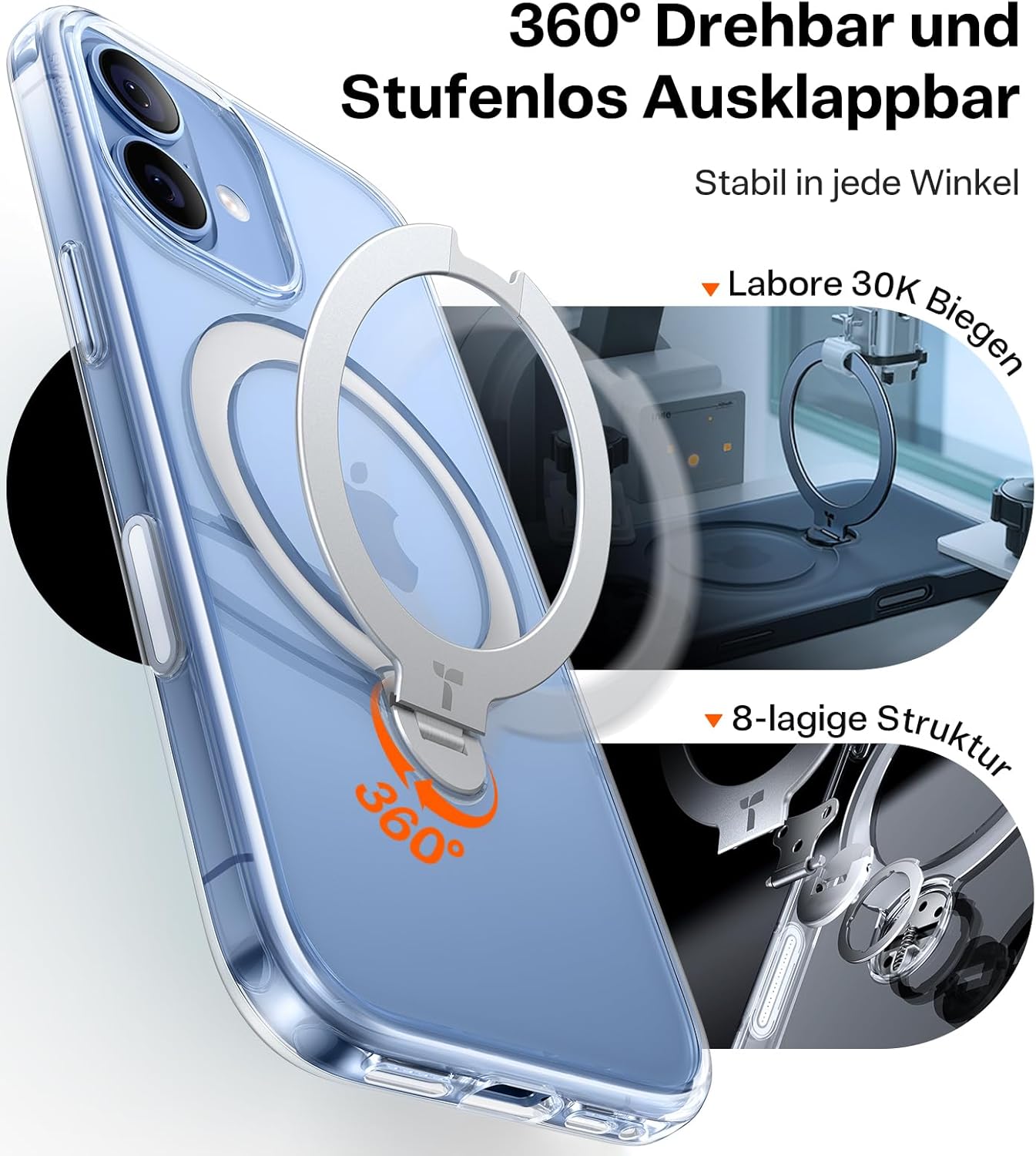 • [360-градусов пръстен за стойка: Стабилизиран за всеки желан ъгъл: Завъртането осигурява 360° завъртане и четириточково позициониране за най-стабилен ъгъл. С максимална гъвкавост можете да регулирате хоризонтално изгледа от 15° до 160° и вертикално от 30° до 90°. Независимо дали гледате видеоконференции или провеждате дълги телефонни разговори, калъфът за iPhone 17 Pro може лесно да се регулира до желания ъгъл и по този начин осигурява максимален комфорт в свободното време и по-голяма ефективност на работното място.]