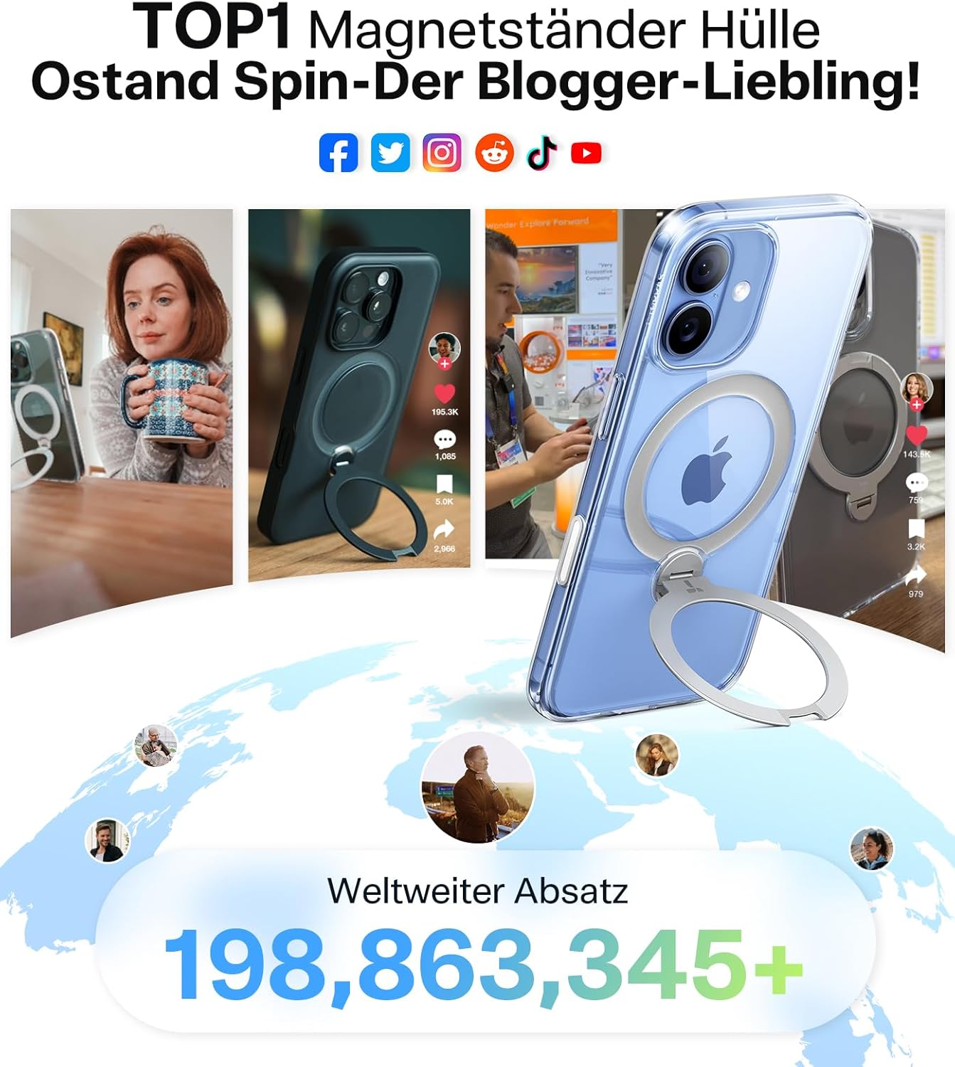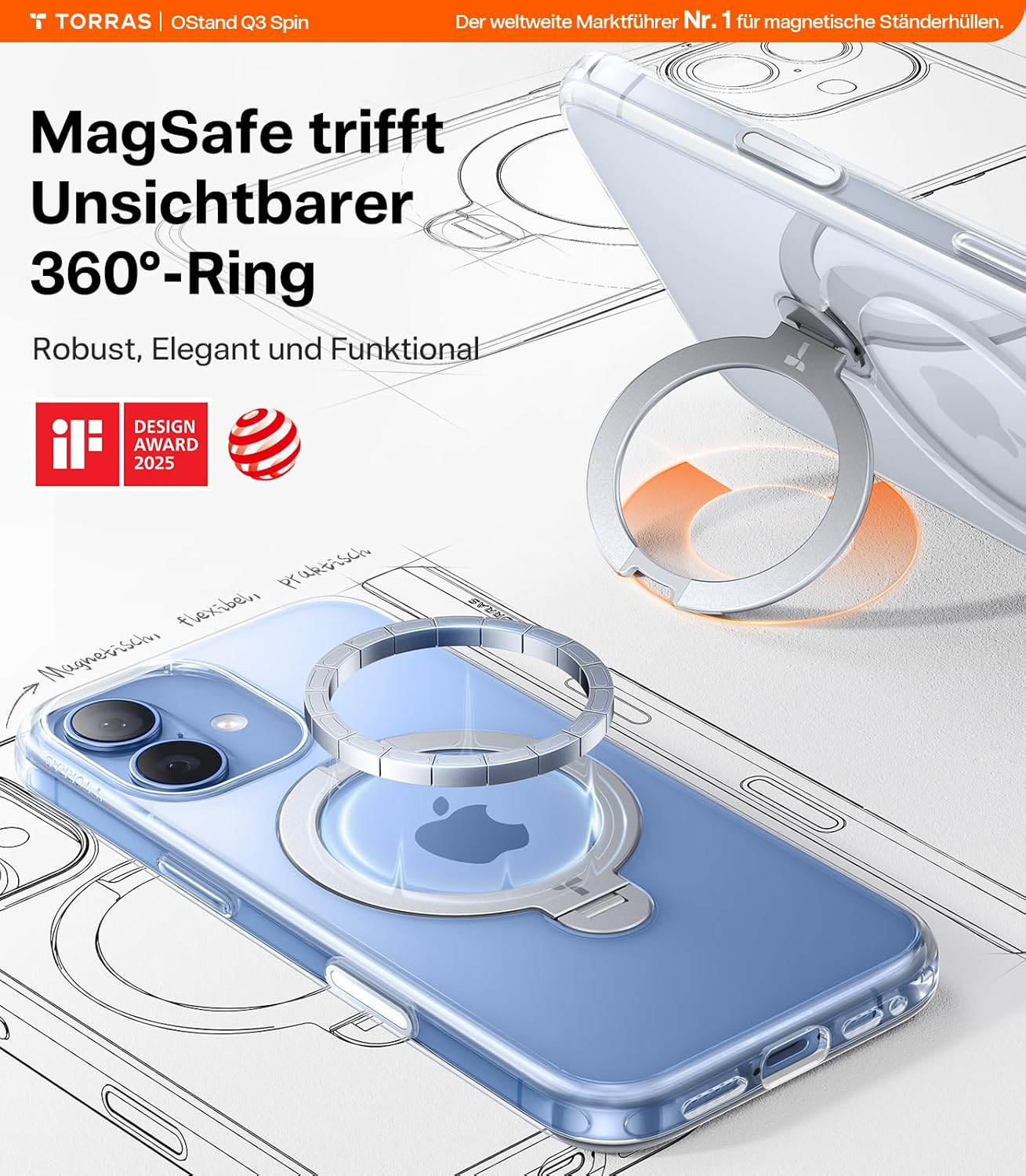 • Функционална, здрава и елегантна – всичко, което някога сте искали: TORRAS Ostand Q3 Spin е най-стабилната 360° стойка с нашата най-надеждна магнитна система за зареждане. Като лидер на пазара в интегрираните решения за магнитни стойки, ние непрекъснато насърчаваме иновациите. Нашият калъф за iPhone 17 Pro впечатлява с: Военно тествана защита от падане от височина 3,66 м; прецизна защита на бутоните на камерата; изключително силна магнитна функция; гъвкава, но напълно стабилна стойка.