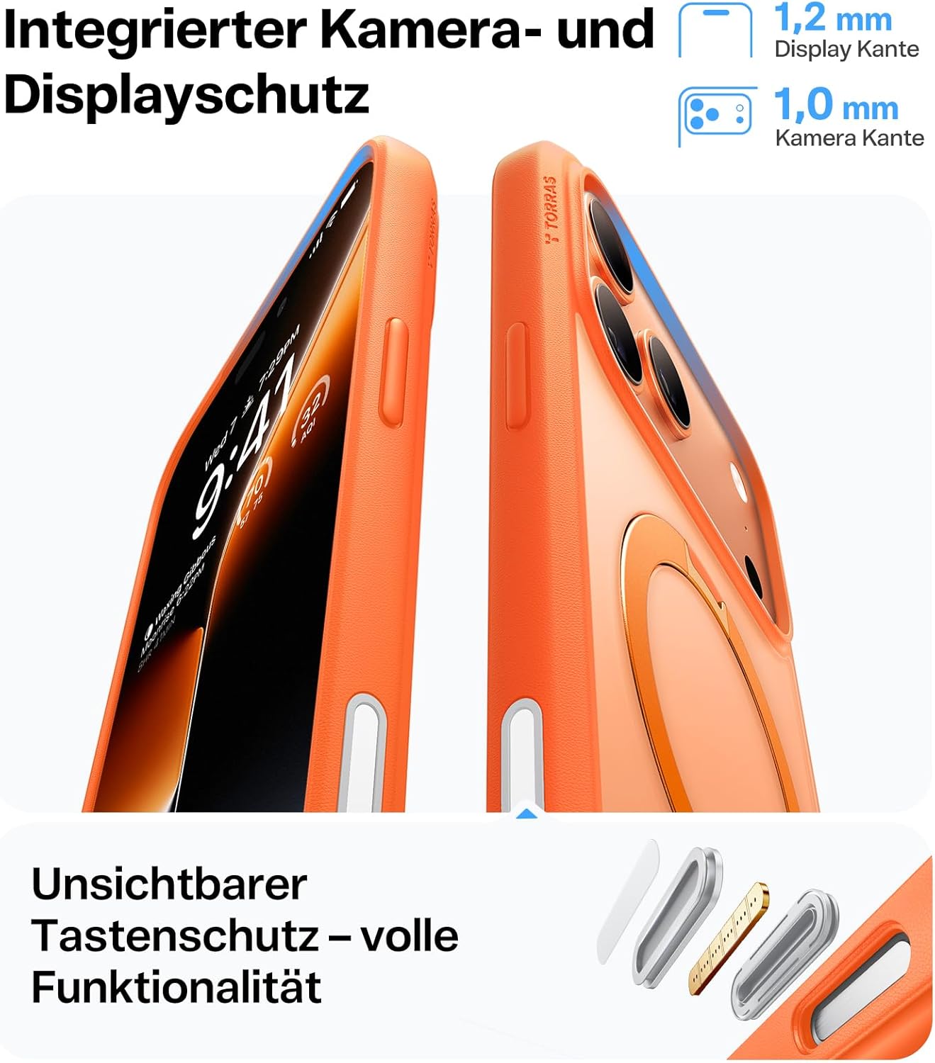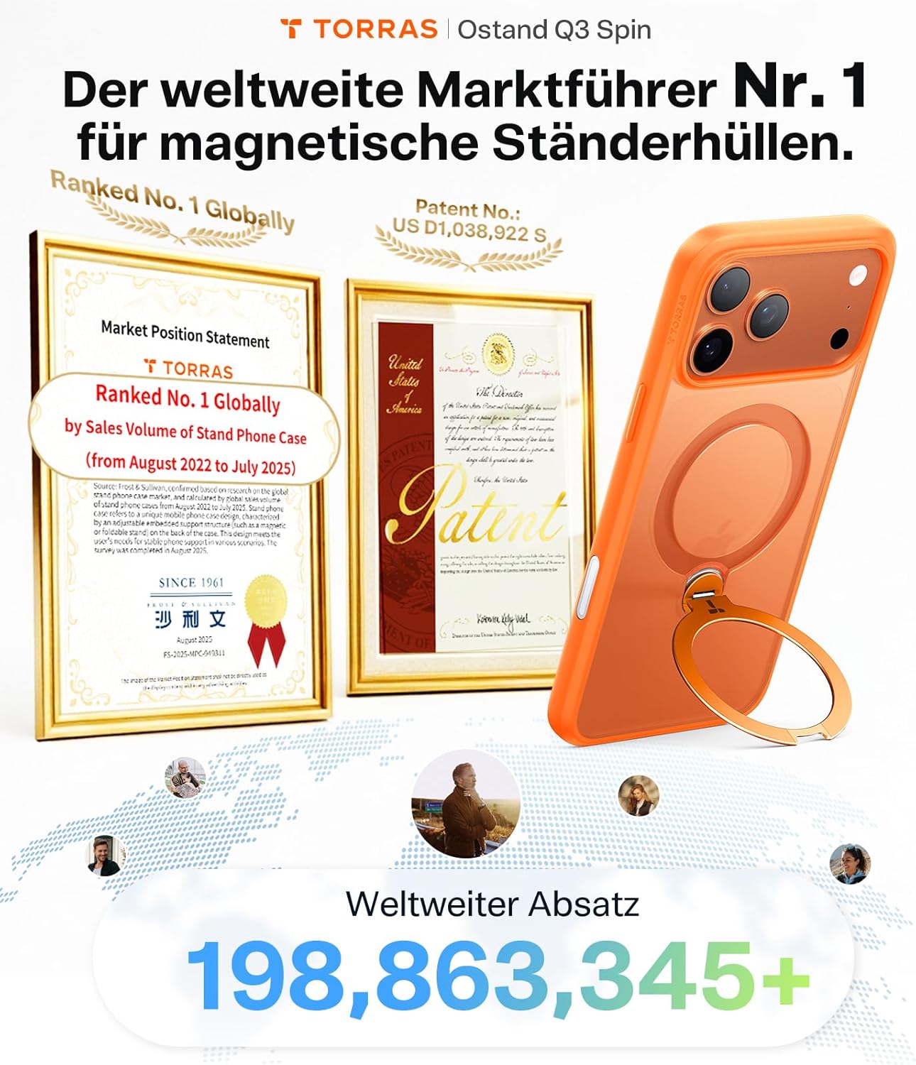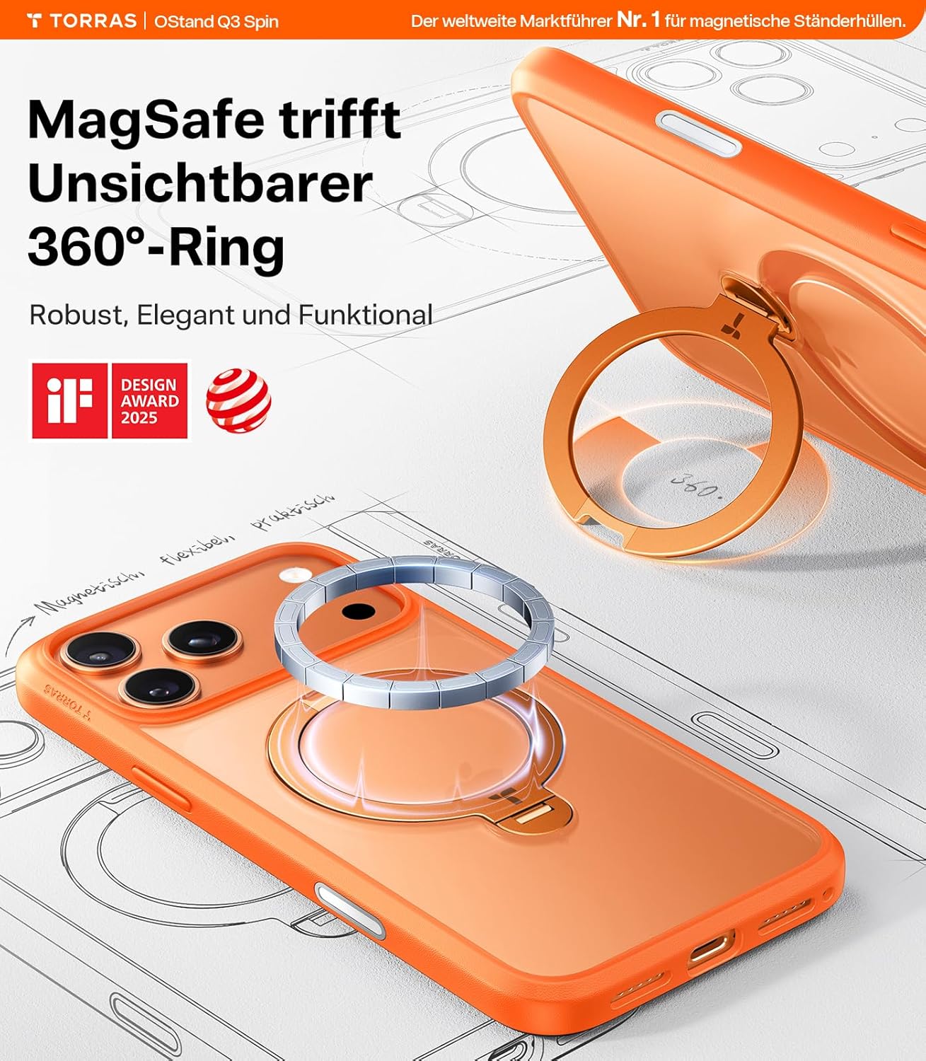 • Функционална, здрава и елегантна – всичко, което някога сте искали: TORRAS Ostand Q3 Spin е най-стабилната 360° стойка с нашата най-надеждна магнитна система за зареждане. Като лидер на пазара в интегрираните решения за магнитни стойки, ние непрекъснато насърчаваме иновациите. Нашият калъф за iPhone 17 Pro впечатлява с: Военно тествана защита от падане от височина 3,66 м; прецизна защита на бутоните на камерата; изключително силна магнитна функция; гъвкава, но напълно стабилна стойка.