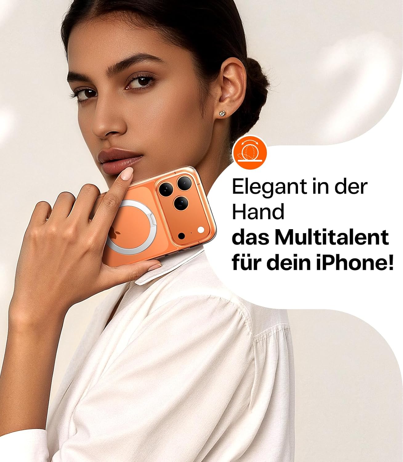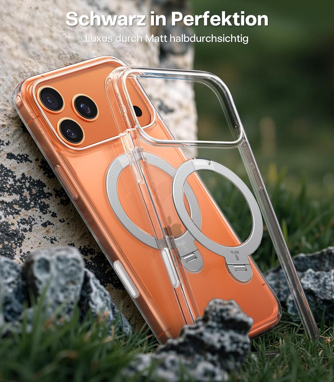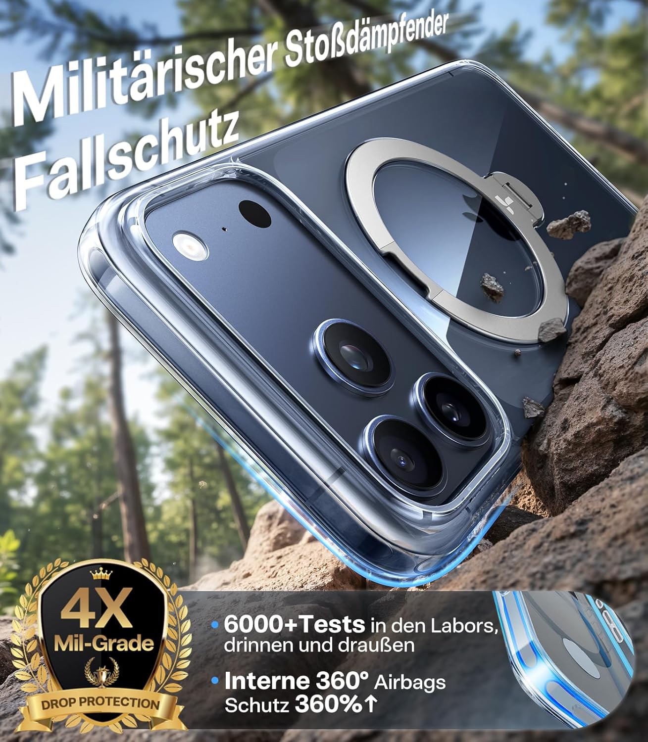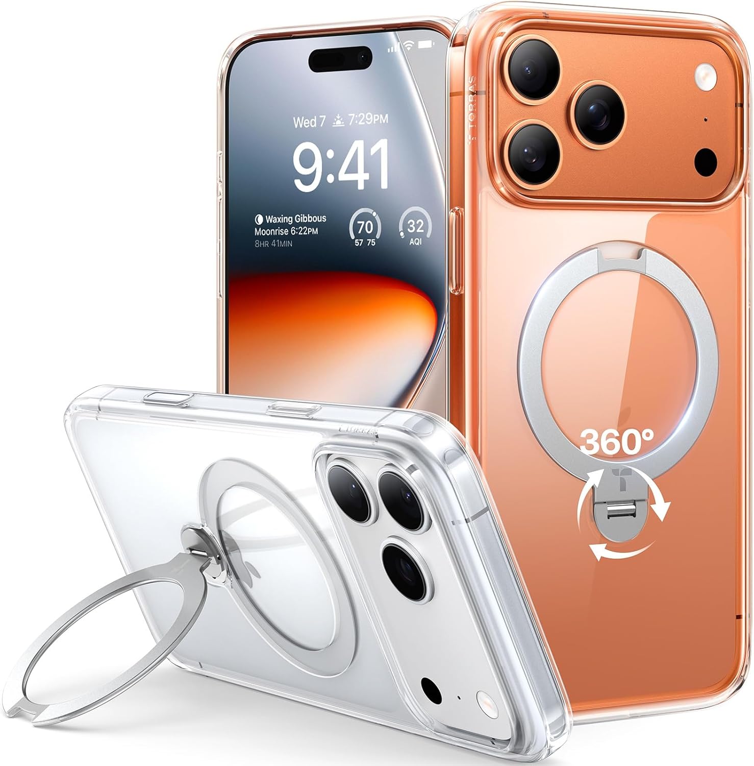 • [360-градусов пръстен за стойка: Стабилизиран за всеки желан ъгъл: Завъртането осигурява 360° завъртане и четириточково позициониране за най-стабилен ъгъл. С максимална гъвкавост можете да регулирате хоризонтално изгледа от 15° до 160° и вертикално от 30° до 90°. Независимо дали гледате видеоконференции или провеждате дълги телефонни разговори, калъфът за iPhone 17 Pro може лесно да се регулира до желания ъгъл и по този начин осигурява максимален комфорт в свободното време и по-голяма ефективност на работното място.]