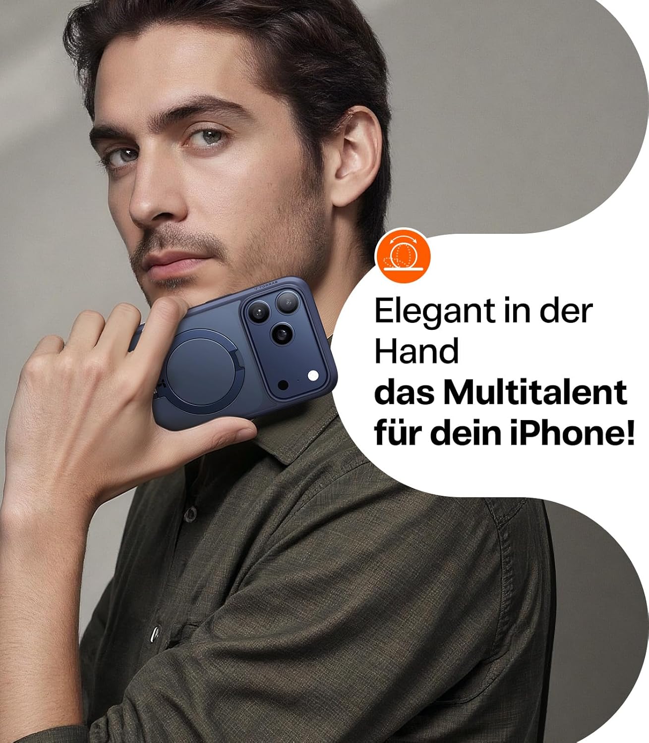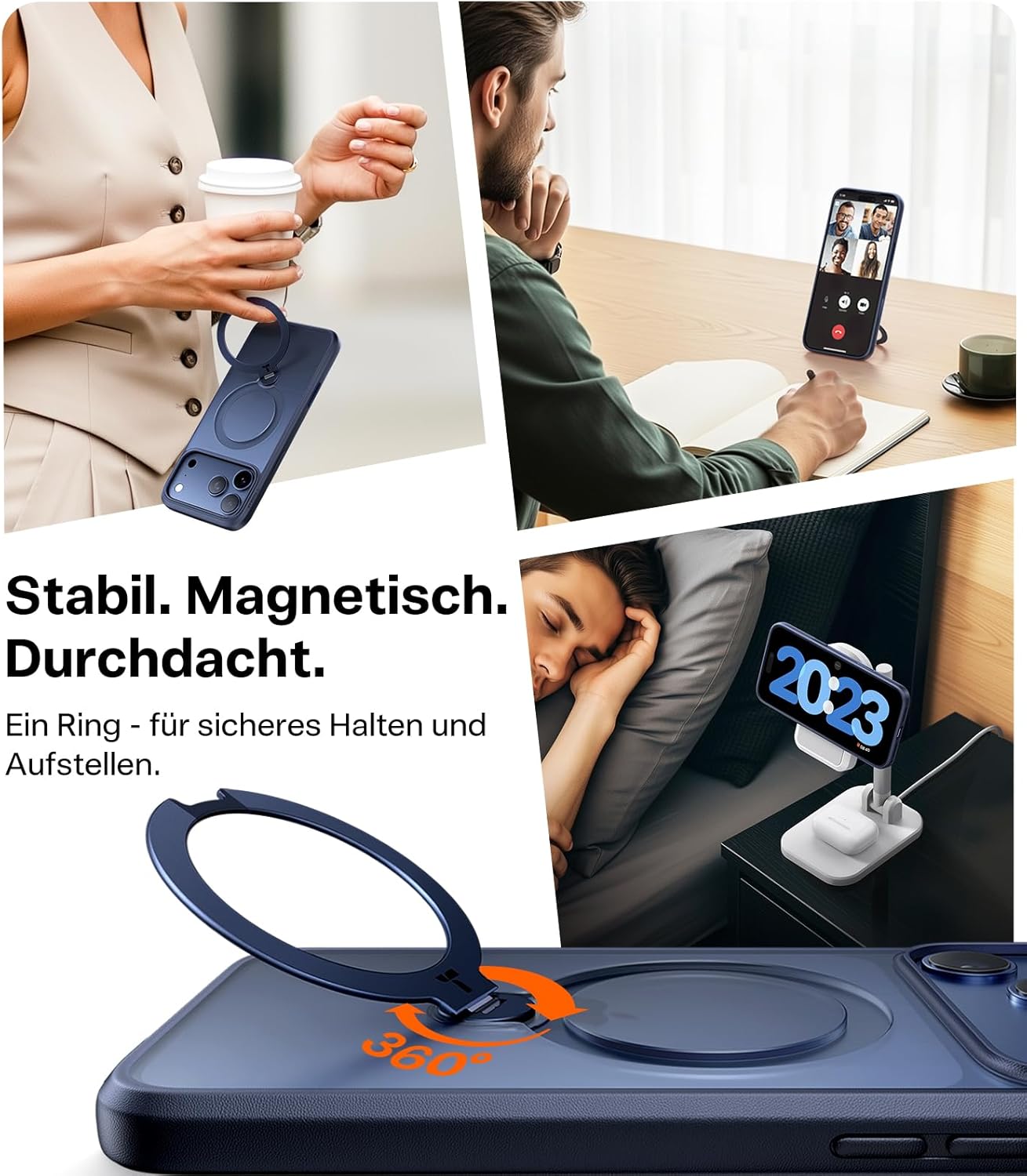 • [360-градусов пръстен за стойка: Стабилизиран за всеки желан ъгъл: Завъртането осигурява 360° завъртане и четириточково позициониране за най-стабилен ъгъл. С максимална гъвкавост можете да регулирате хоризонтално изгледа от 15° до 160° и вертикално от 30° до 90°. Независимо дали гледате видеоконференции или провеждате дълги телефонни разговори, калъфът за iPhone 17 Pro може лесно да се регулира до желания ъгъл и по този начин осигурява максимален комфорт в свободното време и по-голяма ефективност на работното място.]