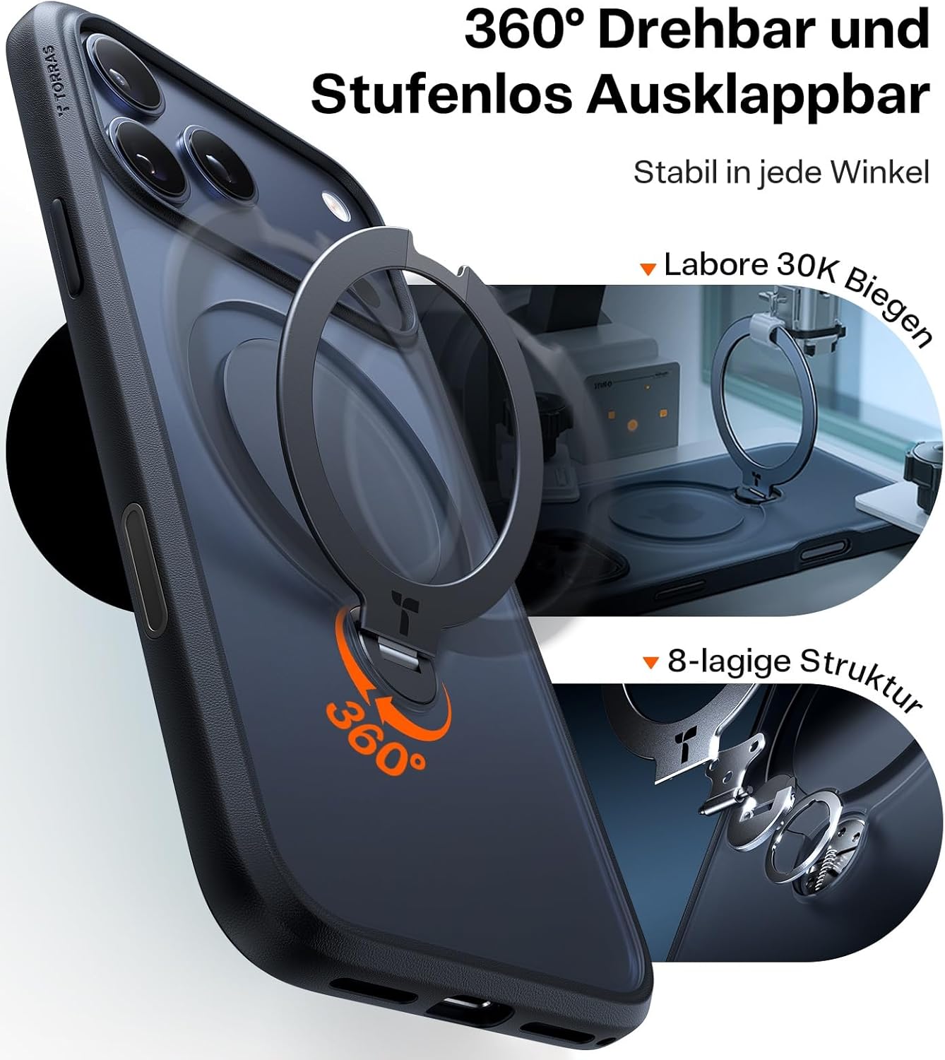 • [360-градусов пръстен за стойка: Стабилизиран за всеки желан ъгъл: Завъртането осигурява 360° завъртане и четириточково позициониране за най-стабилен ъгъл. С максимална гъвкавост можете да регулирате хоризонтално изгледа от 15° до 160° и вертикално от 30° до 90°. Независимо дали гледате видеоконференции или провеждате дълги телефонни разговори, калъфът за iPhone 17 Pro може лесно да се регулира до желания ъгъл и по този начин осигурява максимален комфорт в свободното време и по-голяма ефективност на работното място.]