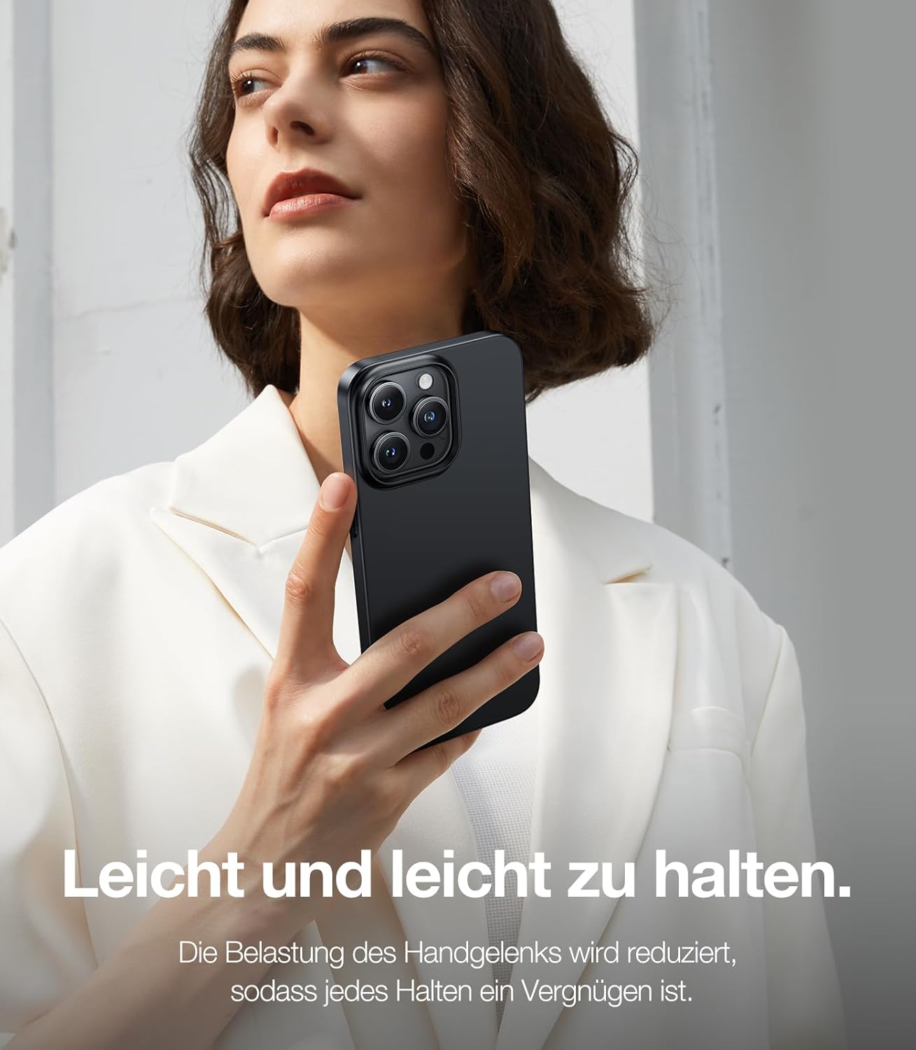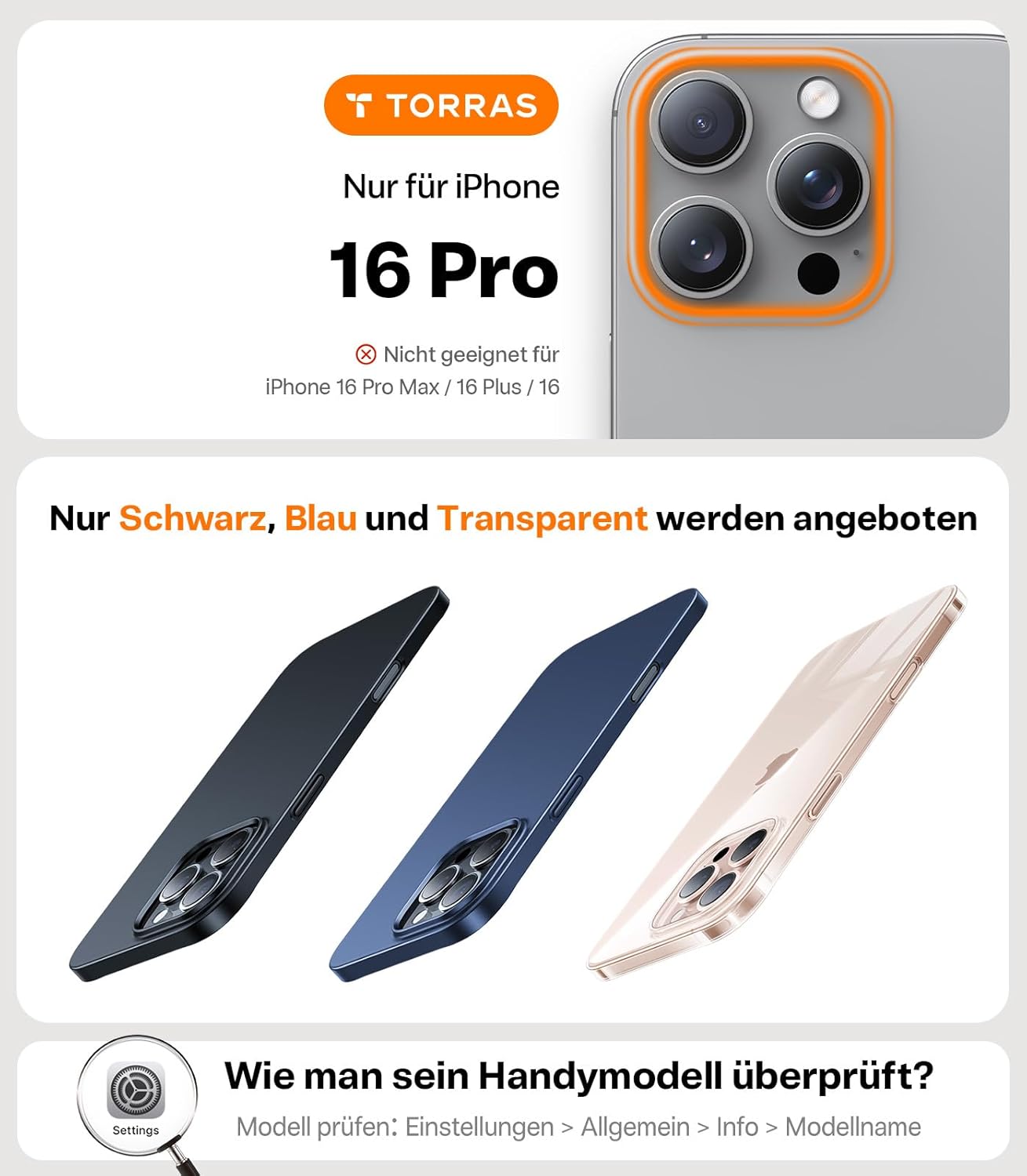 TORRAS Тънък мобилен калъф за iPhone 16 Pro с дебелина 0.07 см, цялостна защита, отлично кадифено захващане като оригинала, защитен, тънък, черен