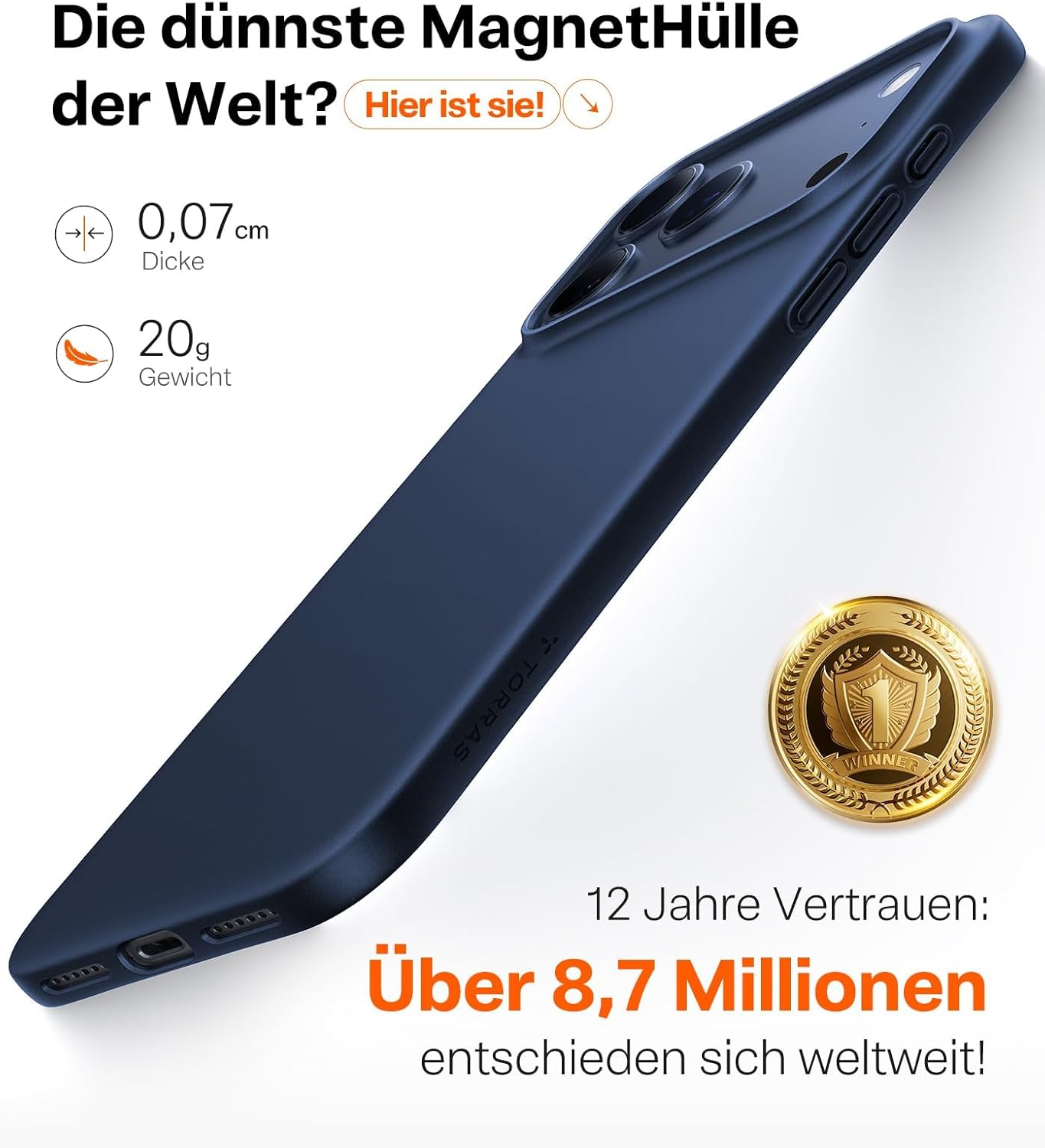 • Най-тънкият калъф в индустрията, перфектна комбинация от класика и иновация: В продължение на много години серията TORRAS Ultra-Thin се радва на голяма популярност с над 8,7 милиона клиенти и процент на повторно закупуване от 93,2%. Ултратънкият калъф за iPhone 17 Pro все още се отличава с популярния тънък дизайн и е съвместим с функцията MagSafe. Това е ултратънък калъф с магнитна функционалност, който предлага максимален комфорт.