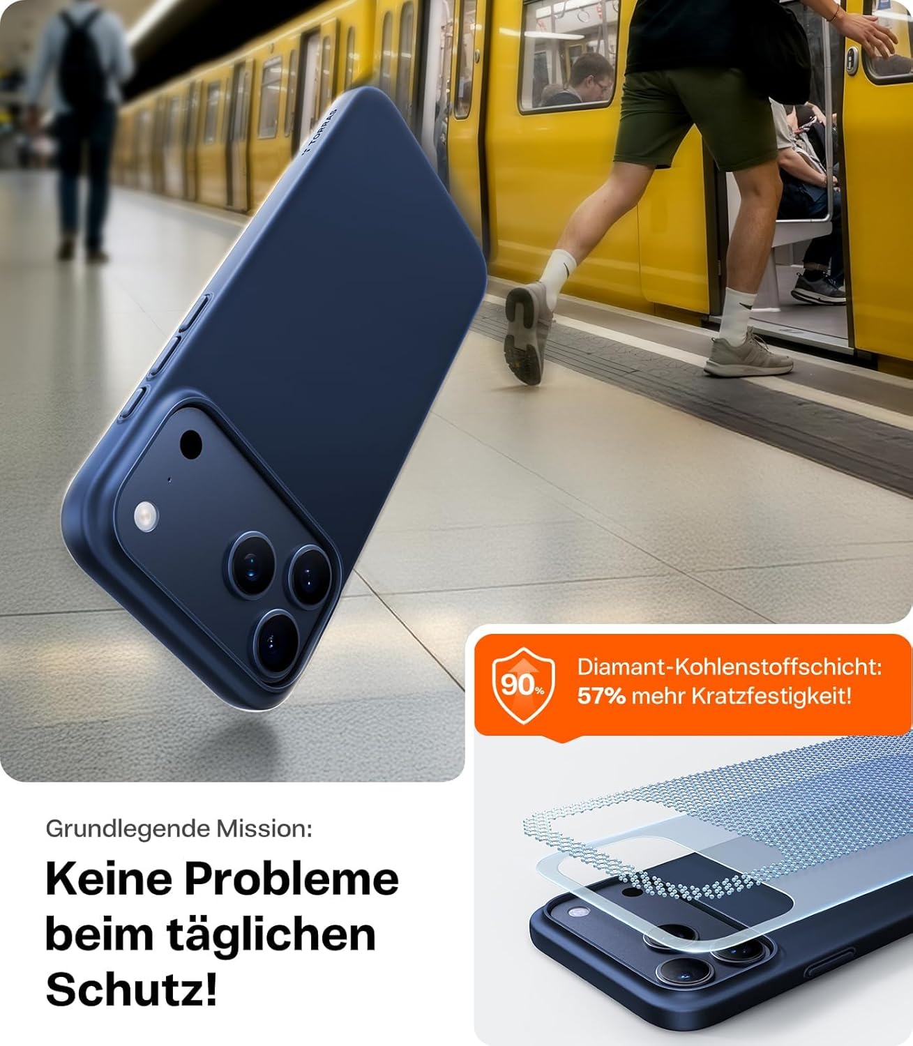 • По-тънък за по-добър захват: Този калъф за iPhone 17 Pro възпроизвежда 1:1 тънките линии на телефона. За да осигурим най-добър комфорт при захващане, избрахме леко извит дизайн, който осигурява удобно усещане в ръката със заоблени ръбове. Гърбът на калъфа е снабден с нашето иновативно меко нано покритие, което прави пръстовите отпечатъци и мазните петна лесни за изтриване и винаги осигурява изчистен и семпъл вид.