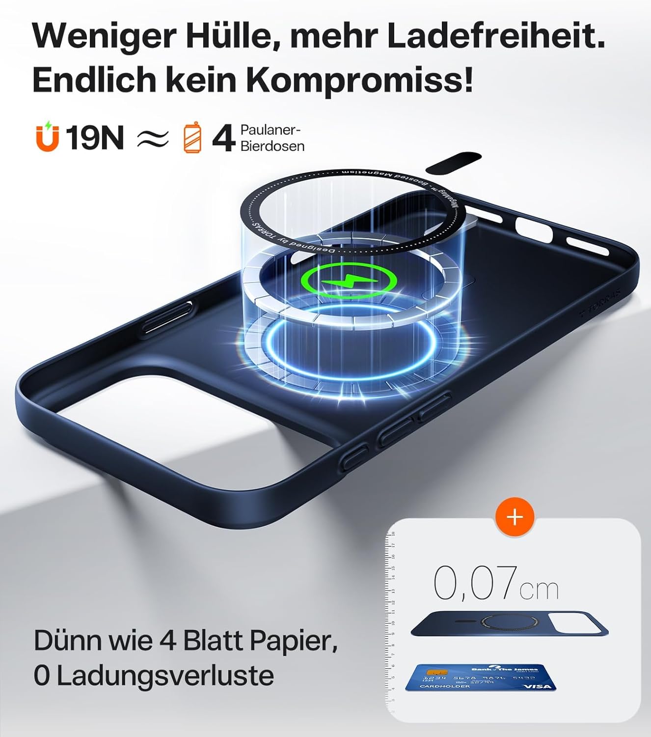 • Ултратънък и следователно с най-силна магнитна сила: TORRAS е запазил сложното лазерно гравиране, както и технологията за CNC шлифоване, и е намалил дебелината на калъфа за iPhone 17 Pro до само 0,07 см. Гърбът приляга почти безпроблемно към телефона. Благодарение на най-силните магнити N56 и технологията Halbach array, калъфът постига магнитна сила от 19 N, което е много силно и е напълно съвместимо с аксесоарите MagSafe, като същевременно е ултратънък.