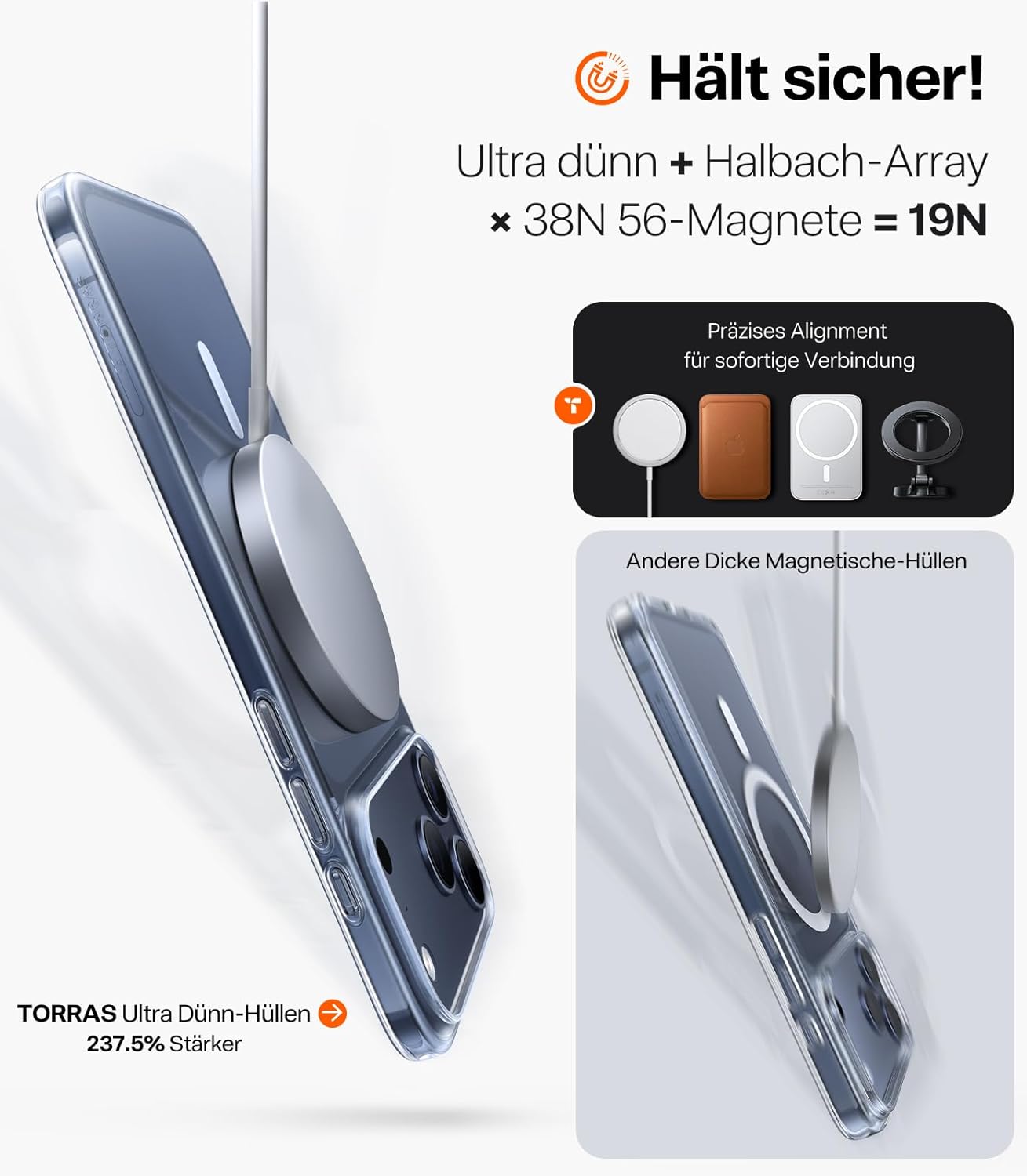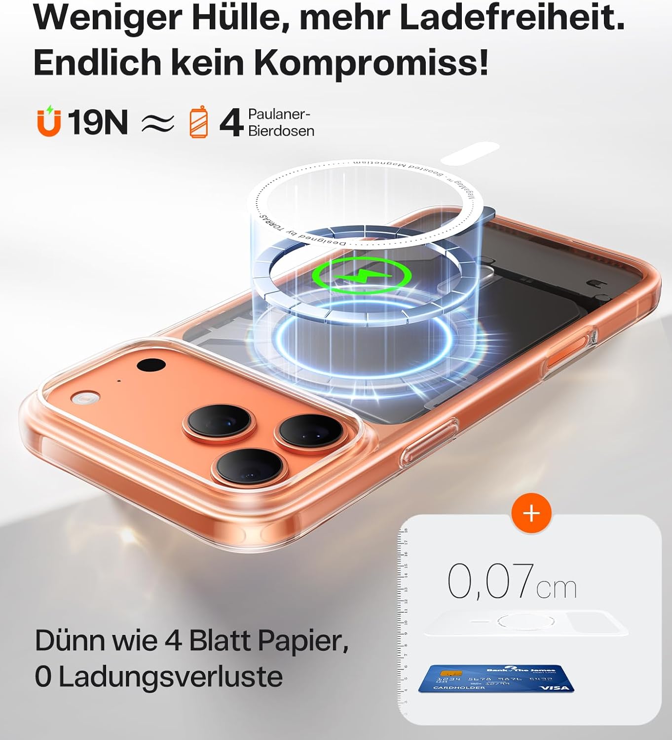 • Ултратънък и следователно с най-силна магнитна сила: TORRAS е запазил сложното лазерно гравиране, както и технологията за CNC шлифоване, и е намалил дебелината на калъфа за iPhone 17 Pro до само 0,07 см. Гърбът приляга почти безпроблемно към телефона. Благодарение на най-силните магнити N56 и технологията Halbach array, калъфът постига магнитна сила от 19 N, което е много силно и е напълно съвместимо с аксесоарите MagSafe, като същевременно е ултратънък.