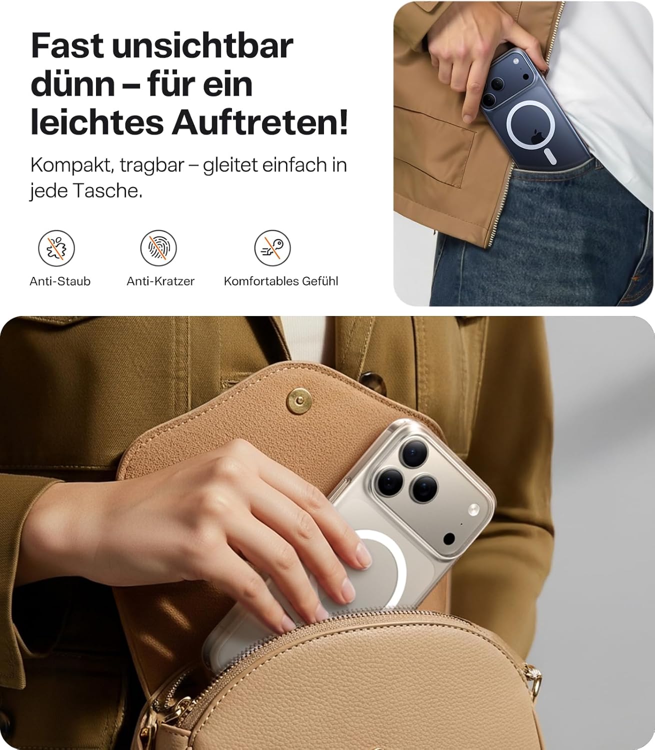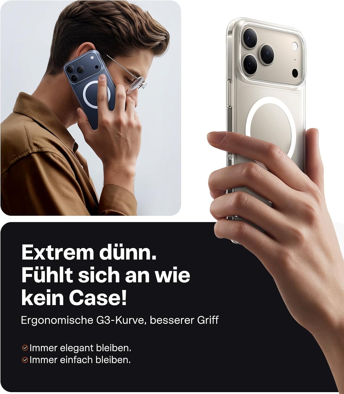 • По-тънък за по-добър захват: Този калъф за iPhone 17 Pro възпроизвежда 1:1 тънките линии на телефона. За да осигурим най-добър комфорт при захващане, избрахме леко извит дизайн, който осигурява удобно усещане в ръката със заоблени ръбове. Гърбът на калъфа е снабден с нашето иновативно меко нано покритие, което прави пръстовите отпечатъци и мазните петна лесни за изтриване и винаги осигурява изчистен и семпъл вид.