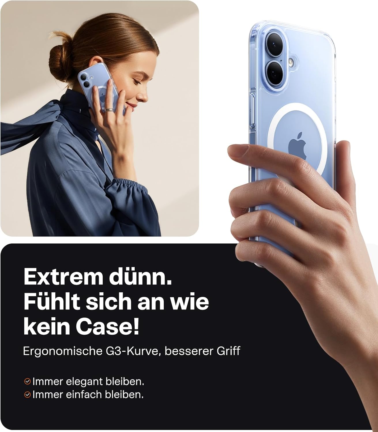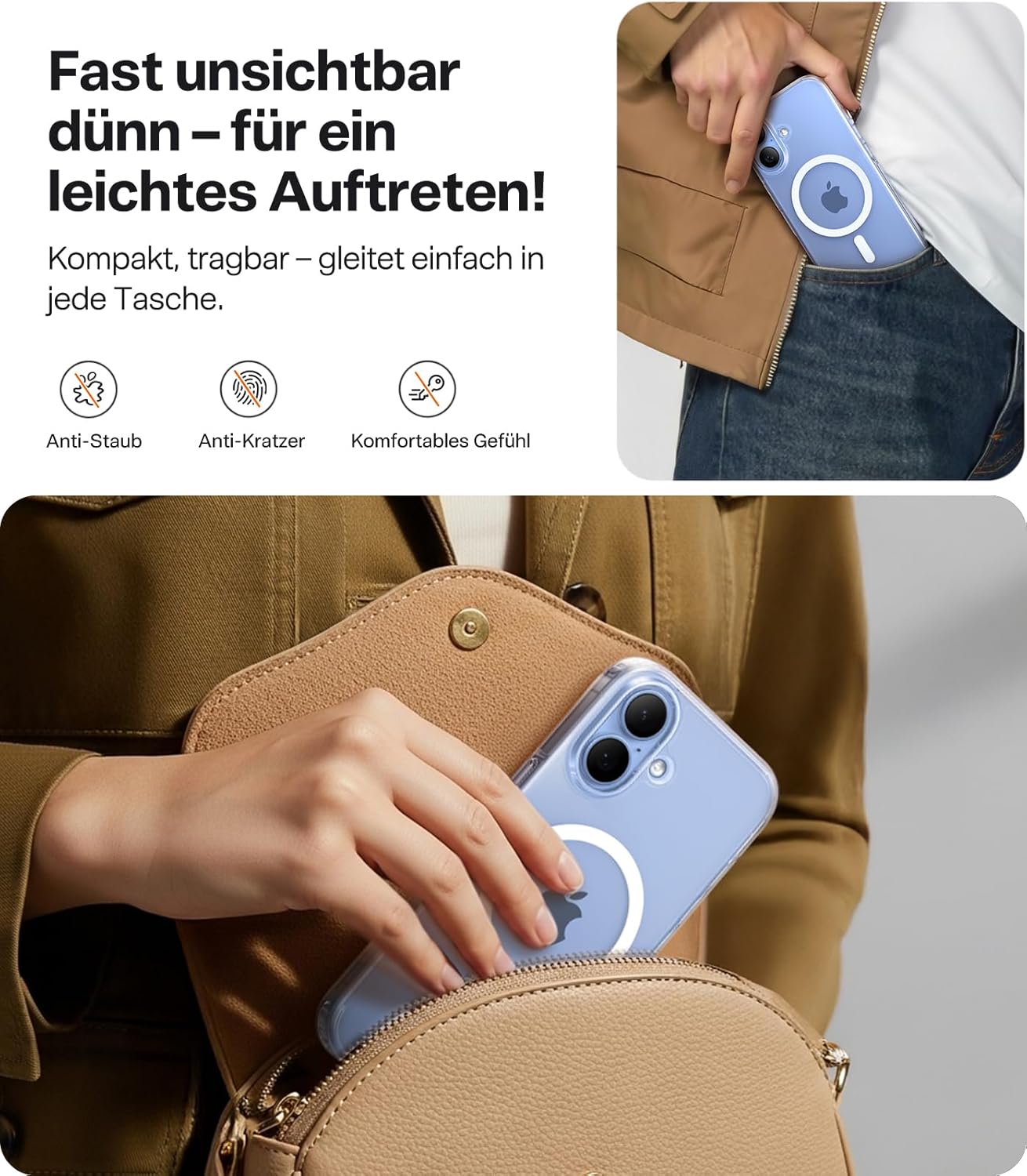 • По-тънък за по-добър захват: Този калъф за iPhone 17 Pro възпроизвежда 1:1 тънките линии на телефона. За да осигурим най-добър комфорт при захващане, избрахме леко извит дизайн, който осигурява удобно усещане в ръката със заоблени ръбове. Гърбът на калъфа е снабден с нашето иновативно меко нано покритие, което прави пръстовите отпечатъци и мазните петна лесни за изтриване и винаги осигурява изчистен и семпъл вид.