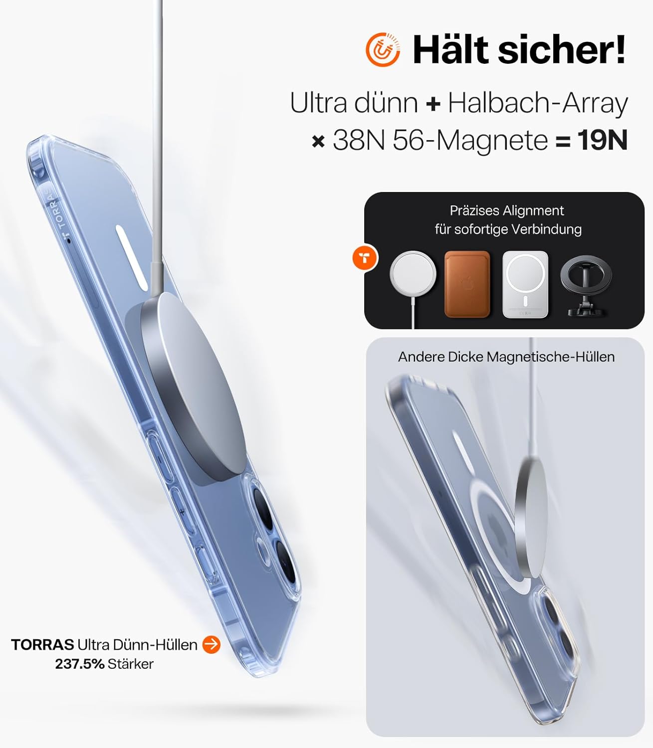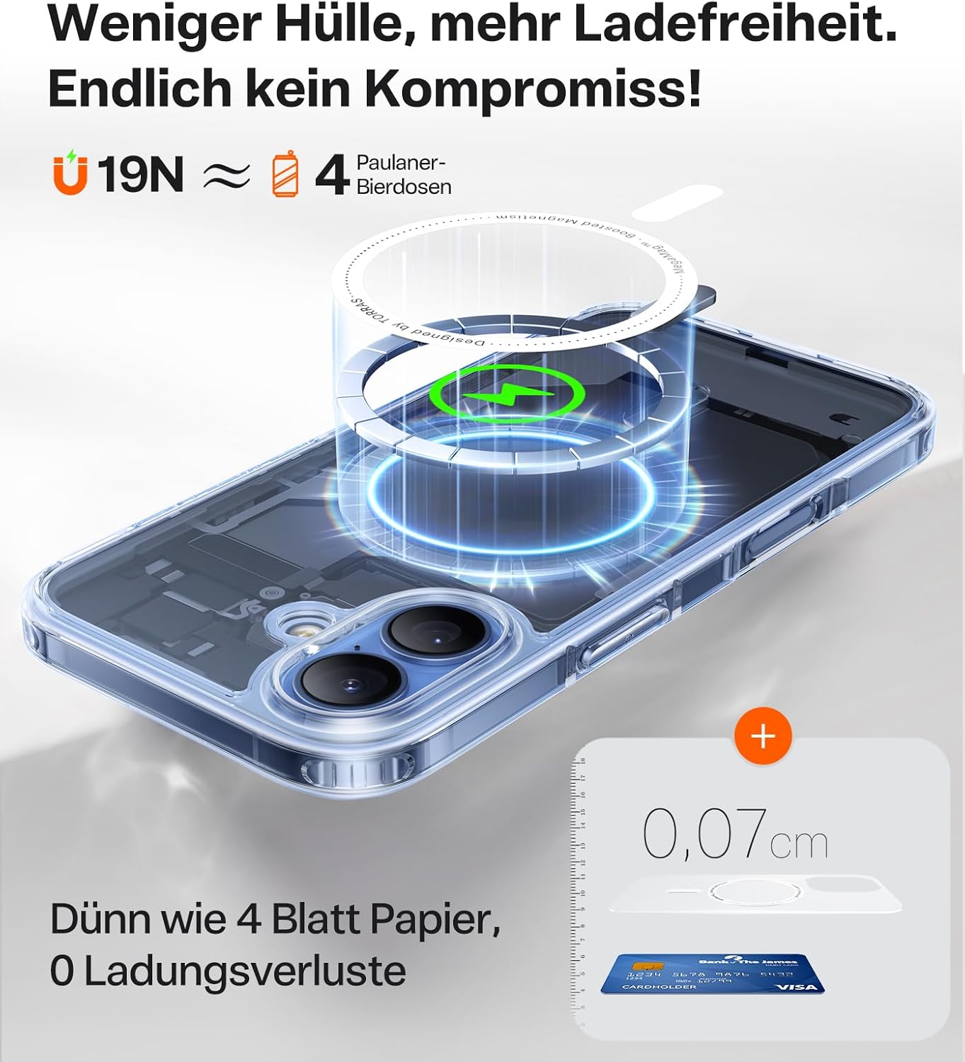 • Ултратънък и следователно с най-силна магнитна сила: TORRAS е запазил сложното лазерно гравиране, както и технологията за CNC шлифоване, и е намалил дебелината на калъфа за iPhone 17 Pro до само 0,07 см. Гърбът приляга почти безпроблемно към телефона. Благодарение на най-силните магнити N56 и технологията Halbach array, калъфът постига магнитна сила от 19 N, което е много силно и е напълно съвместимо с аксесоарите MagSafe, като същевременно е ултратънък.