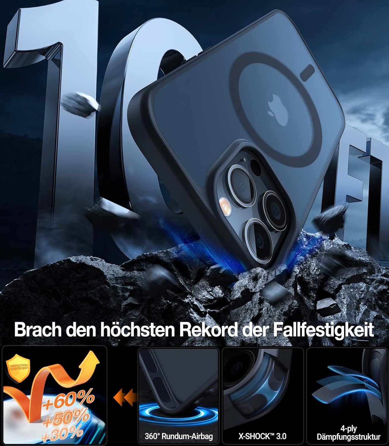 • Максимална защита за iPhone 17 Pro: Този калъф за iPhone 17 Pro комбинира взривоустойчиви композитни материали от термопластичен полиуретан (TPU) + термопластичен еластомер (TPE) с патентованата технология MilShock в четирите ъгъла. Лабораторно тестван, той е устойчив на падания от височина 4 м и е издържал лесно на над 5000 теста за падане. Заедно с повдигнатата 2,5 мм защита на камерата и 1,8 мм високия ръб на дисплея, той образува 360° защитна система, която надеждно защитава вашия iPhone 17 Pro от ежедневни падания и екстремни натоварвания.