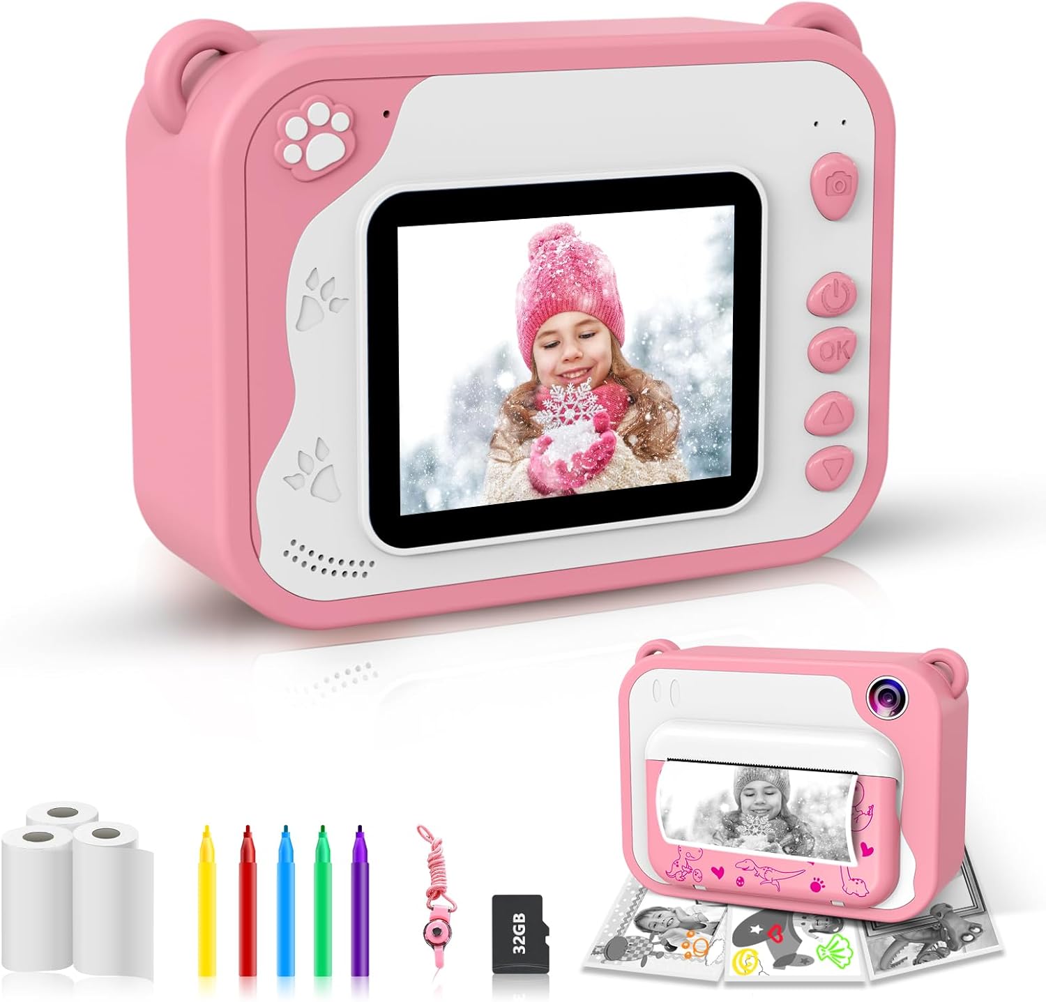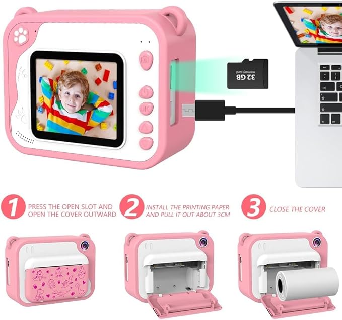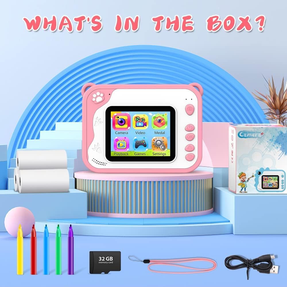 Напълно функционален, прави и отпечатва снимки, записва видеоклипове, възпроизвежда музикален плейър, 4 пъзел игри, 10 езика, отложени снимки, непрекъснати снимки и 32GB SD карта.