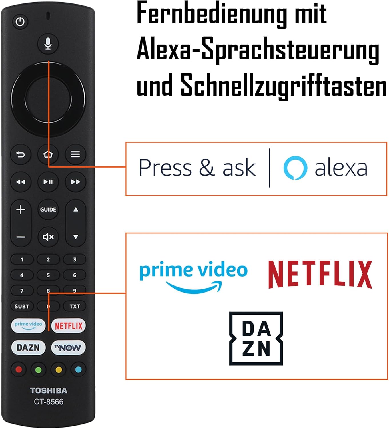 Dank den praktischen Schnellzugrifftasten gelangen Sie mühelos mit nur einem Klick direkt zu den beliebten Streaming-Diensten Prime Video und Netflix. Darüber hinaus können Sie mit der Press & Ask Alexa-Funktion Ihren Fernseher steuern (Ein-/Ausschalten, Programmwechsel, Lautstärkeregelung und vieles mehr). Es können hier Abonnementgebühren anfallen.