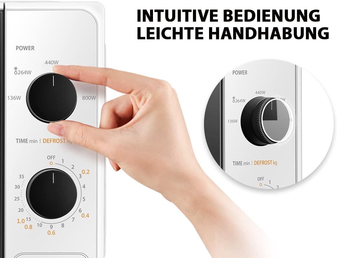 • Практични функции: размразяване по тегло/време, 35-минутен кухненски часовник, неплъзгащи се крачета, стабилна въртяща се чиния.