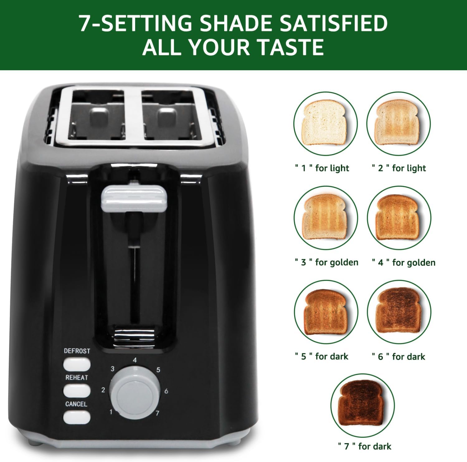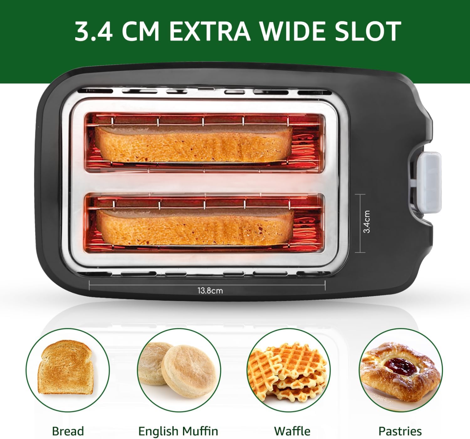 Тостер, 7 регулируеми нива на препичане + функция за размразяване и затопляне, 2 широки отделения за препечен хляб, 750 W, черен цвят