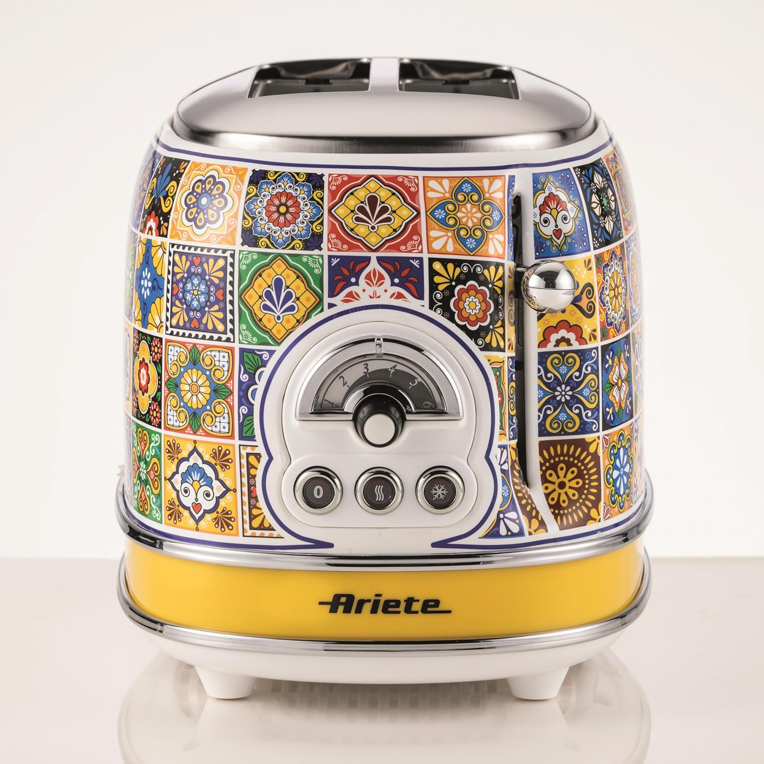 Тостер Ariete 155 Positano, средиземноморски дизайн, 2 широки отвора, 6 нива на препичане с автоматично изваждане, отделение за трохи, функция за препичане, претопляне и размразяване, 810 W
