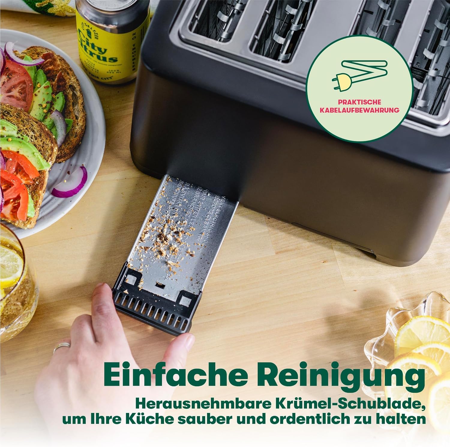 • ЛЕСНО ПОЧИСТВАНЕ: Този тостер за гевреци е изключително лесен за употреба благодарение на прозрачните бутони отпред. Лостът за повдигане позволява удобен достъп до по-малки хлябове, а подвижната тава за трохи прави почистването изключително лесно.