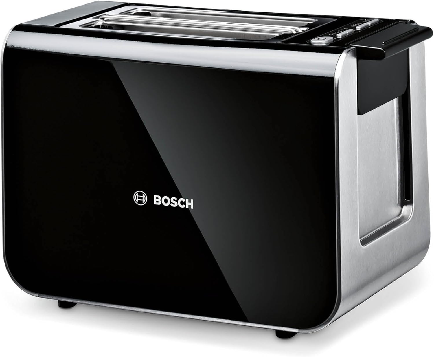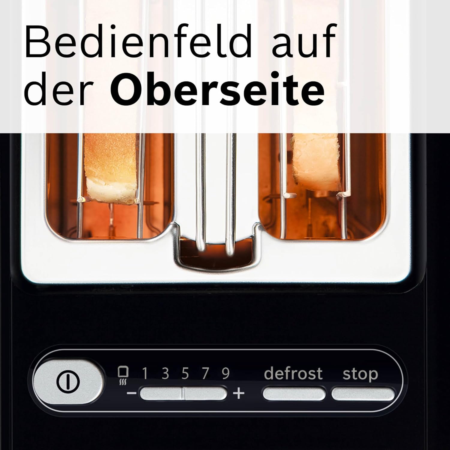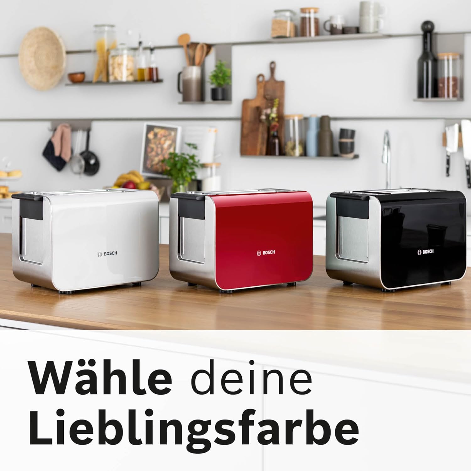 Компактният тостер на Bosch с модерен дизайн и елементи от неръждаема стомана съчетава издръжливост с висока лекота на използване.