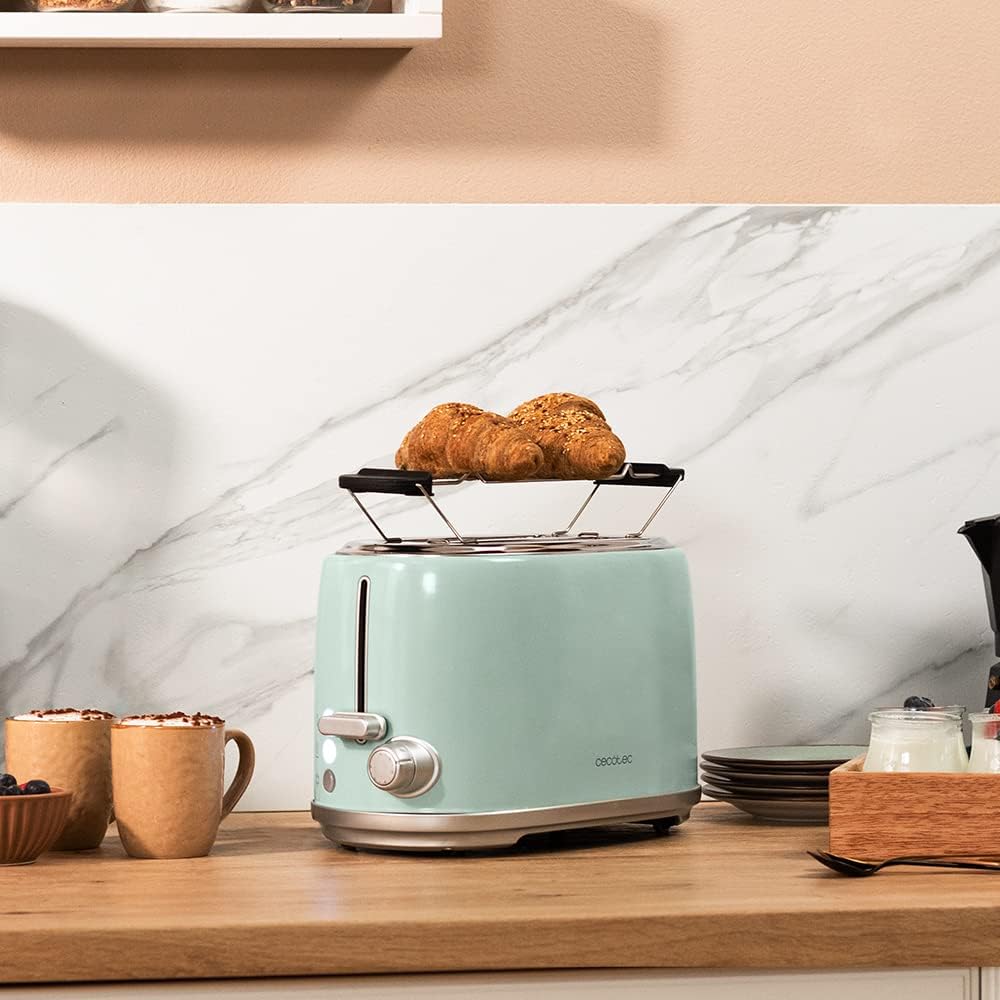 Тостер Cecotec 2 филийки препечен хляб и бутон 1000 Retro Double син, 980 W, 2 широки и къси слота от 3,8 см, неръждаема стомана, горни решетки, регулируема мощност, отделение за трохи