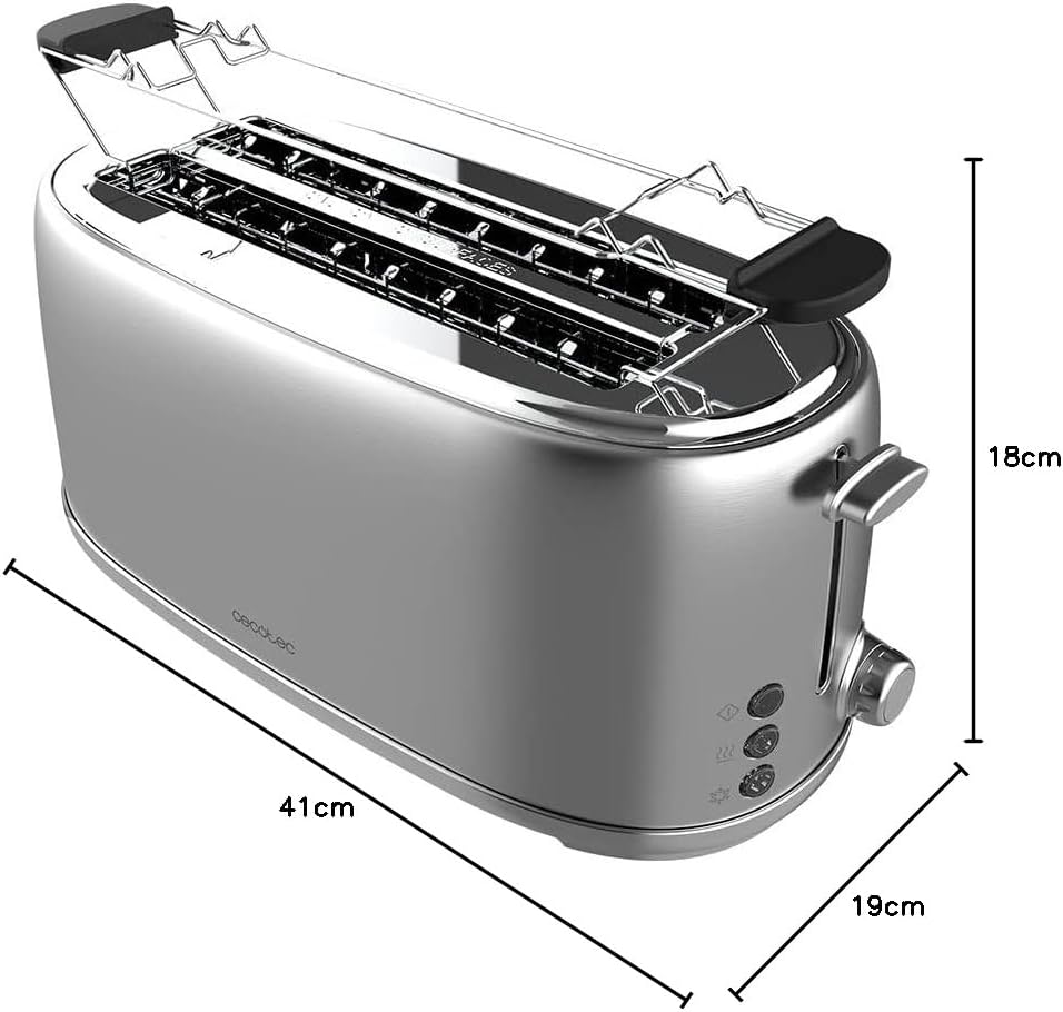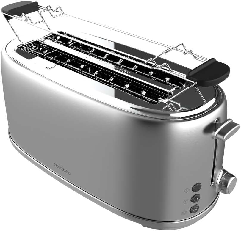 Тостер Cecotec 4 филийки препечен хляб и бутон 1600 Retro Double Inox, 1630 W, 2 широки и дълги слота от 3,8 см, неръждаема стомана, горни решетки, регулируема мощност, отделение за трохи