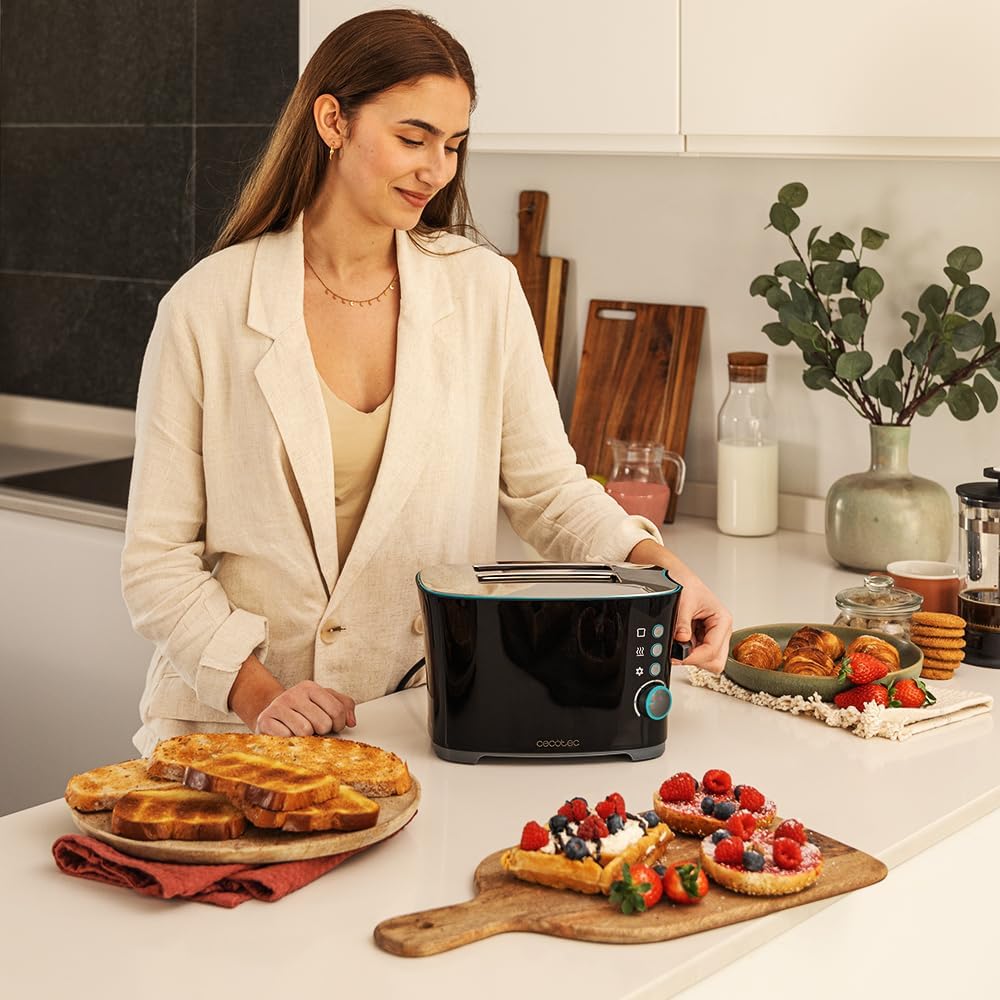• Удобни функции: система за самоцентриране за равномерно препичане, 7 позиции за покафеняване и бутон за отказ. Предварително конфигурирани функции: претопляне и размразяване.