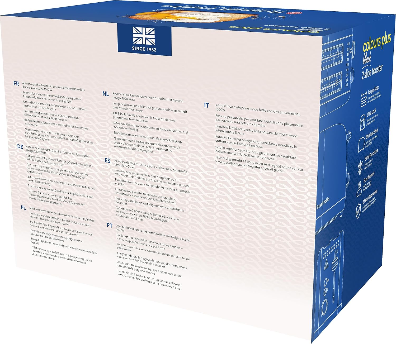 2 extra wide toast slots, lift and look, lifting function, 6 browning levels, defrosting, warming and stop function, crumb drawer, roll attachment