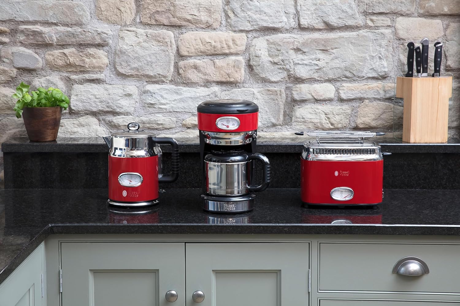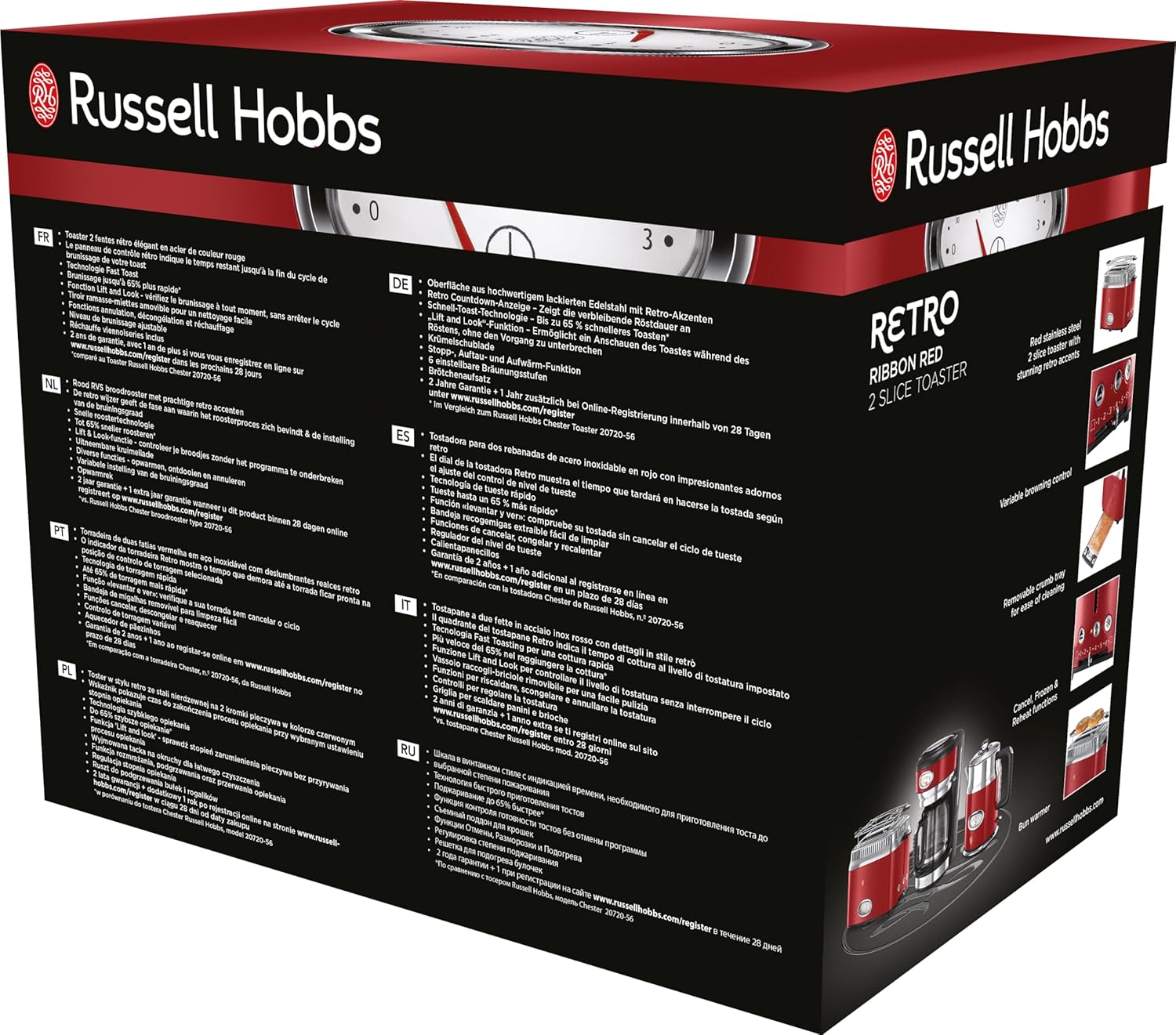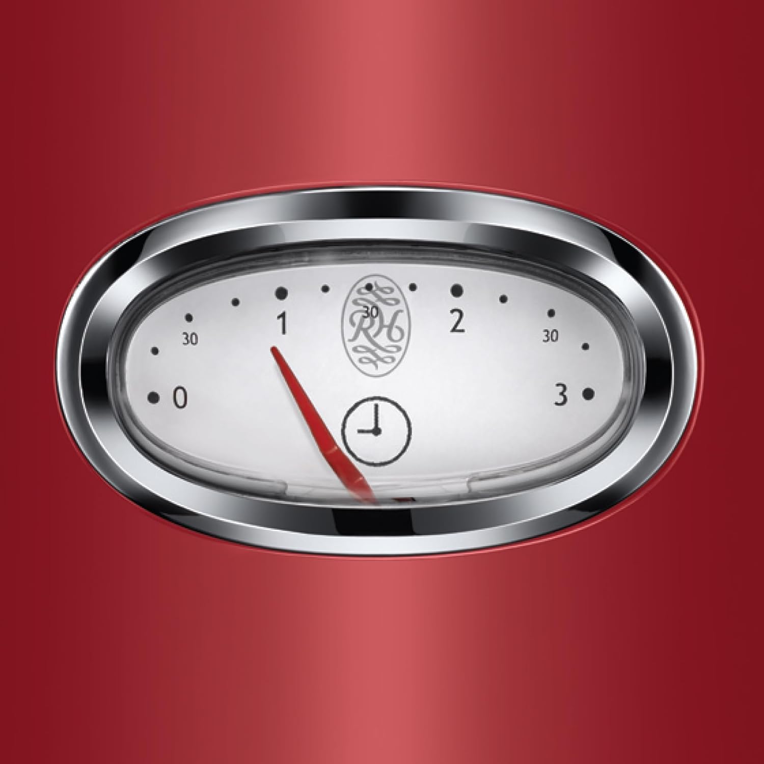 Тостер Russell Hobbs Vintage 21680-56 [за 2 филийки] Ретро неръждаема стомана, червен (дисплей за обратно броене в ретро дизайн, включва приставка за хлебче, 6 нива на запичане + функция за размразяване и претопляне, 1300 W)