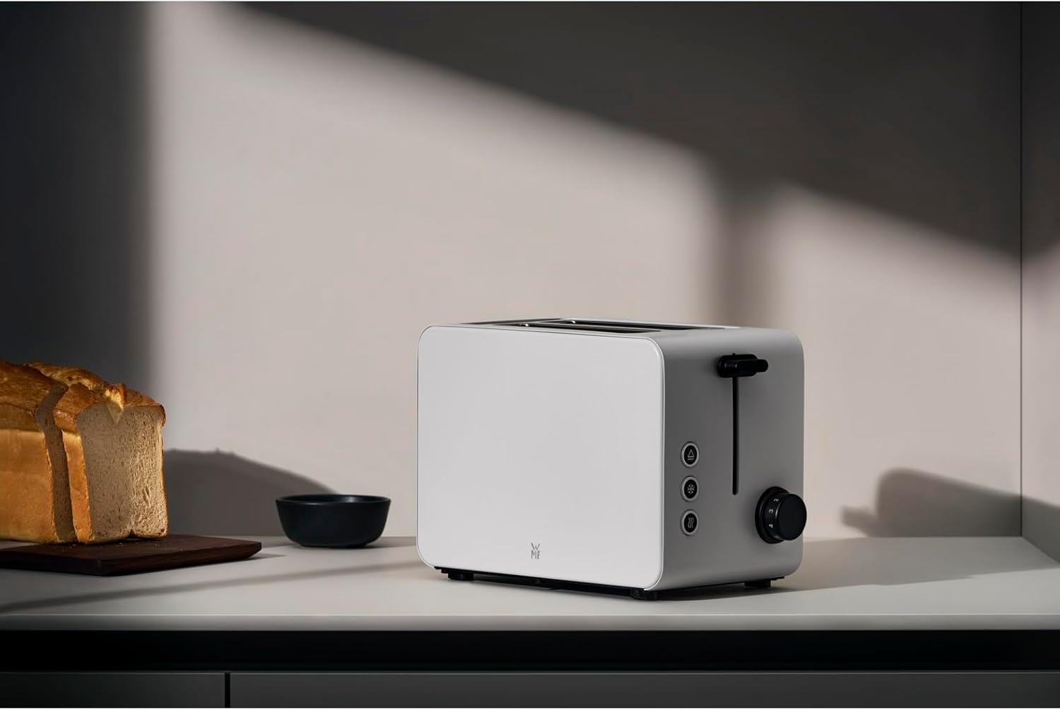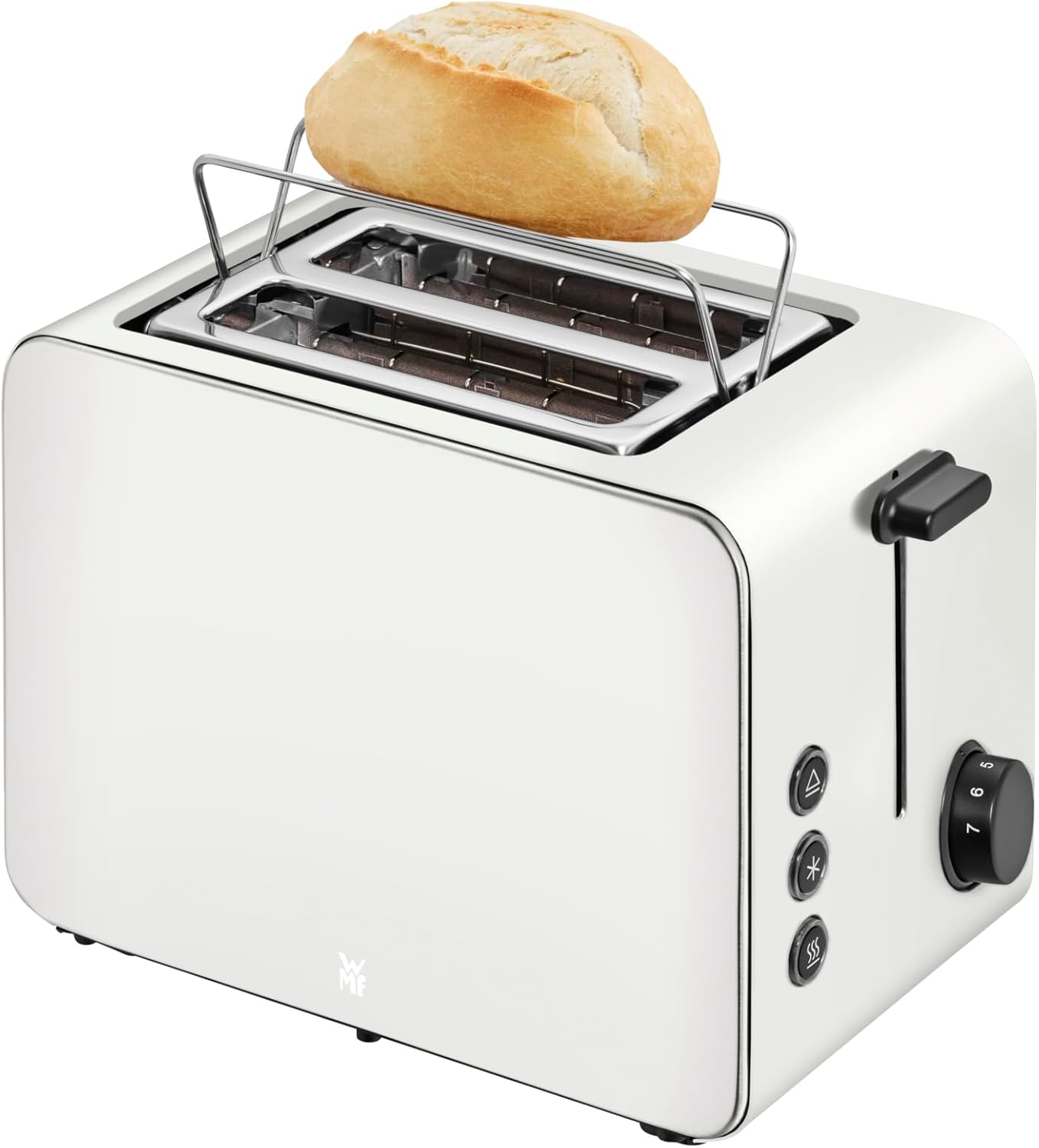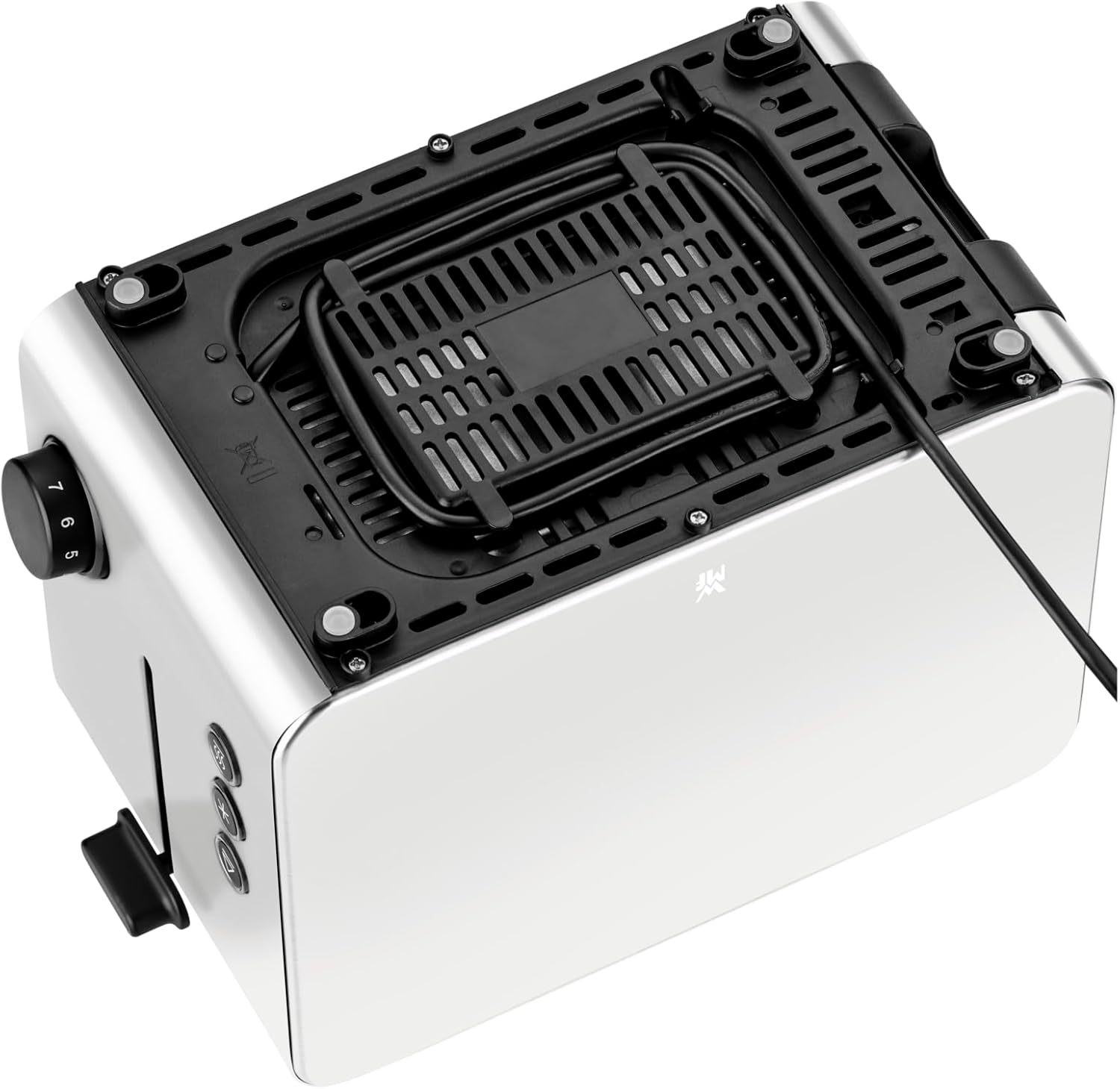 Тостерът Stelio Edition от WMF гарантира наслада от препечените филийки в най-красивата им форма. Седем степени на препичане, тава от неръждаема стомана за затопляне на големи лакомства като хлебчета и кроасани, както и система за центриране на хляба, която поставя дисковете точно по средата за равномерно препичане, оставяйки всички желания незадоволени. За тази цел, чрез осветените бутони са налични функции за стоп, загряване и размразяване. Полуматовият корпус, изработен от елегантен кромарган, на елегантния тостер с 2 слота впечатлява във всяка кухненска среда, а подвижното отделение за трохи позволява бързо и лесно почистване.