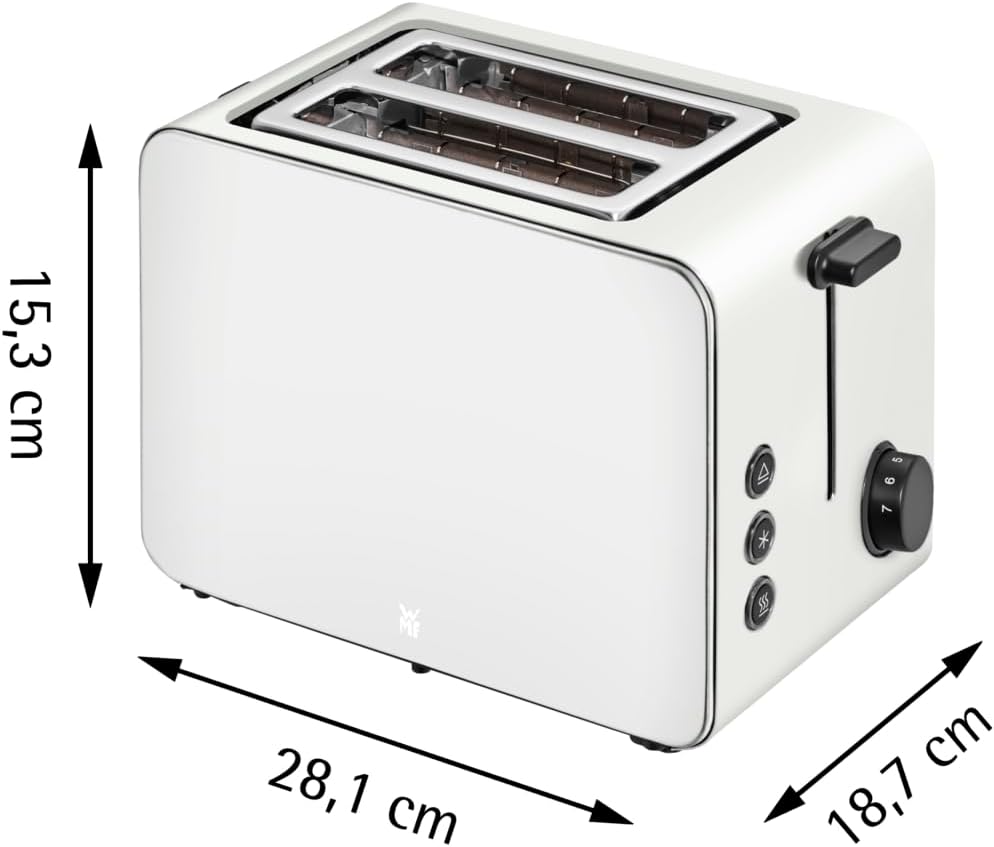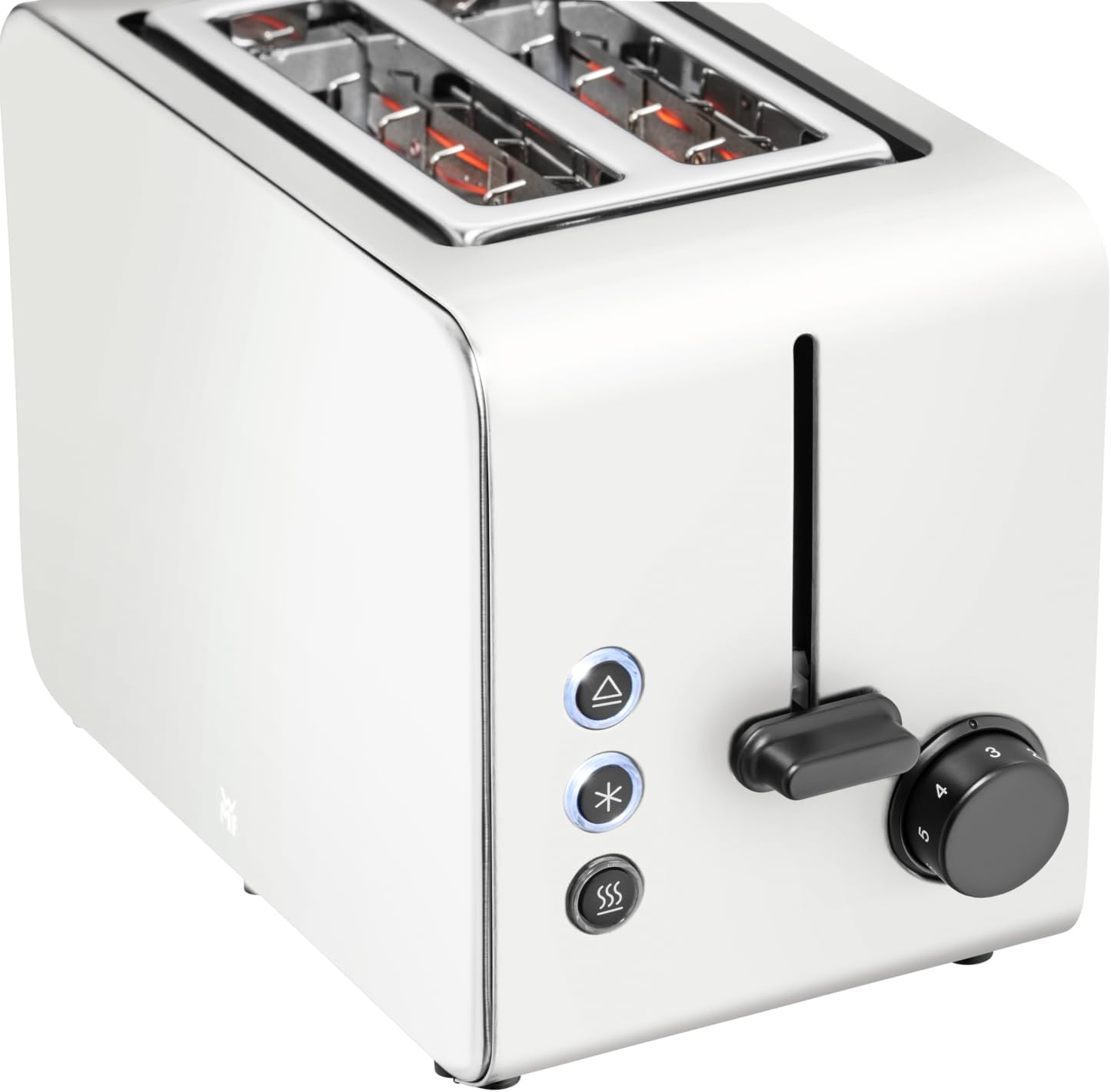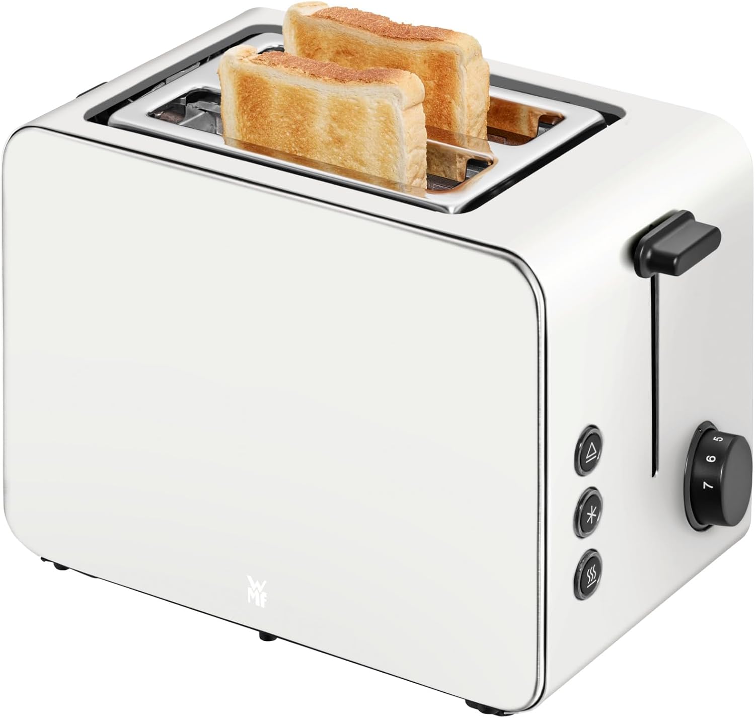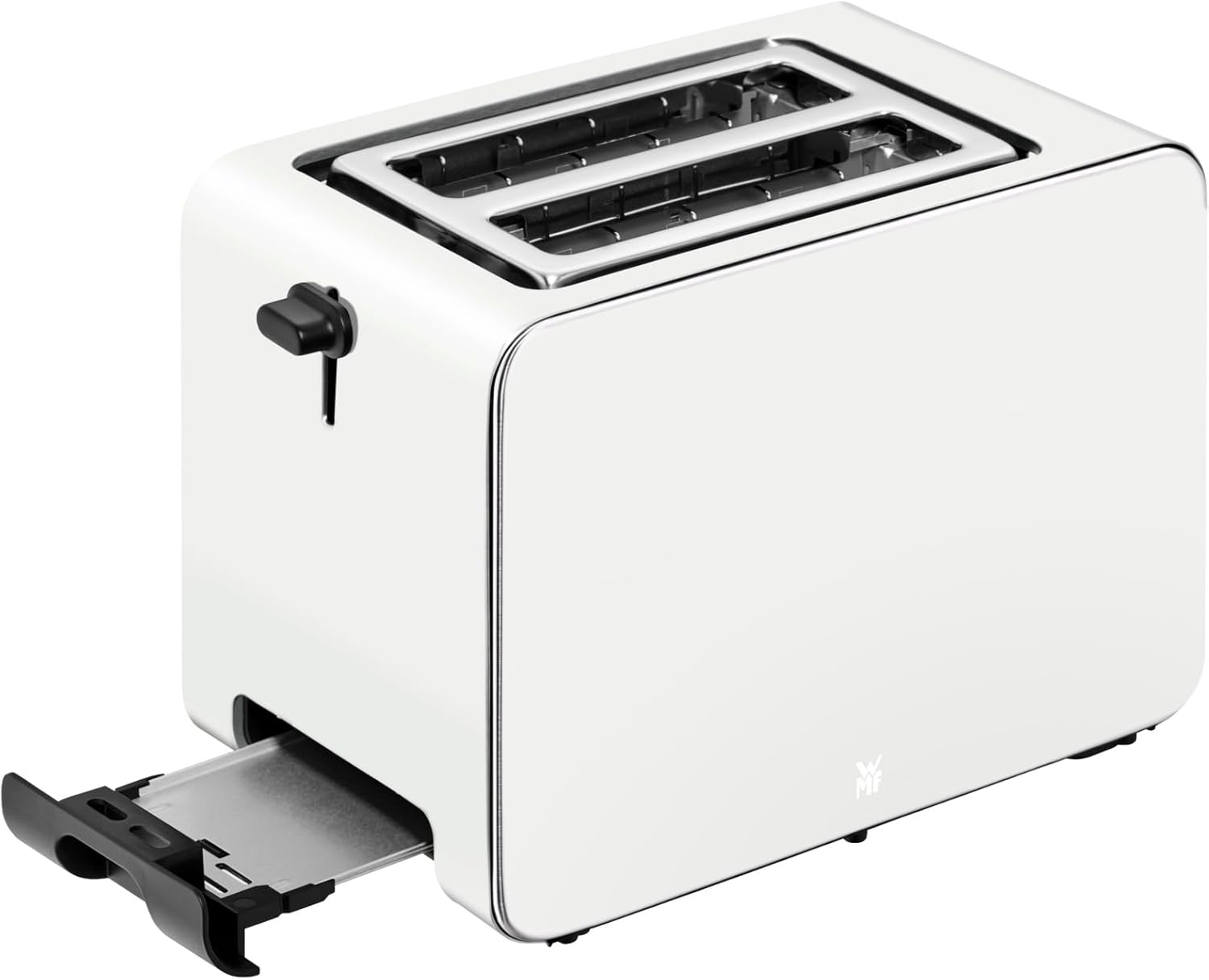 Тостерът Stelio Edition от WMF гарантира наслада от препечените филийки в най-красивата им форма. Седем степени на препичане, тава от неръждаема стомана за затопляне на големи лакомства като хлебчета и кроасани, както и система за центриране на хляба, която поставя дисковете точно по средата за равномерно препичане, оставяйки всички желания незадоволени. За тази цел, чрез осветените бутони са налични функции за стоп, загряване и размразяване. Полуматовият корпус, изработен от елегантен кромарган, на елегантния тостер с 2 слота впечатлява във всяка кухненска среда, а подвижното отделение за трохи позволява бързо и лесно почистване.