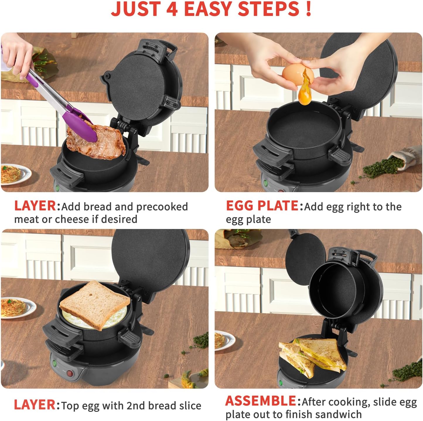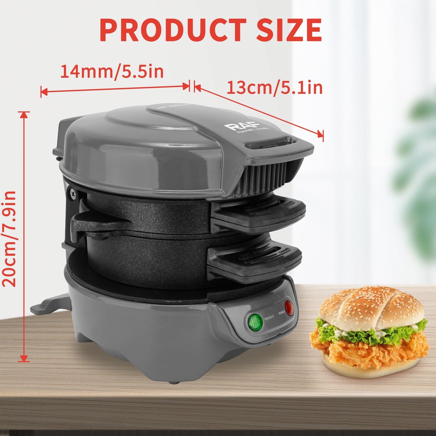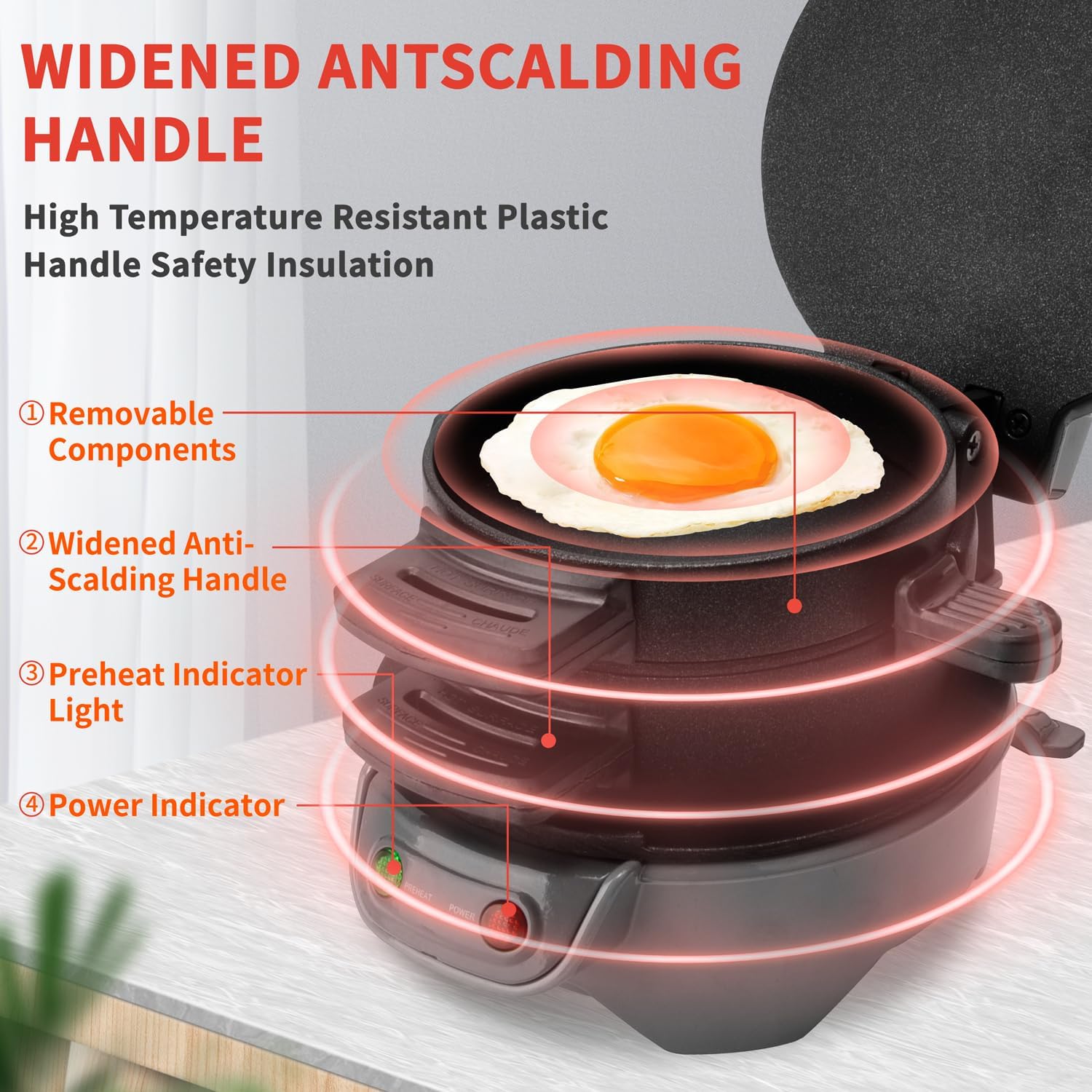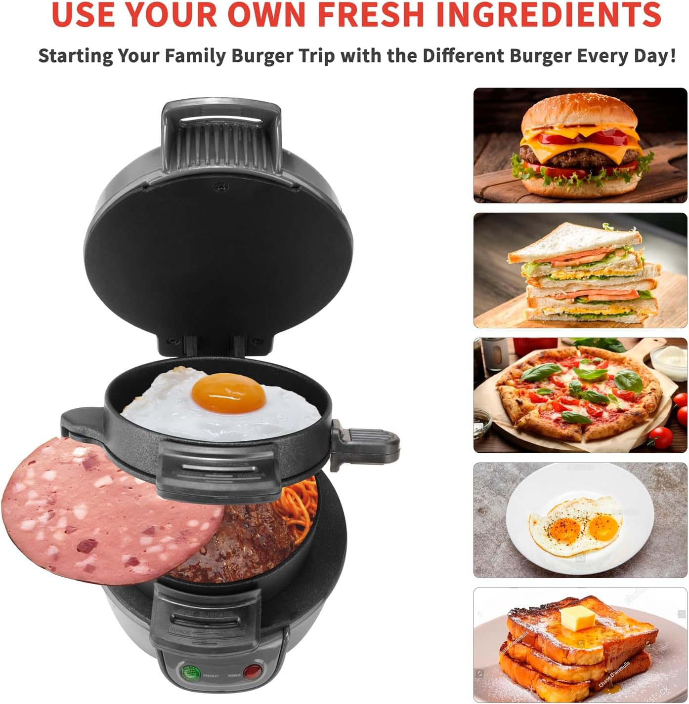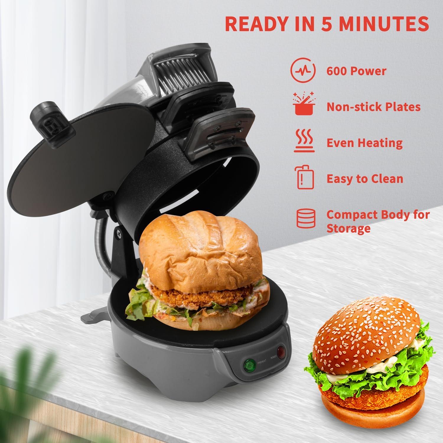 • Бързо и лесно: позволява ви да приготвите 1 богат сандвич/хамбургер само за няколко минути. Използвайте свои собствени пресни съставки, включително яйца, сирене и много други, и пригответе вкусни хлебчета за закуска в уюта на собствения си дом. Позволява ви да се насладите на 5-минутна закуска, спестявайки време и енергия.