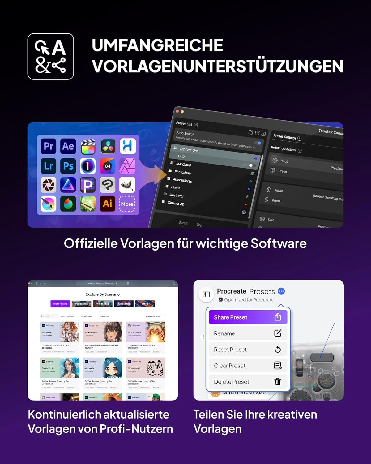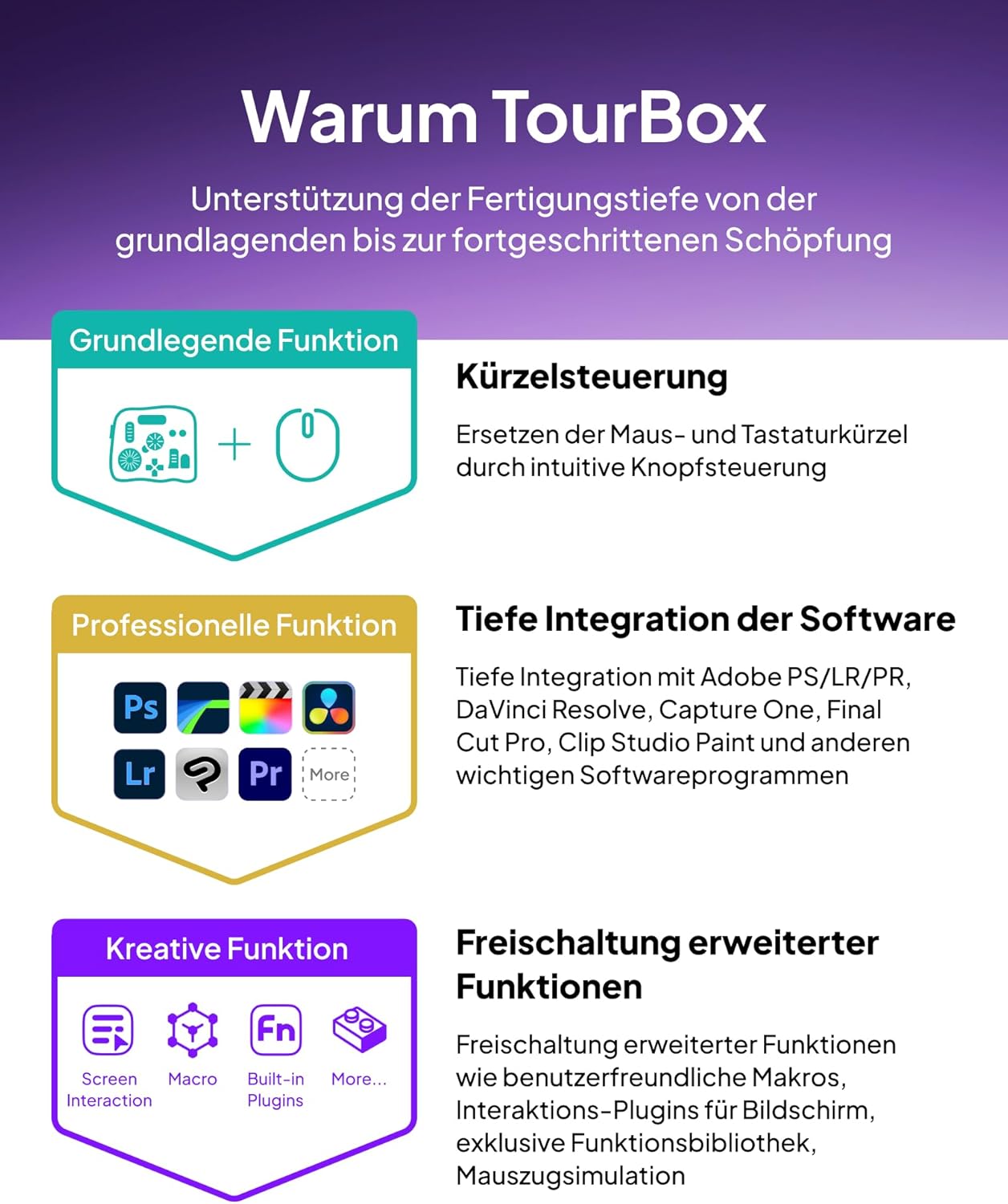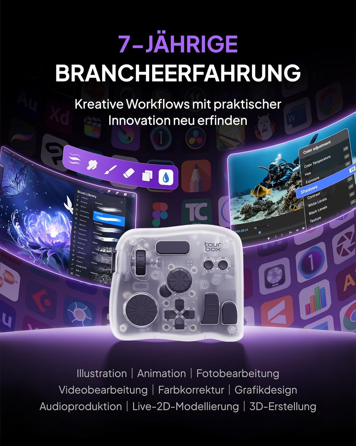 • Иновативна система за управление - Оборудвана с най-новия хардуер и софтуер на TourBox, тя предлага пълна поддръжка от BASIC до PRO. Заменете кликванията с интуитивни копчета и циферблати, насладете се на обширни креативни софтуерни настройки и отключете допълнителни професионални функции.