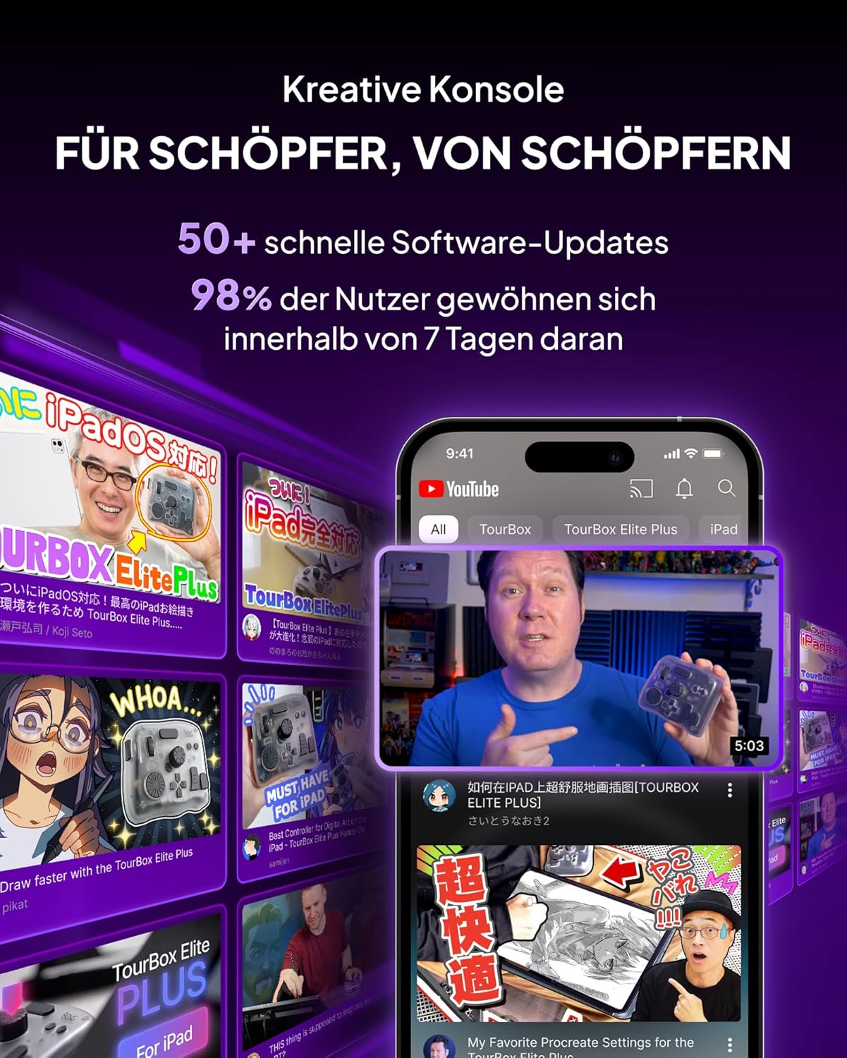 TOUR BOX Elite Plus, рисуване с iPad, Bluetooth контролер за редактиране на видео и снимки, конзола за iPad/Mac/Windows, комплект програмируема клавиатура Procreate Lightroom Photoshop LumaFusion DaVinci