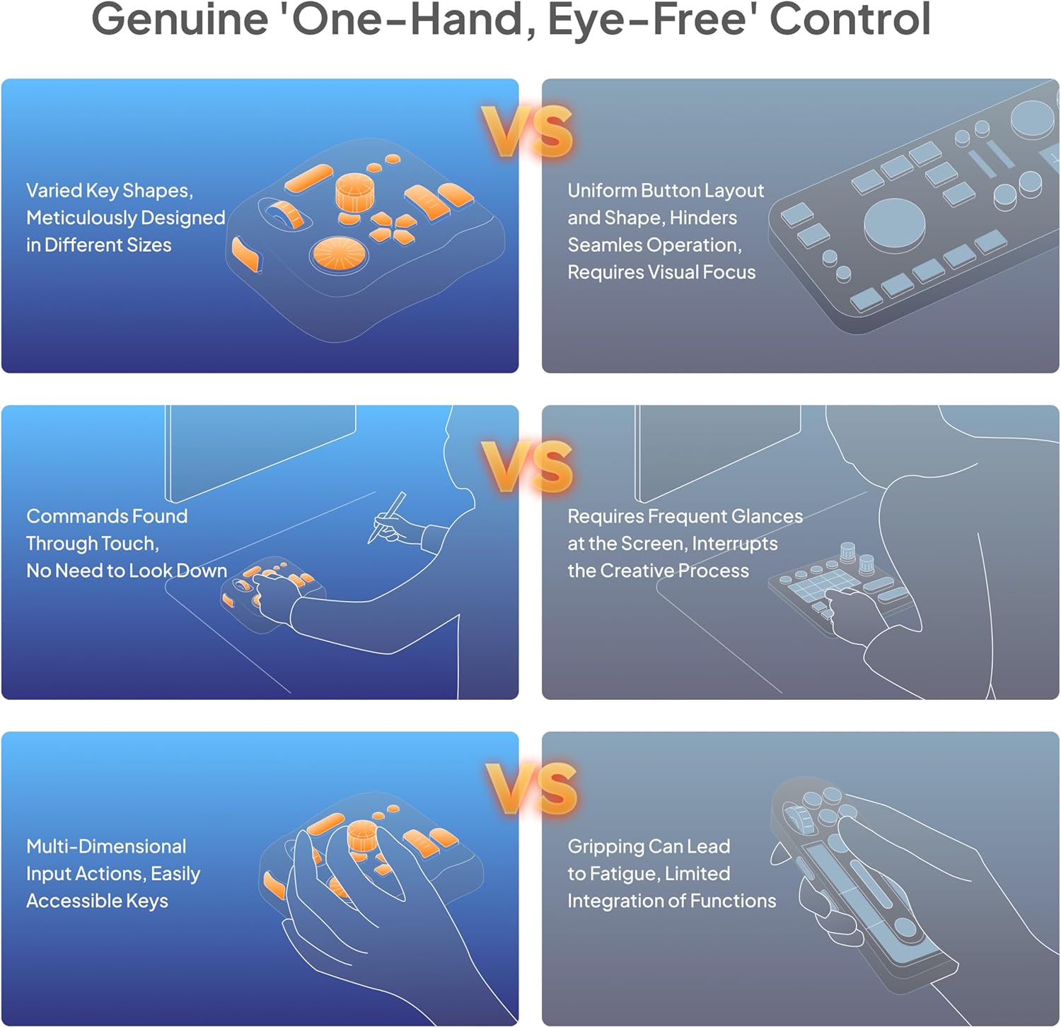 • Контролер от начално ниво за креативен софтуер, който цялостно ускорява и подобрява опита на създателите на съдържание при рисуване, ретуширане на снимки и подобряване на цветовете, както и редактиране на видео с корекция на цветовете. Той опростява творческия процес, правейки го по-ефективен и безпроблемен.