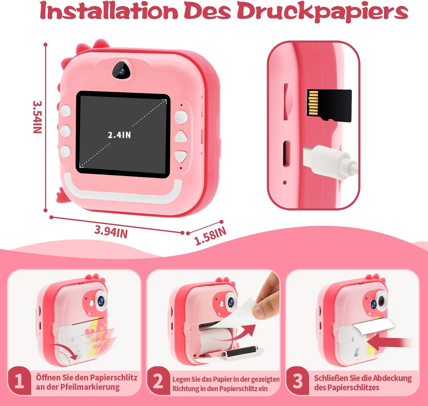 • Безопасен незабавен печат без мастило: Детската камера за незабавен печат използва технология за термопечат без мастило с висока скорост на печат, което е по-безопасно и по-комфортно за детската кожа. Комплектът включва 5 ролки хартия за печат, които могат да отпечатат над 300 изображения. Отпечатайте черно-бели снимки, които децата могат сами да оцветят, за да развият въображението и изкуството си на рисуване!
