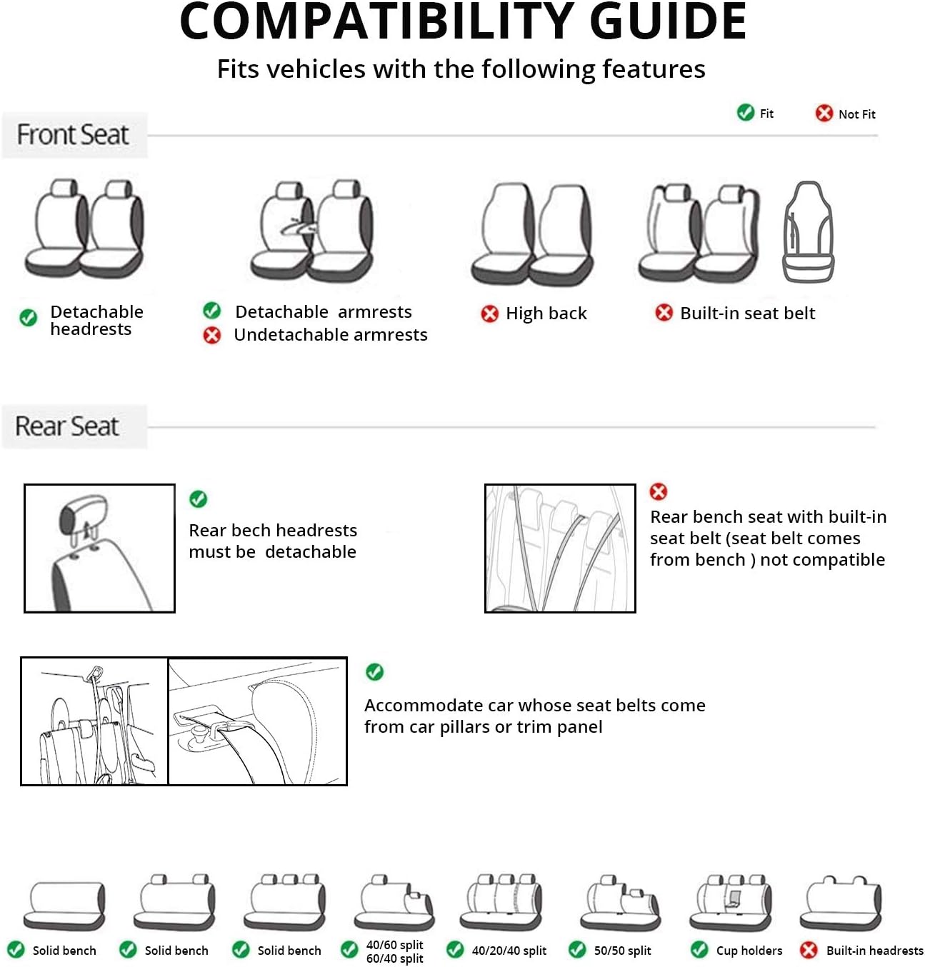 • Пакетът включва 2 отделни калъфа за облегалки за глава, 2 калъфа за облегалки за седалки, 2 калъфа за основа на седалките и 1 аксесоар за закачане на чанта. Този универсален калъф за автомобилна седалка е подходящ за повечето стандартни автомобили, включително седани, SUV-ове, камиони, микробуси и джипове. (Не е подходящ за седалки с несваляеми облегалки за глава или вградени предпазни колани). Специалните шевове позволяват разгръщане на страничните въздушни възглавници.